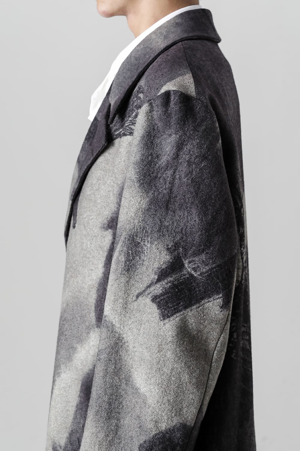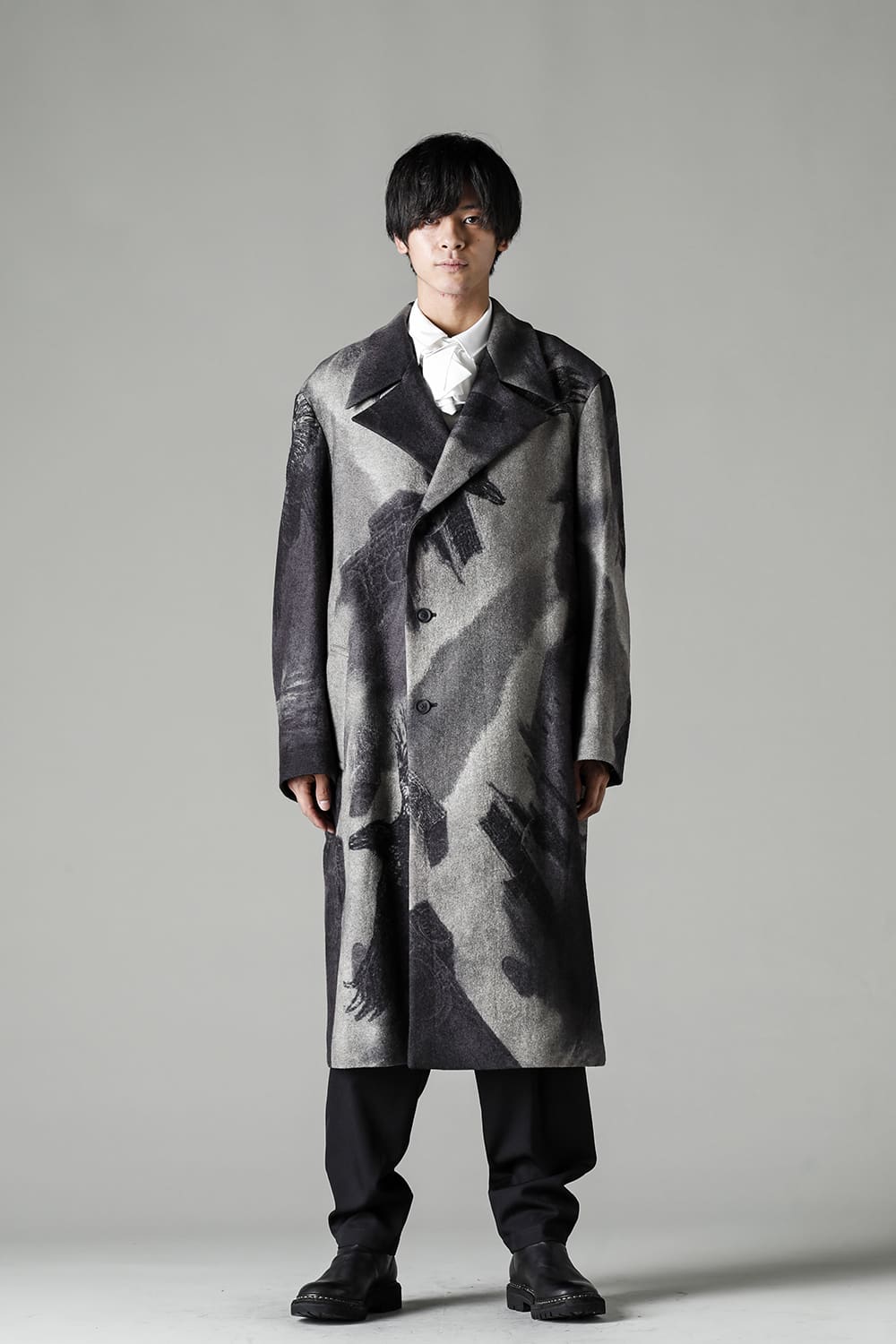 A three-button jacket with a large lapel and a bold print in subtle colors, creating a striking all-over print with outstanding impact. Although the product name is "jacket," it can actually be used as a coat. Based on the work of Polish painter ZDZISLAW BEKSINSKI, the pattern of crows drawn by clothing designer Hayashi Taishi is synthesized and printed on thick wool/polyamide blend compressed jersey. The silhouette is a comfortable, roomy silhouette that is typical of Yohji, and the design is based on a basic long jacket with no particular characteristics. This item offers a classic atmosphere typical of the 22-23AW ( autumn/winter ) collection.