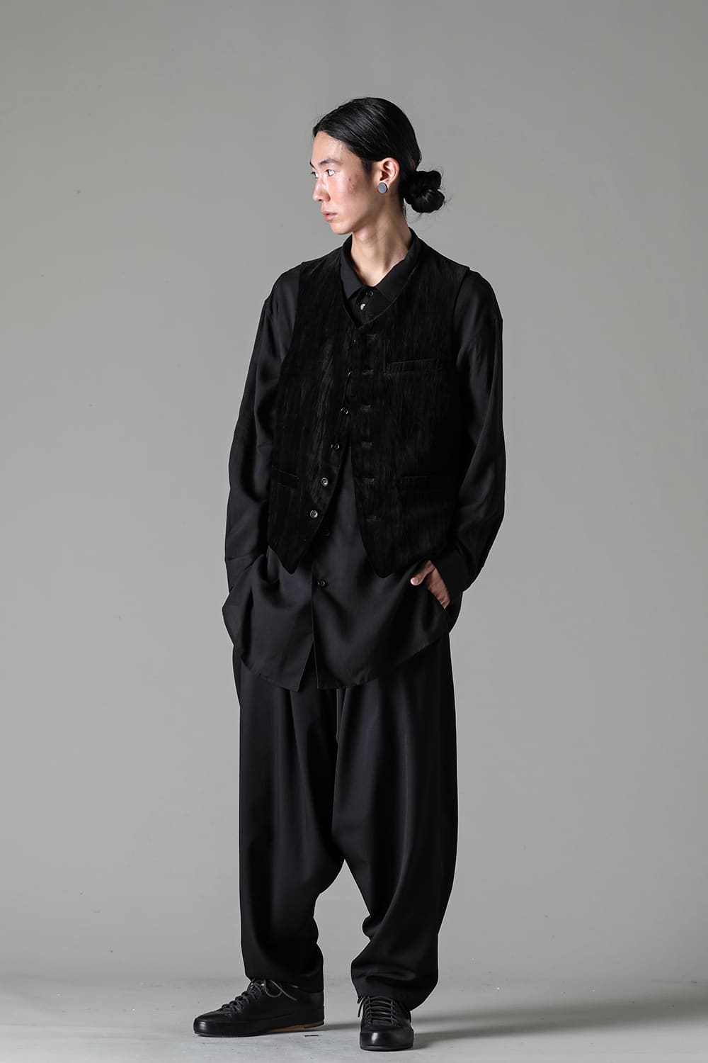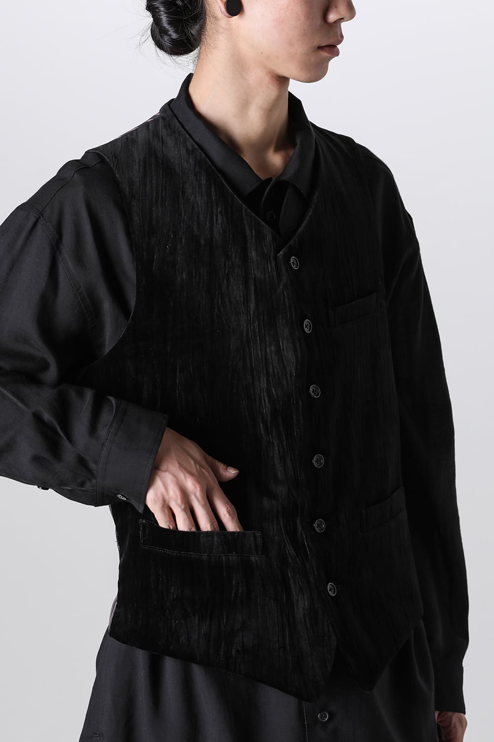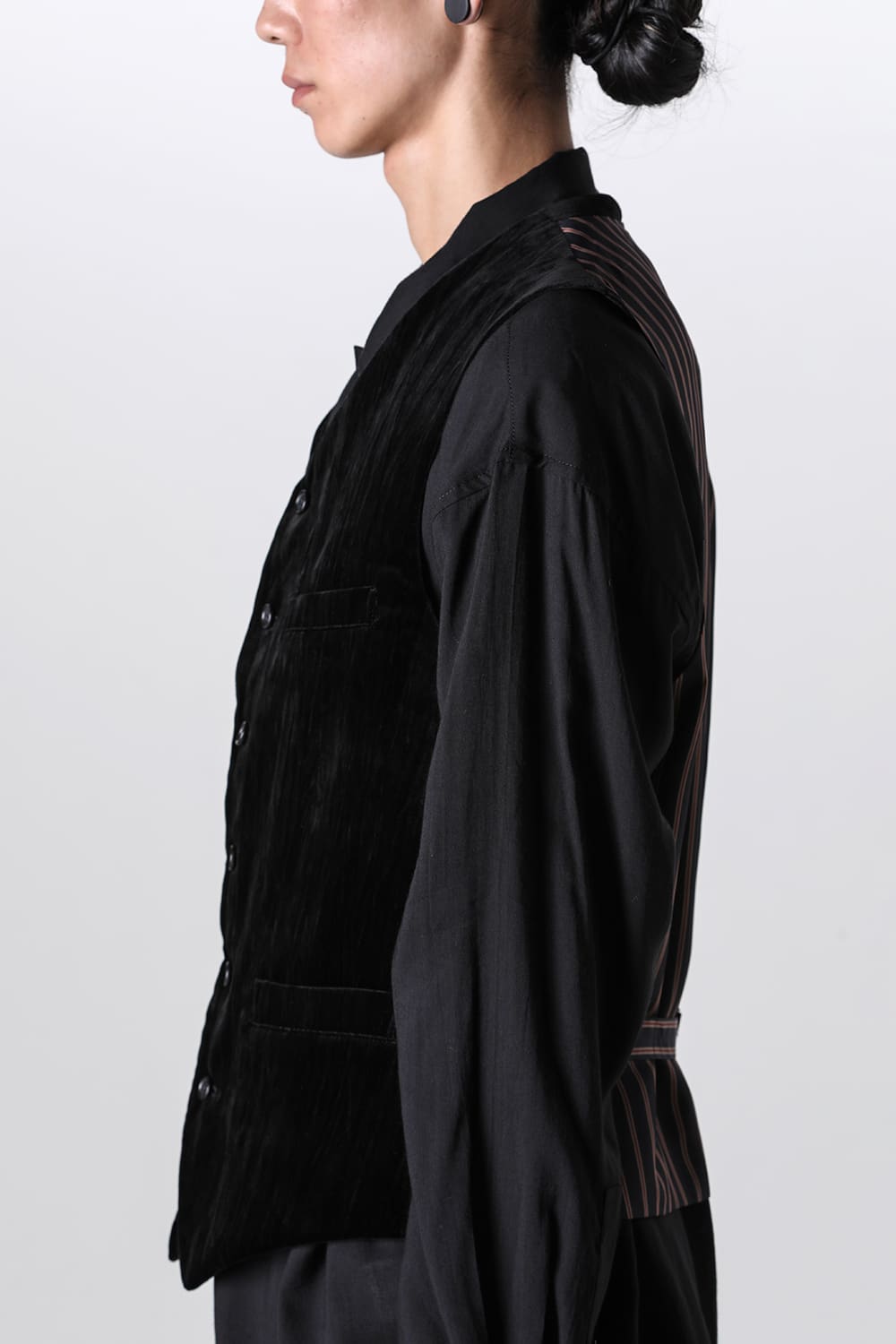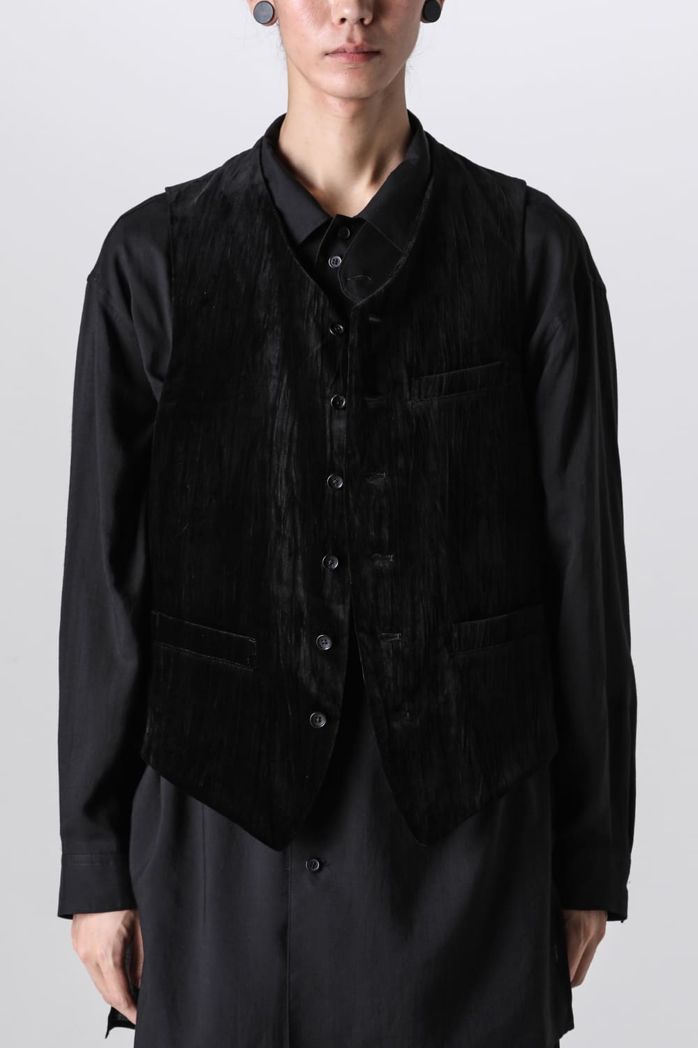 A six-button vest made of velvet, as worn in runway look 12.