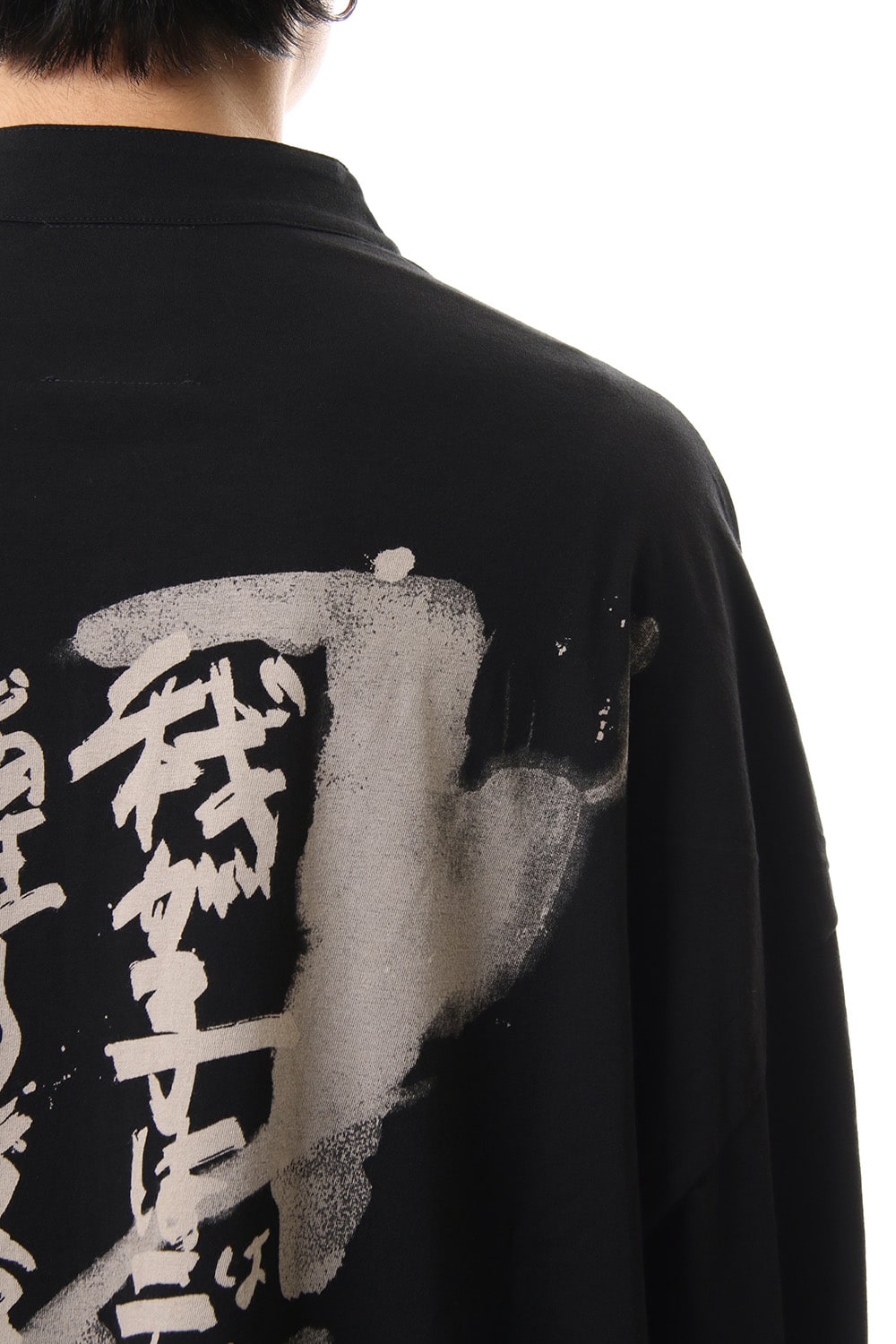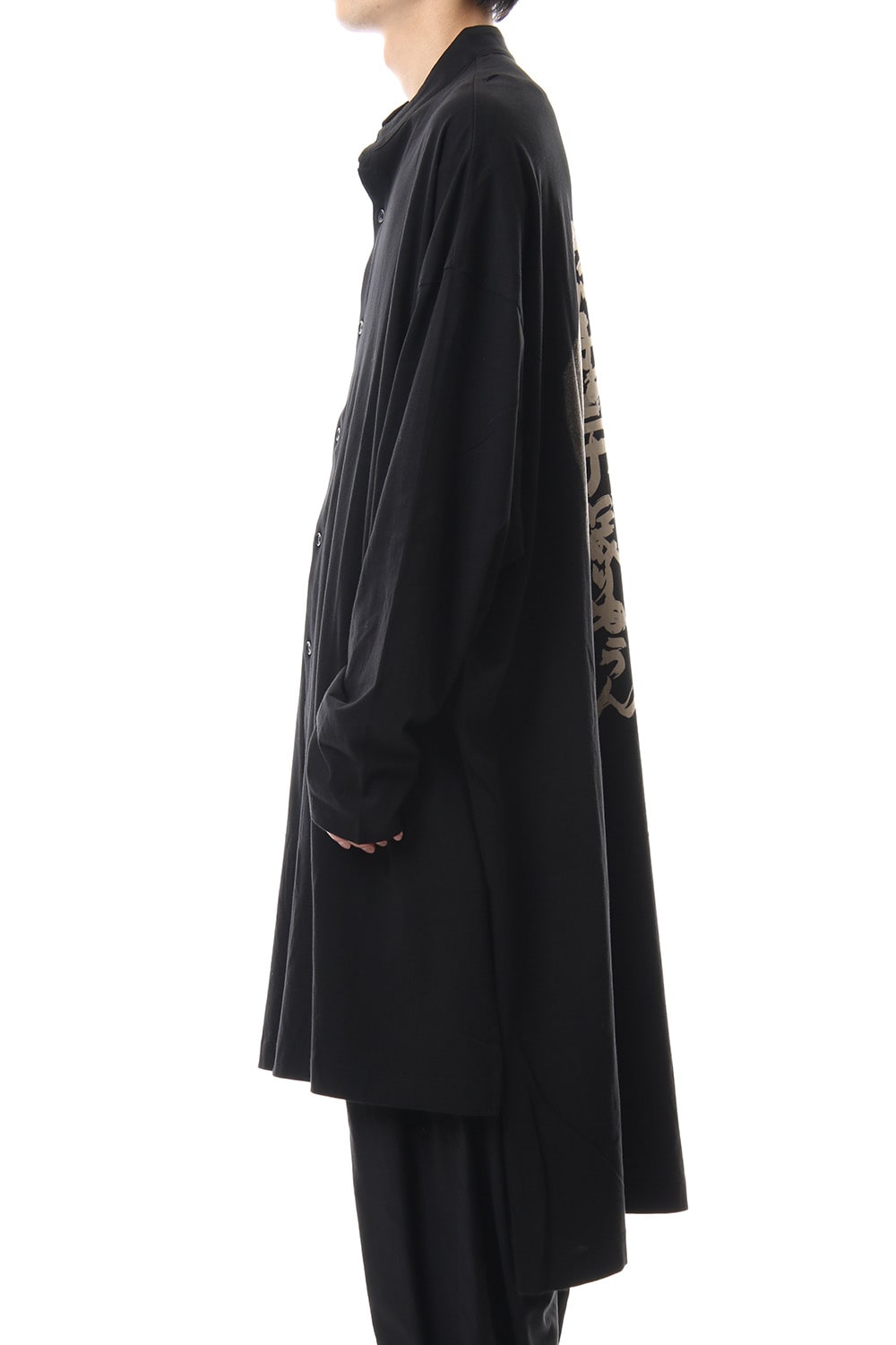 A jersey long shirt with a handwritten print on the back panel. The front and back are designed to be big and different in length, making this item easy to use as a jacket or like a cardigan.