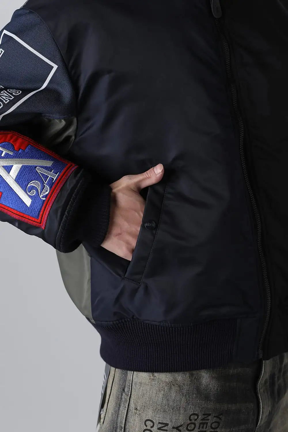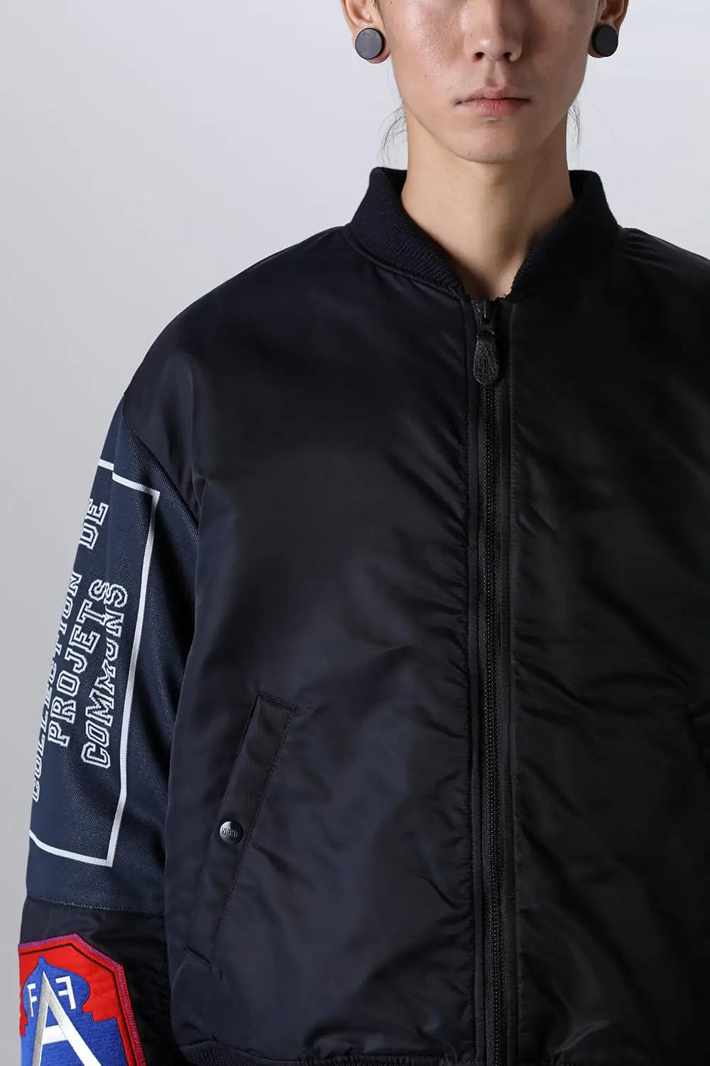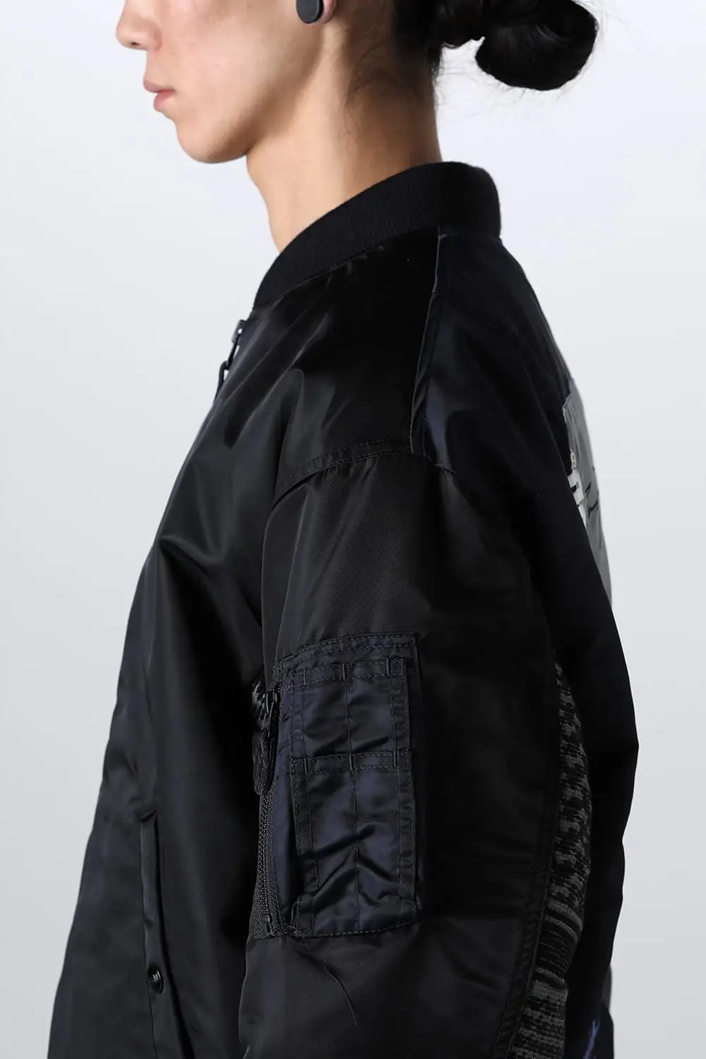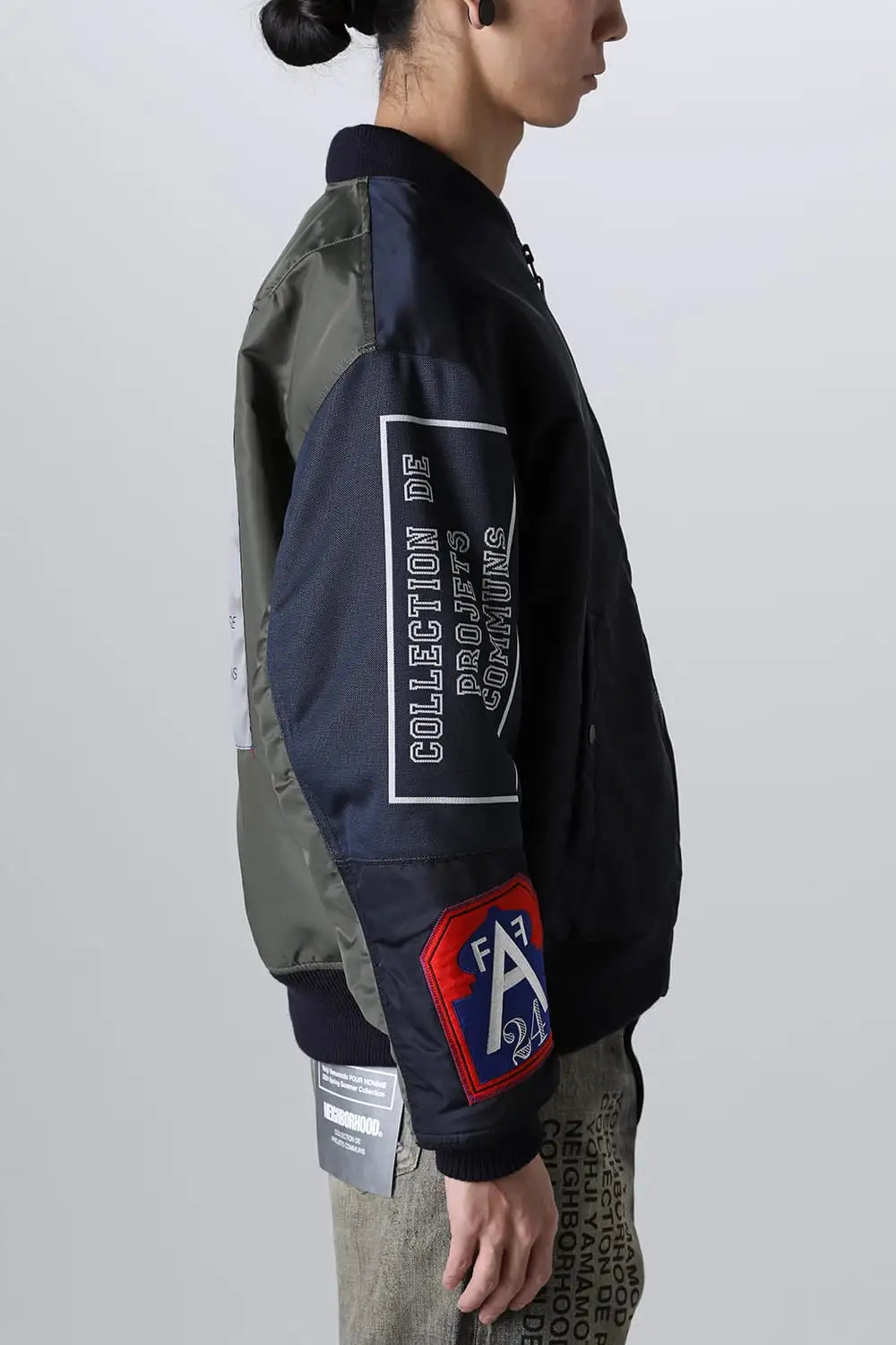 The MA-1 flight jacket features design elements throughout, from the main body to the ribbing and stitching.It is based on a recycled nylon twill body, and two different jacquard-woven original textiles created specifically for this collaboration are placed on both sleeves.