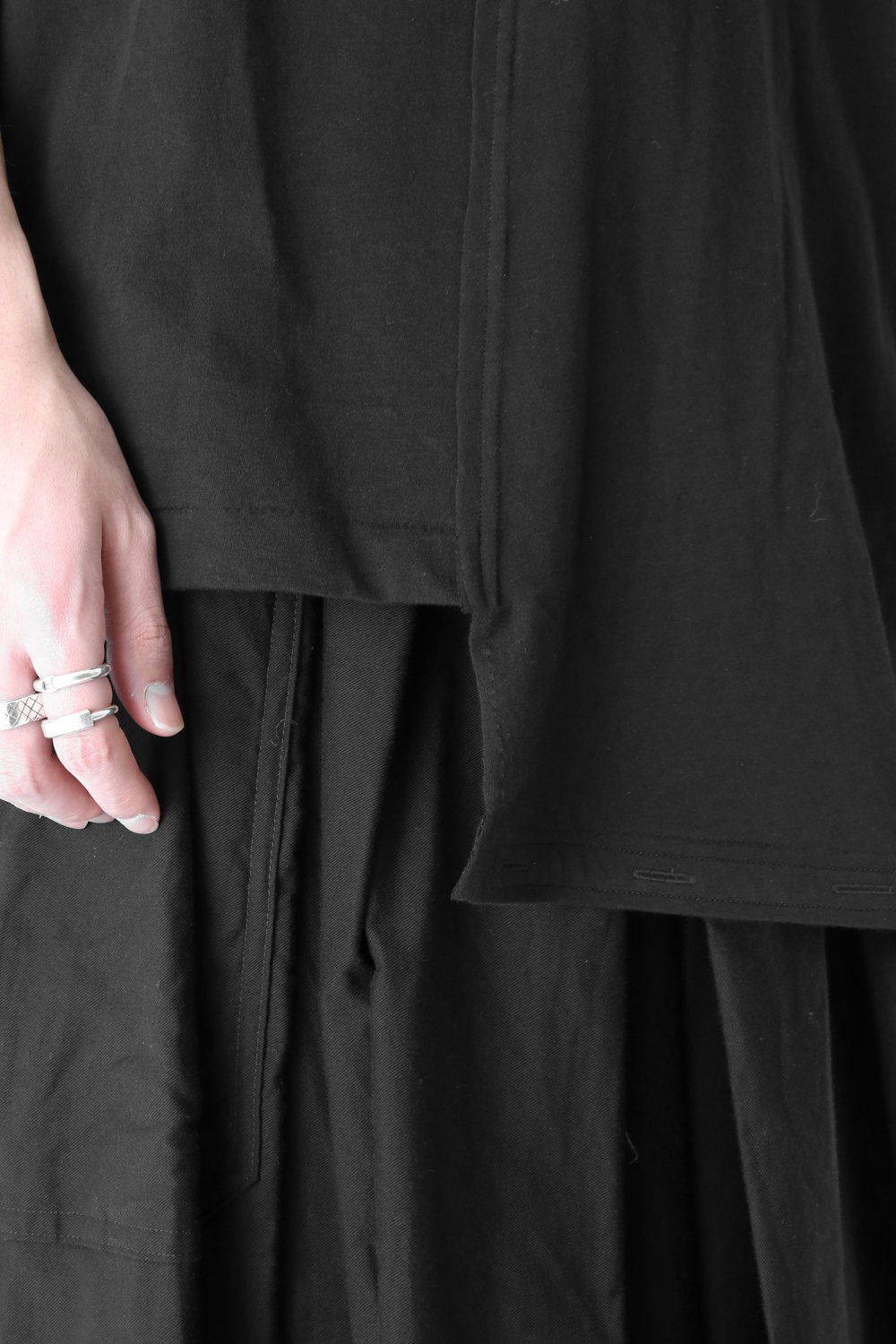 This short sleeve T shirt is characterized by an asymmetrical design like it is peeling off diagonally. it is developed as a classic piece in the Regulation line. Since it is possible to make drapes on the front part by using the button arranged at the hem, the high versatility that can be arranged according to the tops and pants is an attractive accent of this piece.