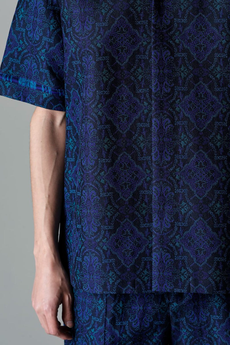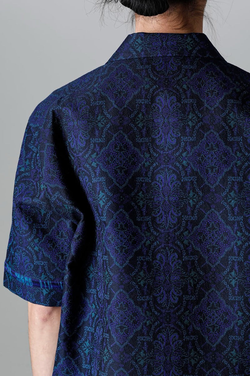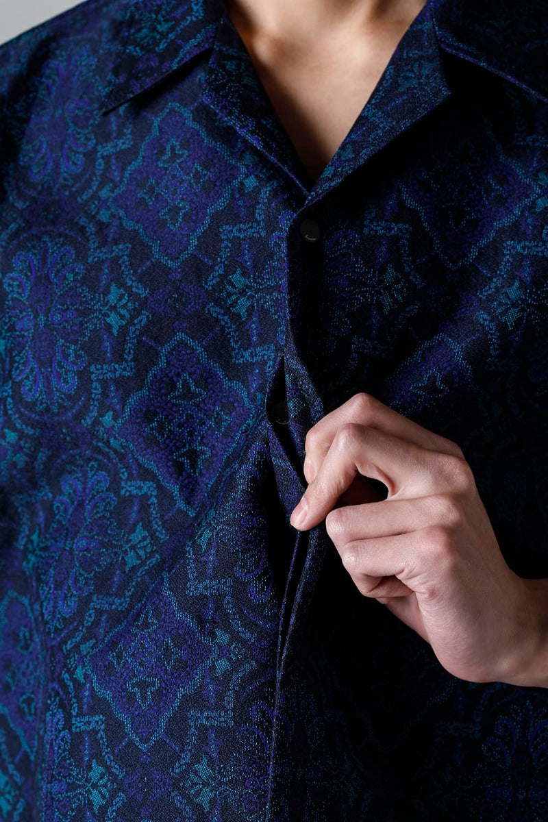 Open-collared shirt with winged collar made of original multi-colored jacquard fabric.