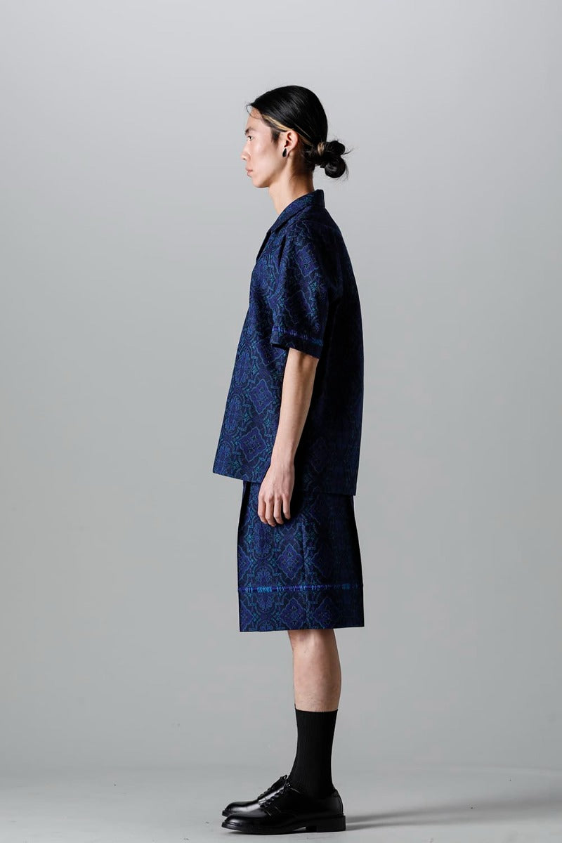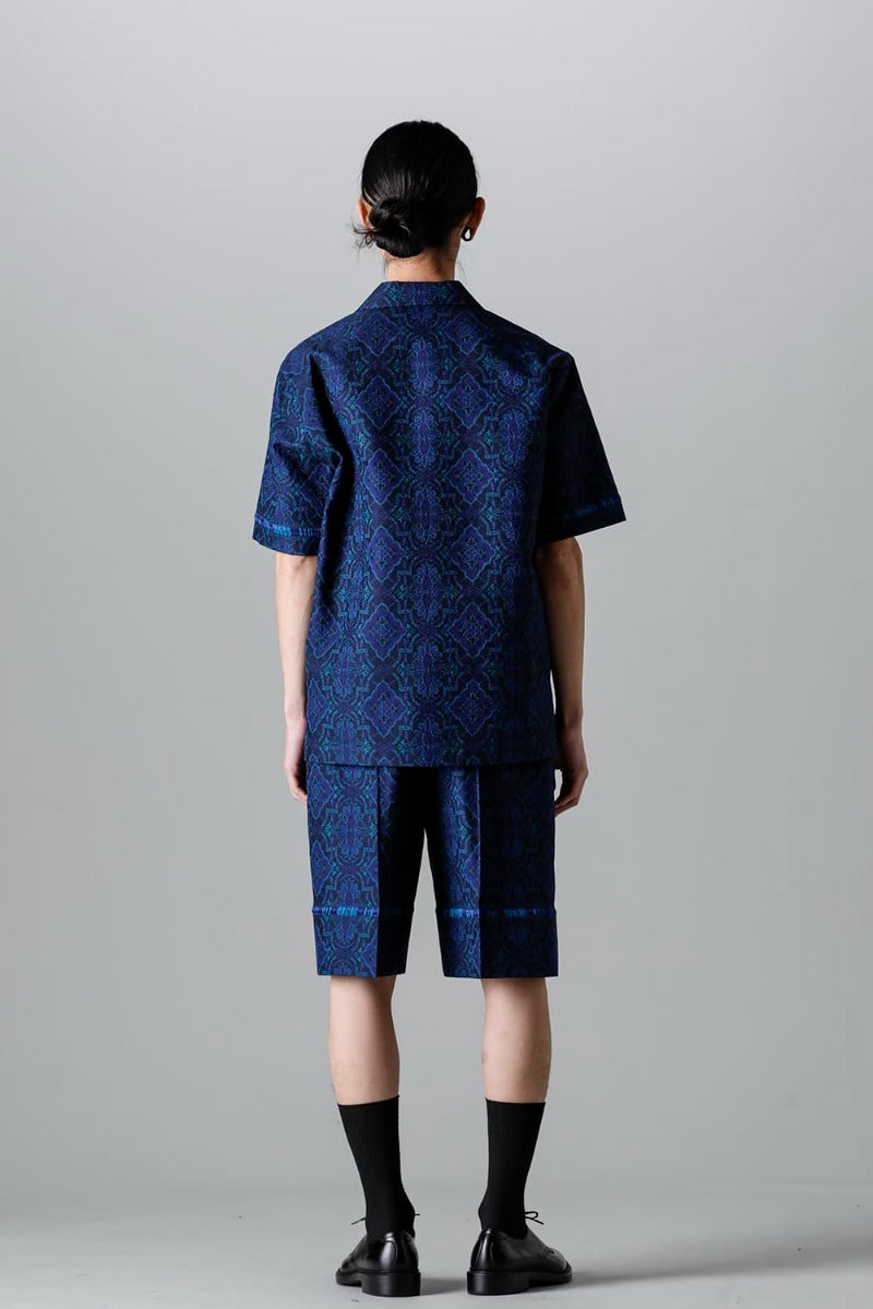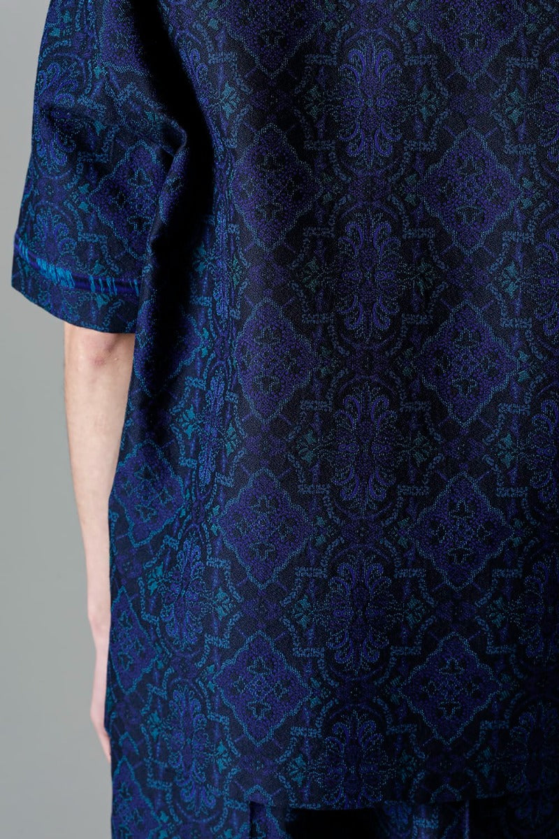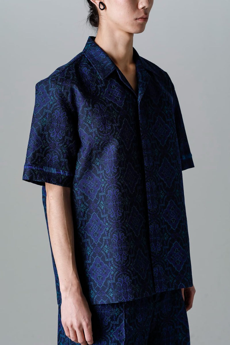 Open-collared shirt with winged collar made of original multi-colored jacquard fabric.