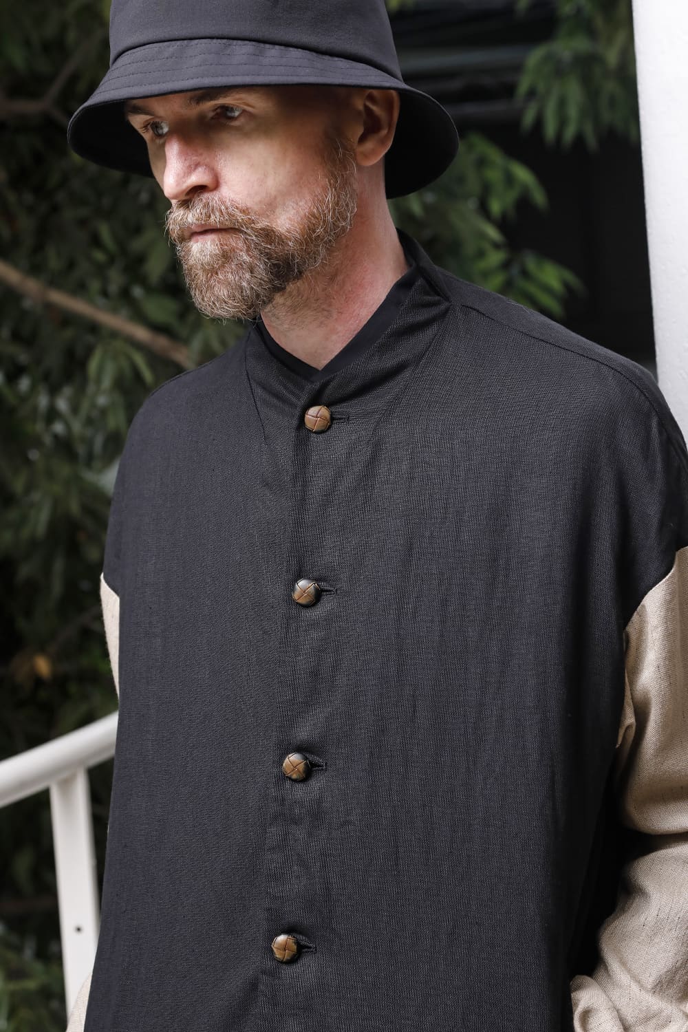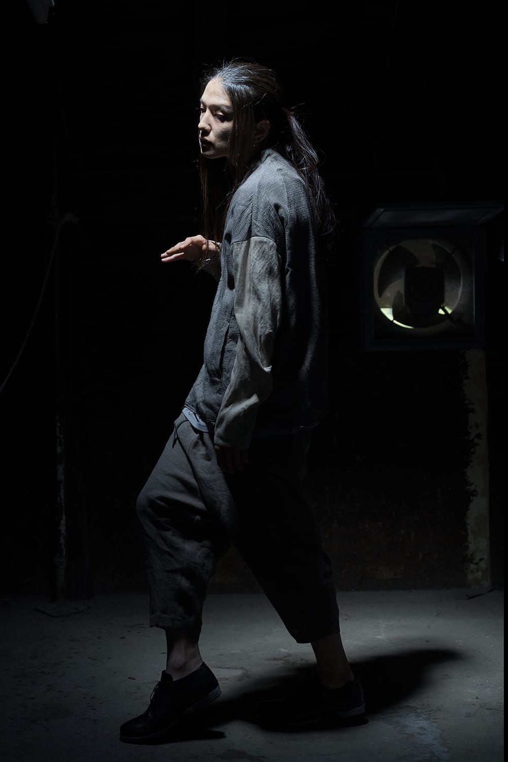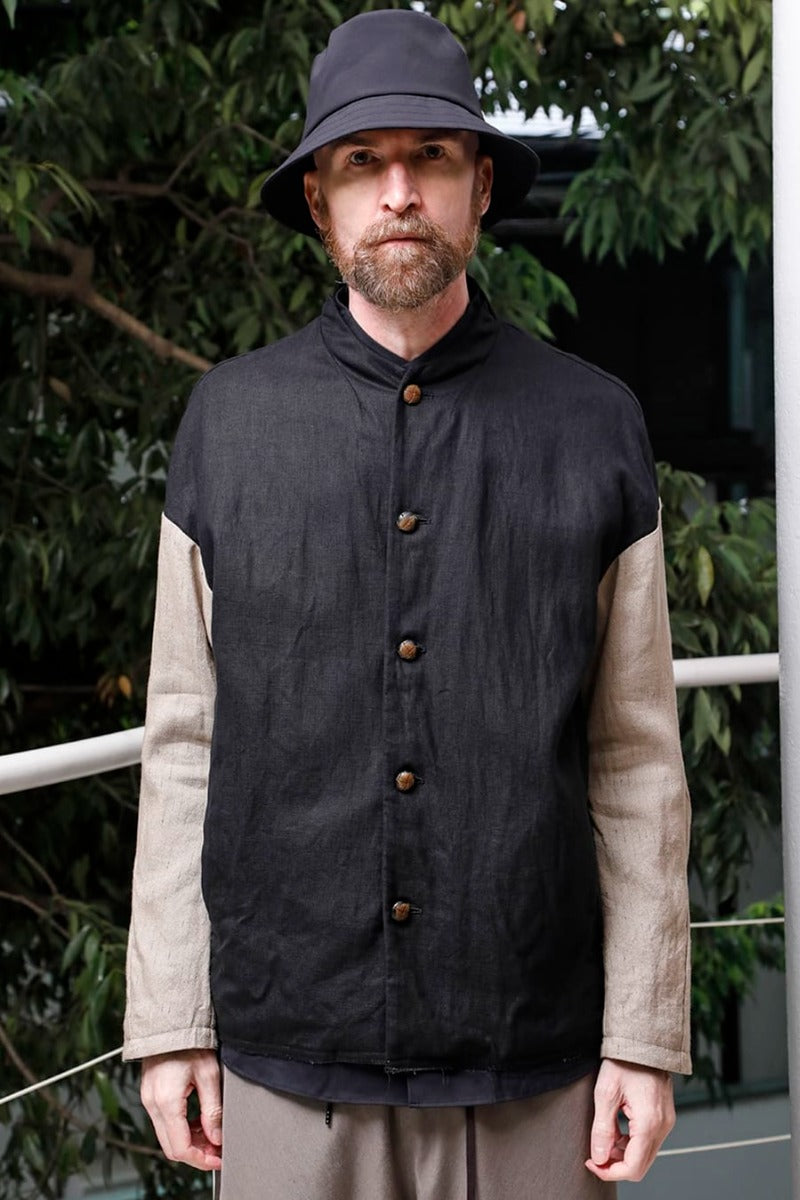 The outer fabric is a blend of linen, viscose, cotton, and nylon with an impressive uneven look using thicker yarns with knots by Faliero Sarti from Italy, and a switch between two types of linen fabrics.