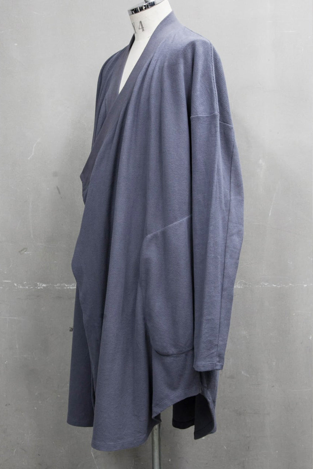 This item is characterized by a drape that spreads from the neck and a long vertical silhouette.