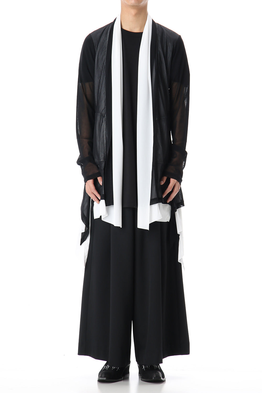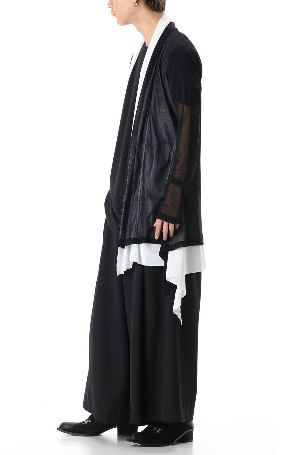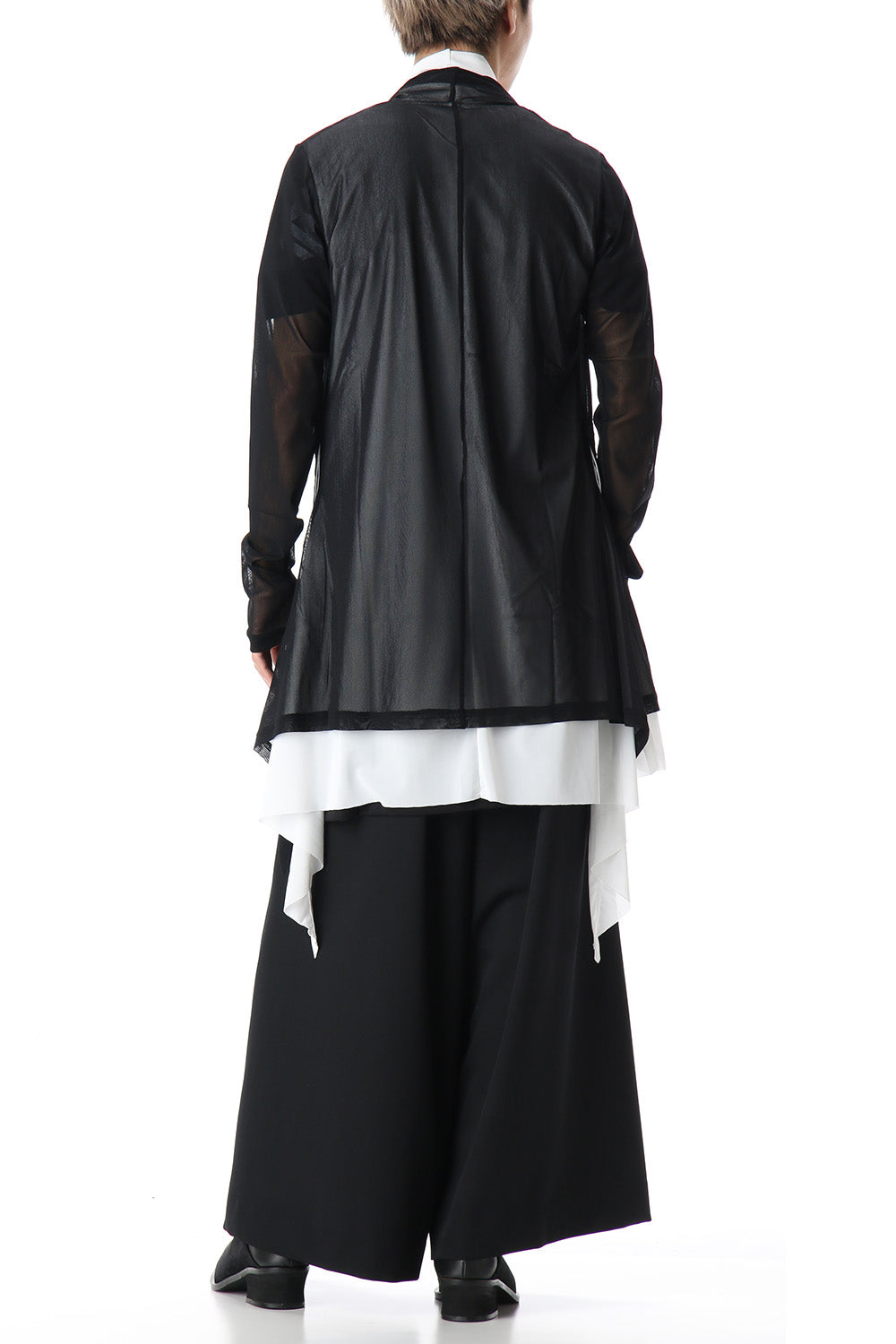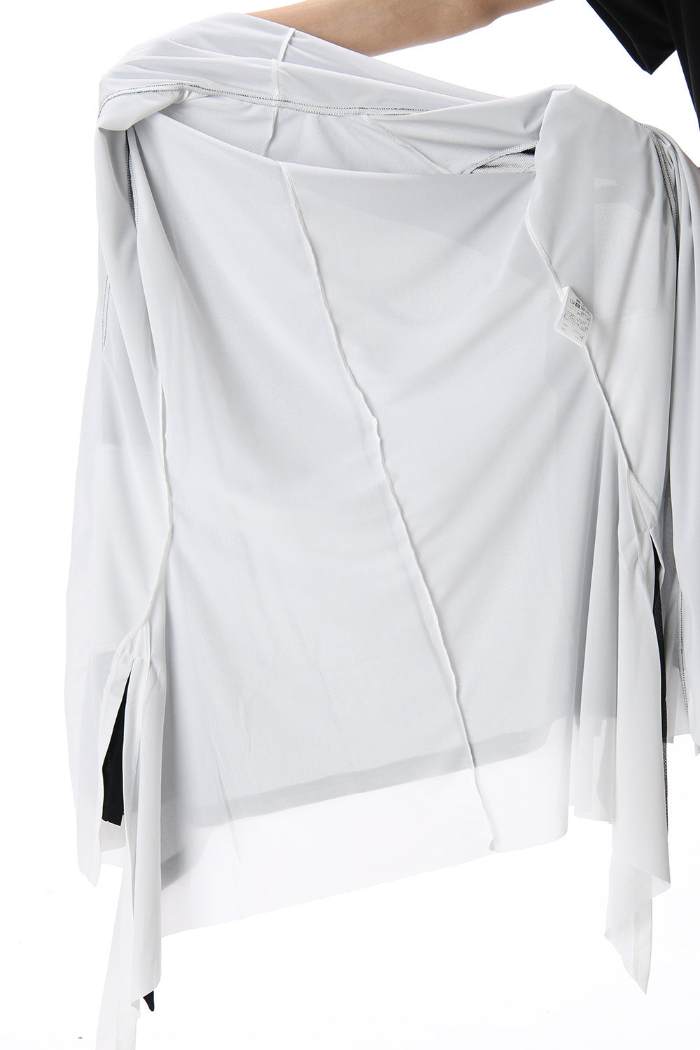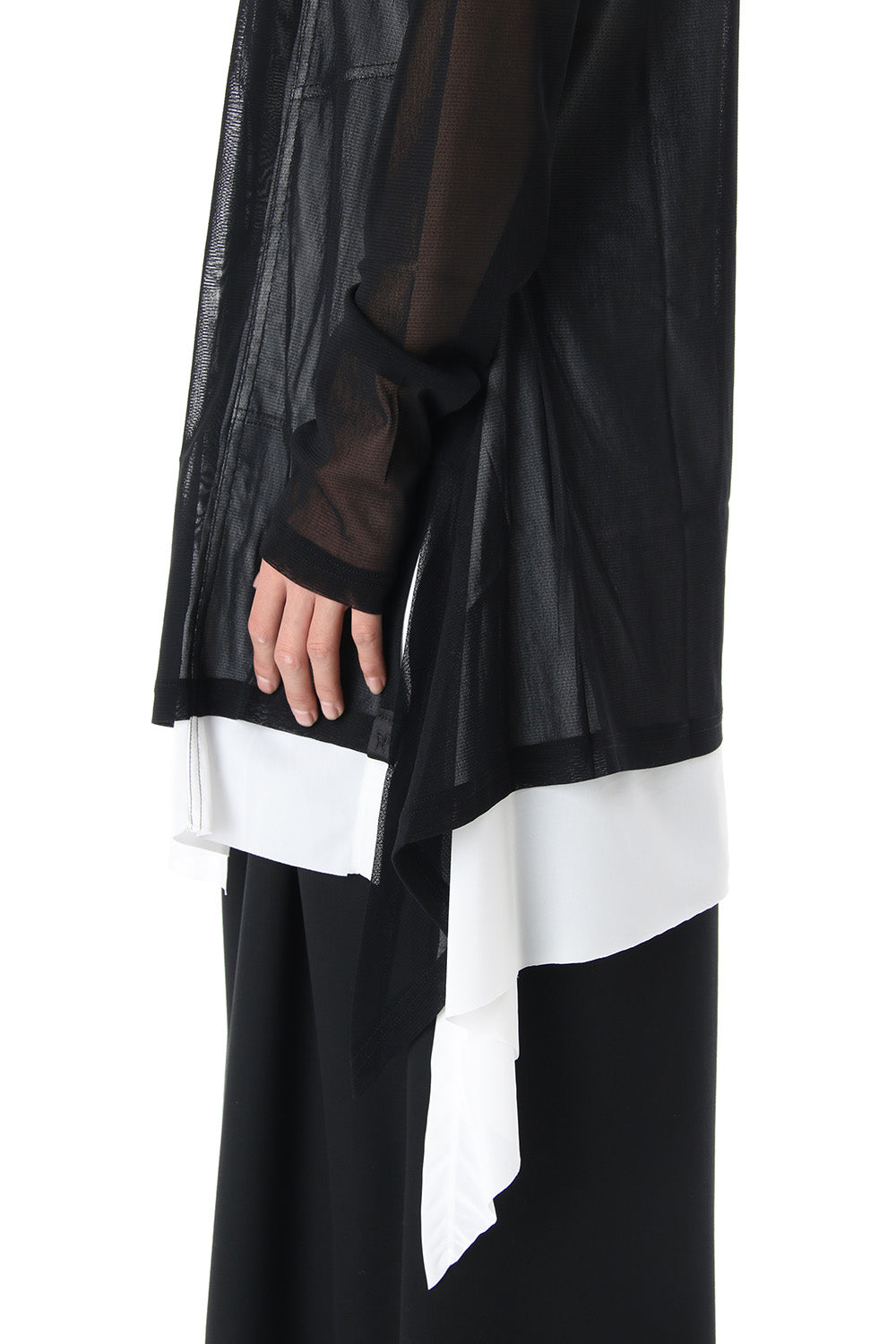 シースルー素材とツヤ感のある生地をレイヤードしサイドからフロントにかけてドレープ感の出る作品。