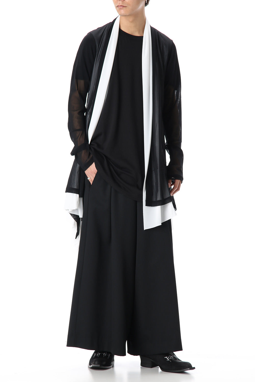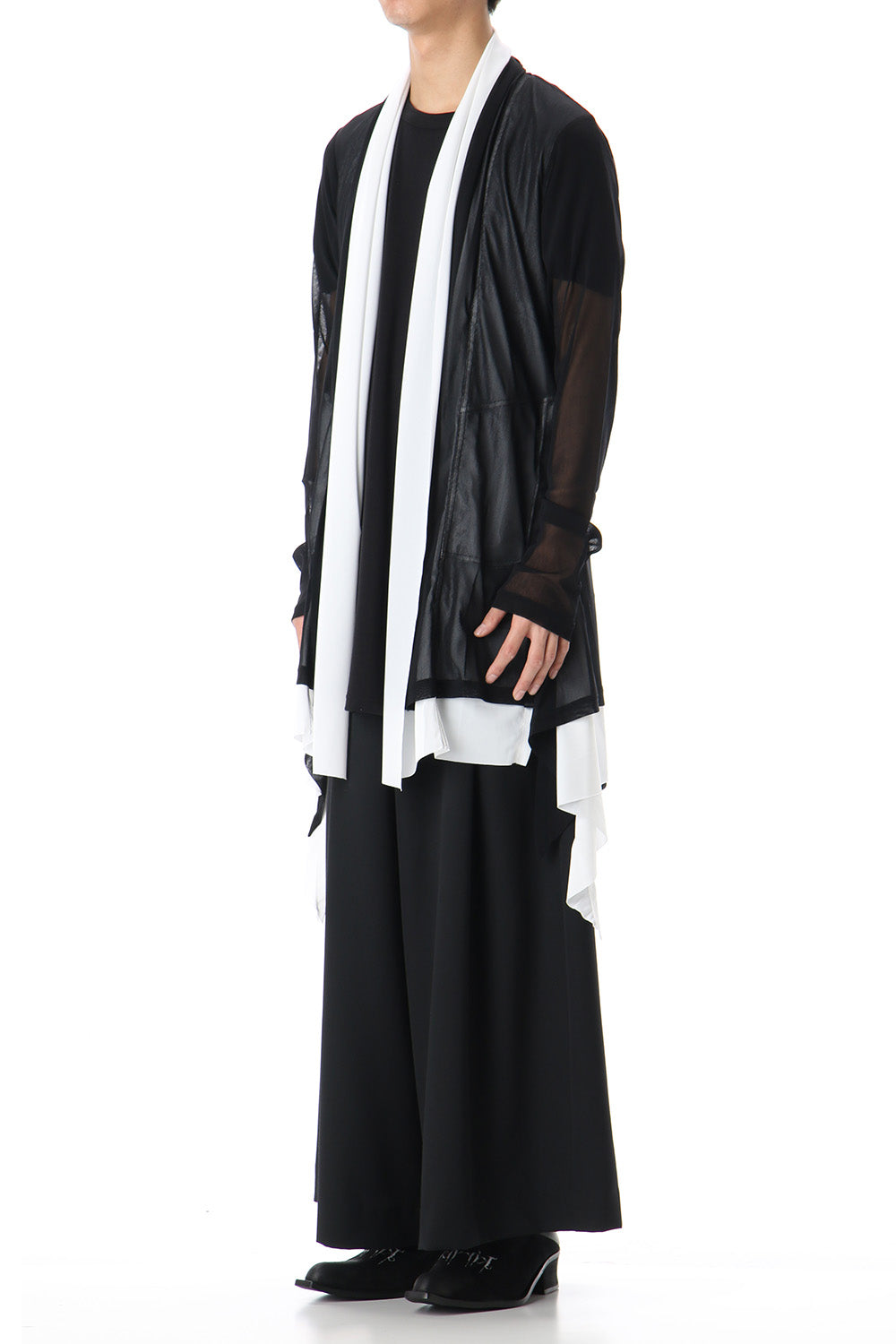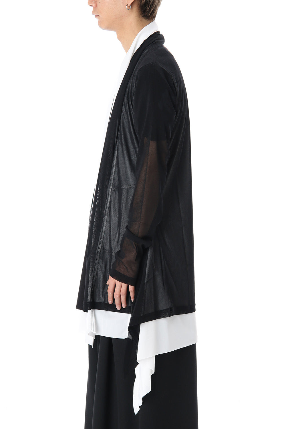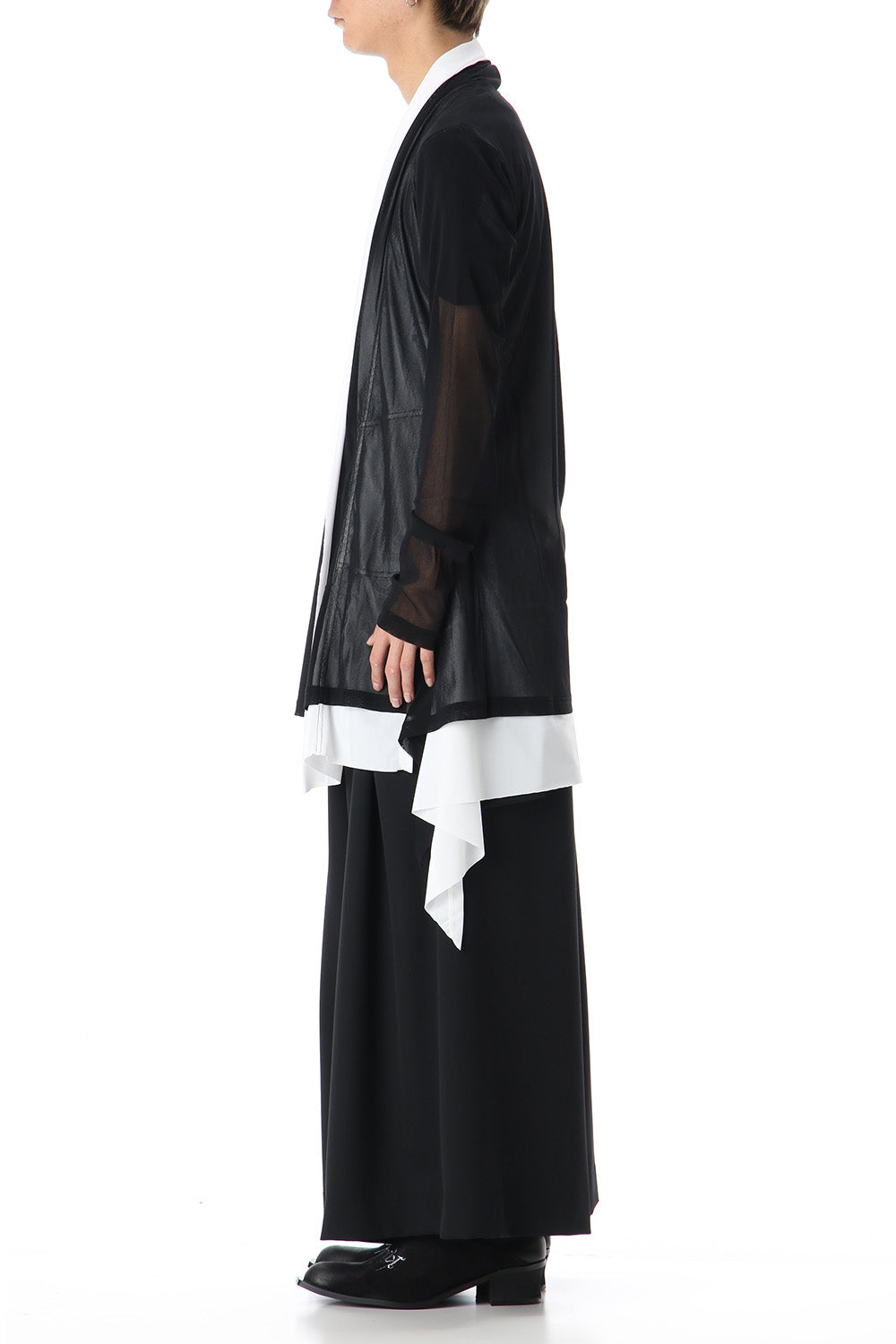 シースルー素材とツヤ感のある生地をレイヤードしサイドからフロントにかけてドレープ感の出る作品。