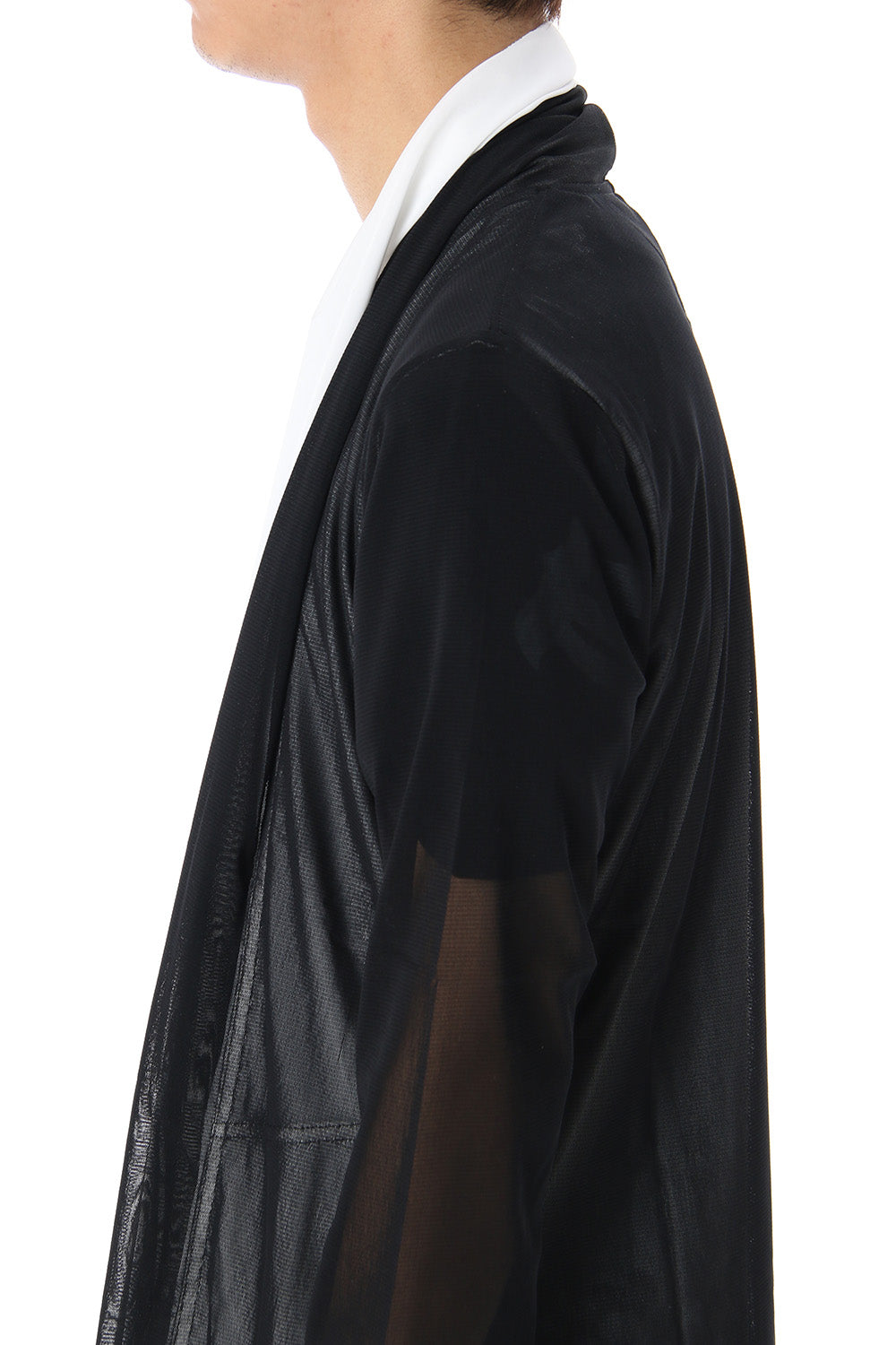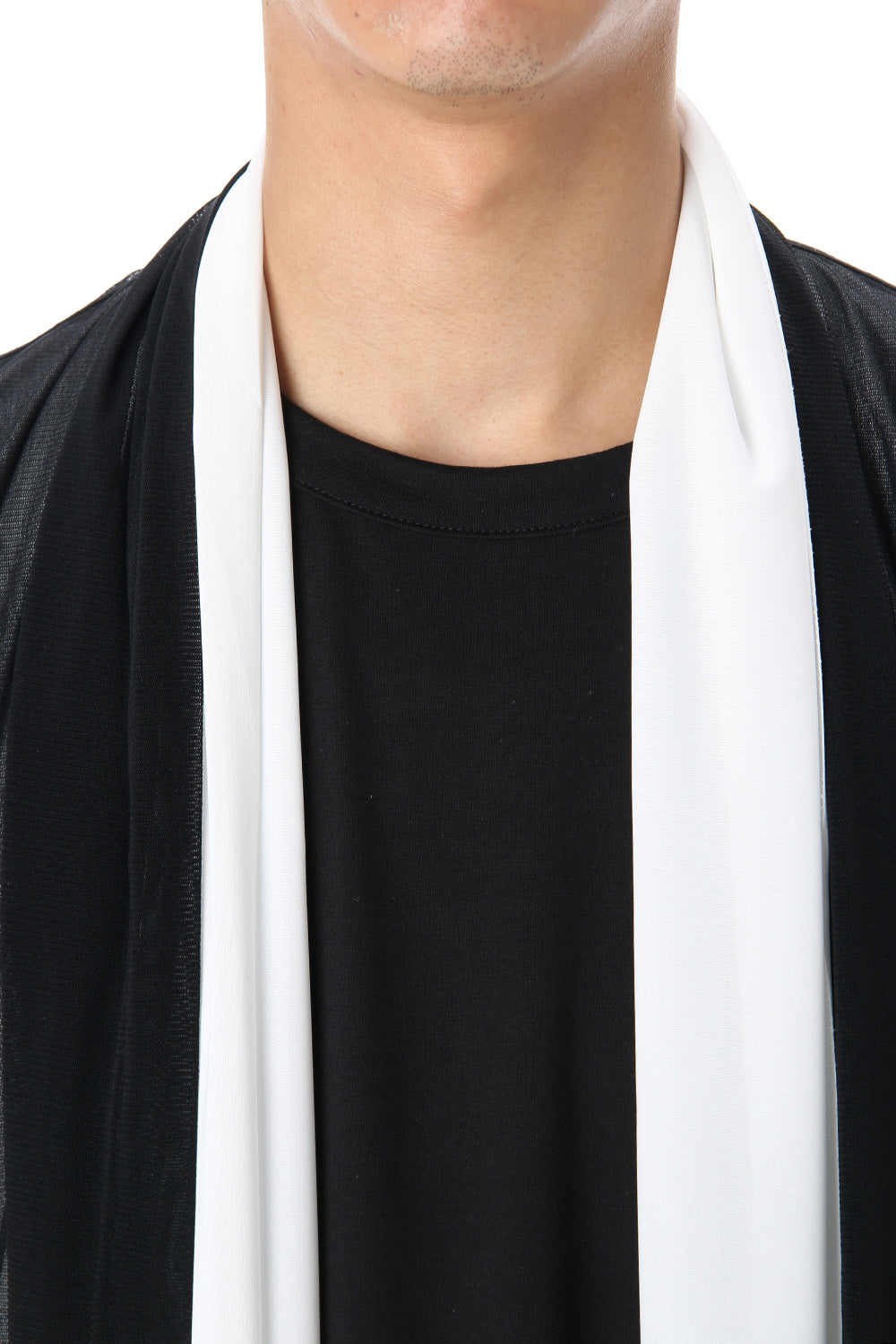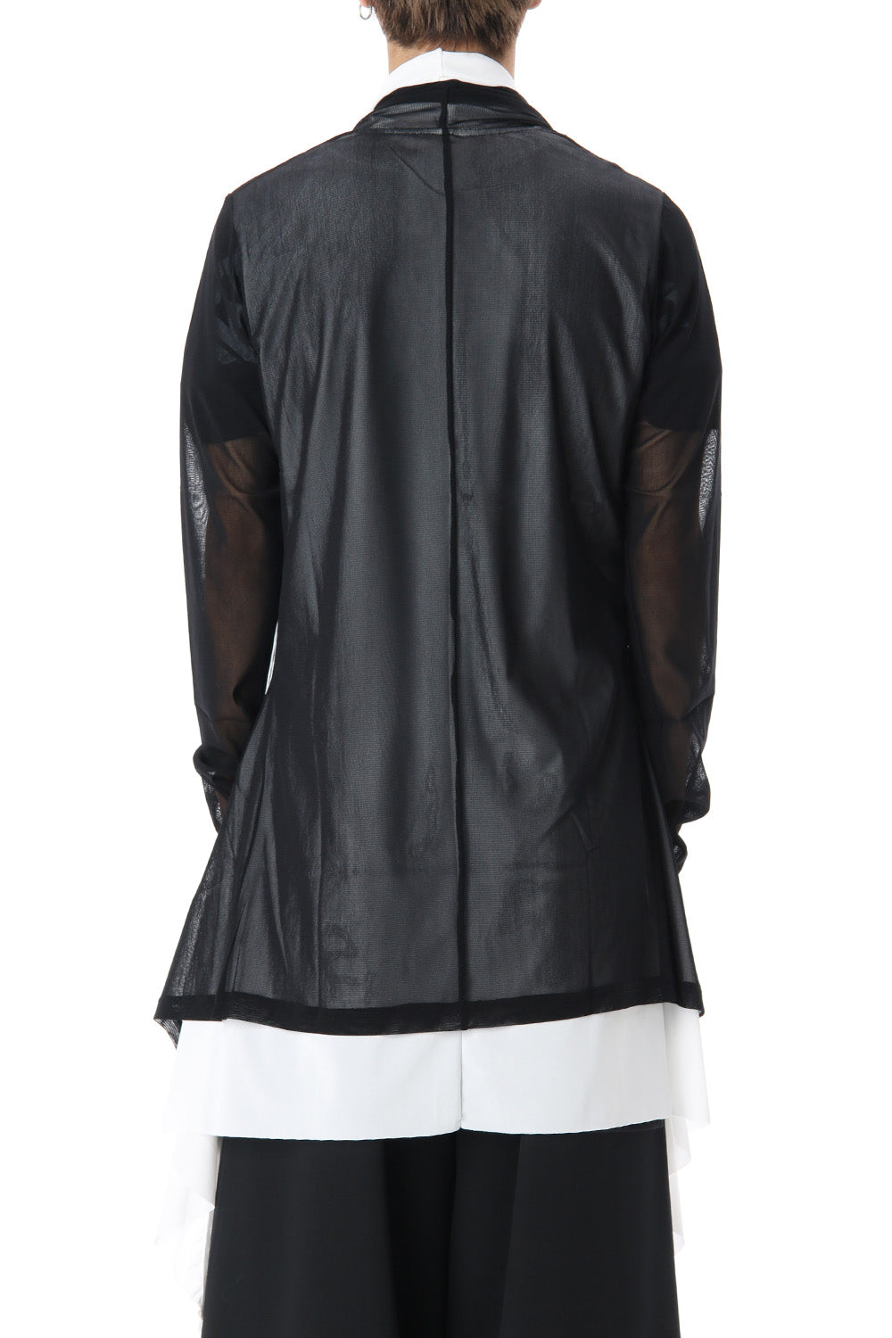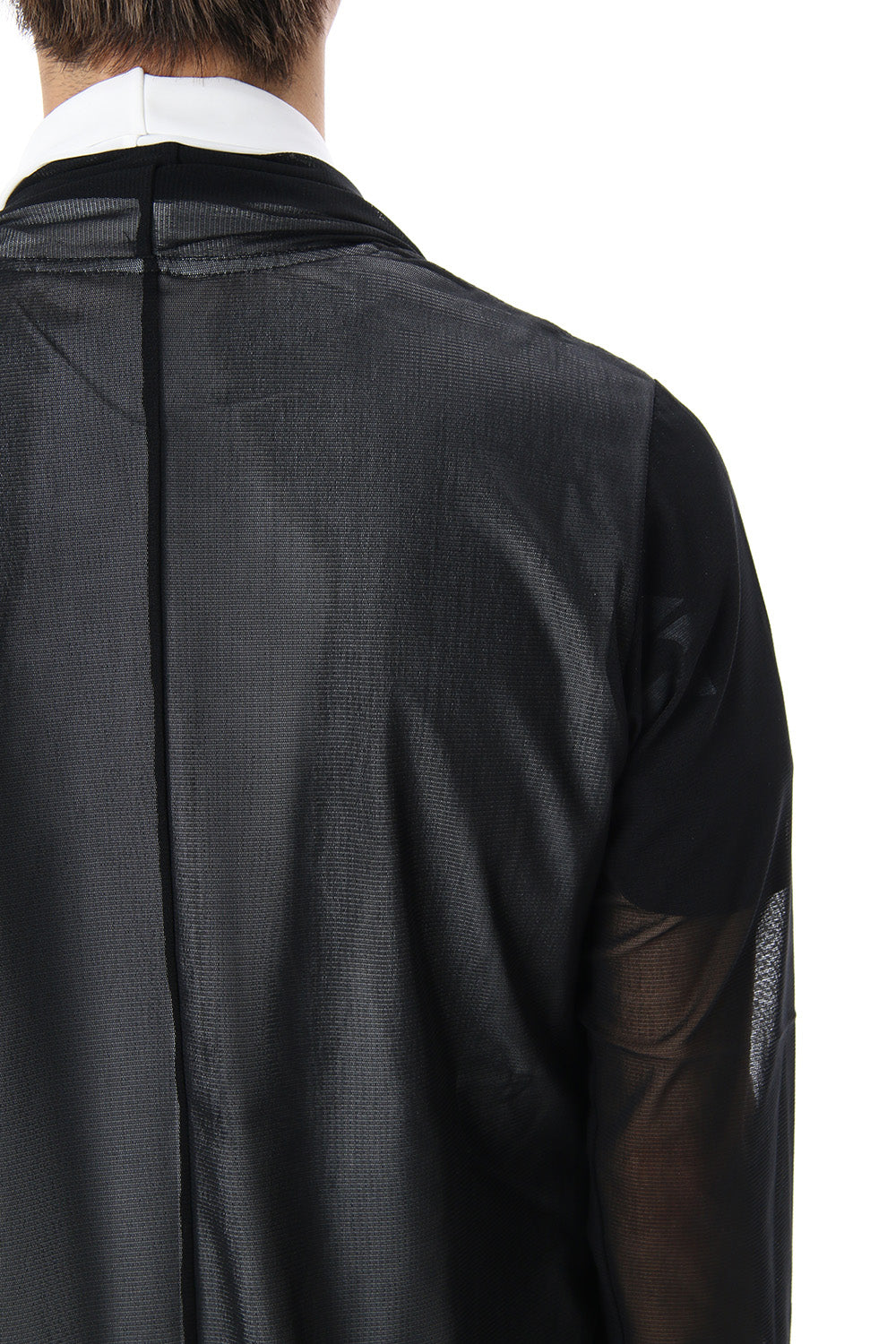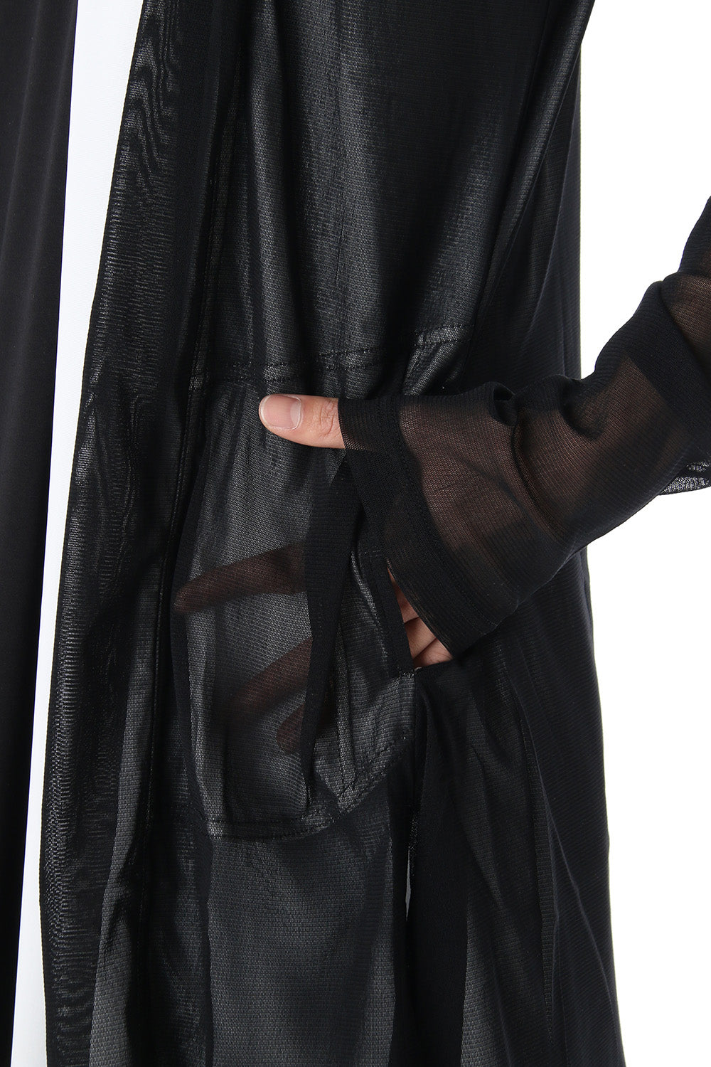 シースルー素材とツヤ感のある生地をレイヤードしサイドからフロントにかけてドレープ感の出る作品。