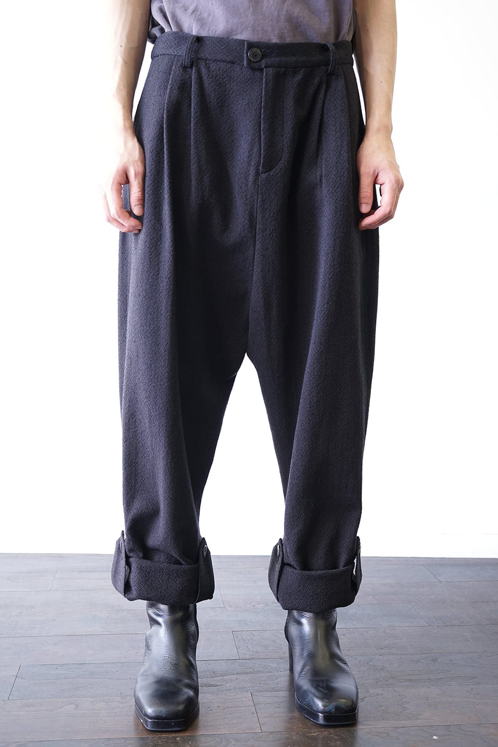 These pants are designed to be worn with the hem folded back and fastened with the side fastener.