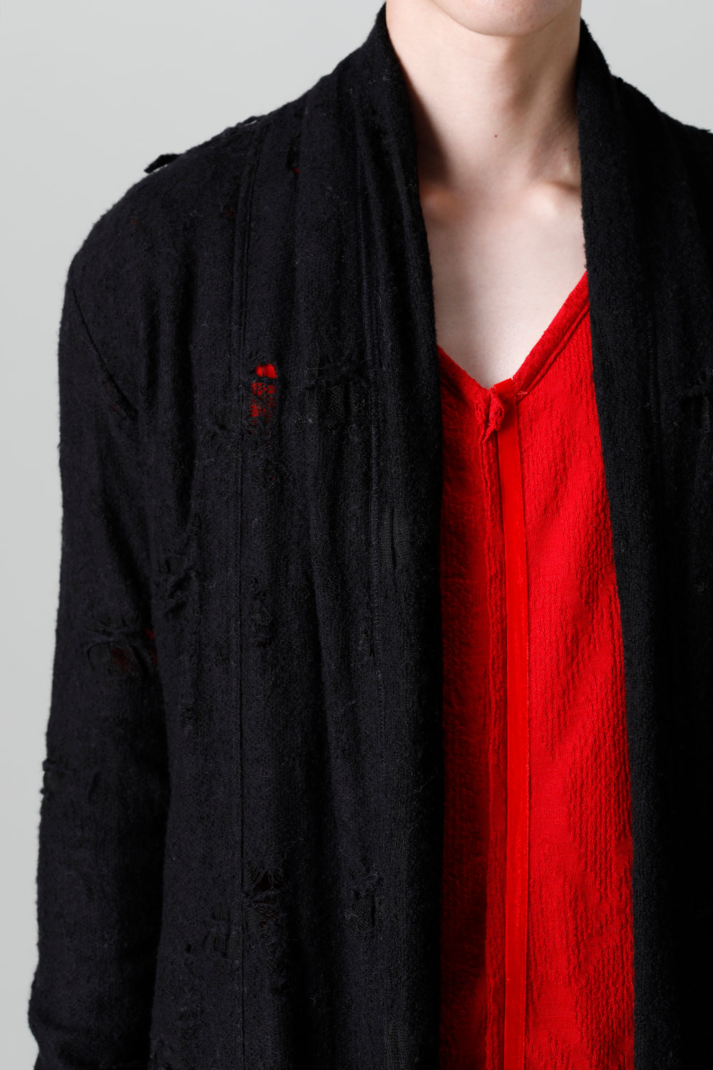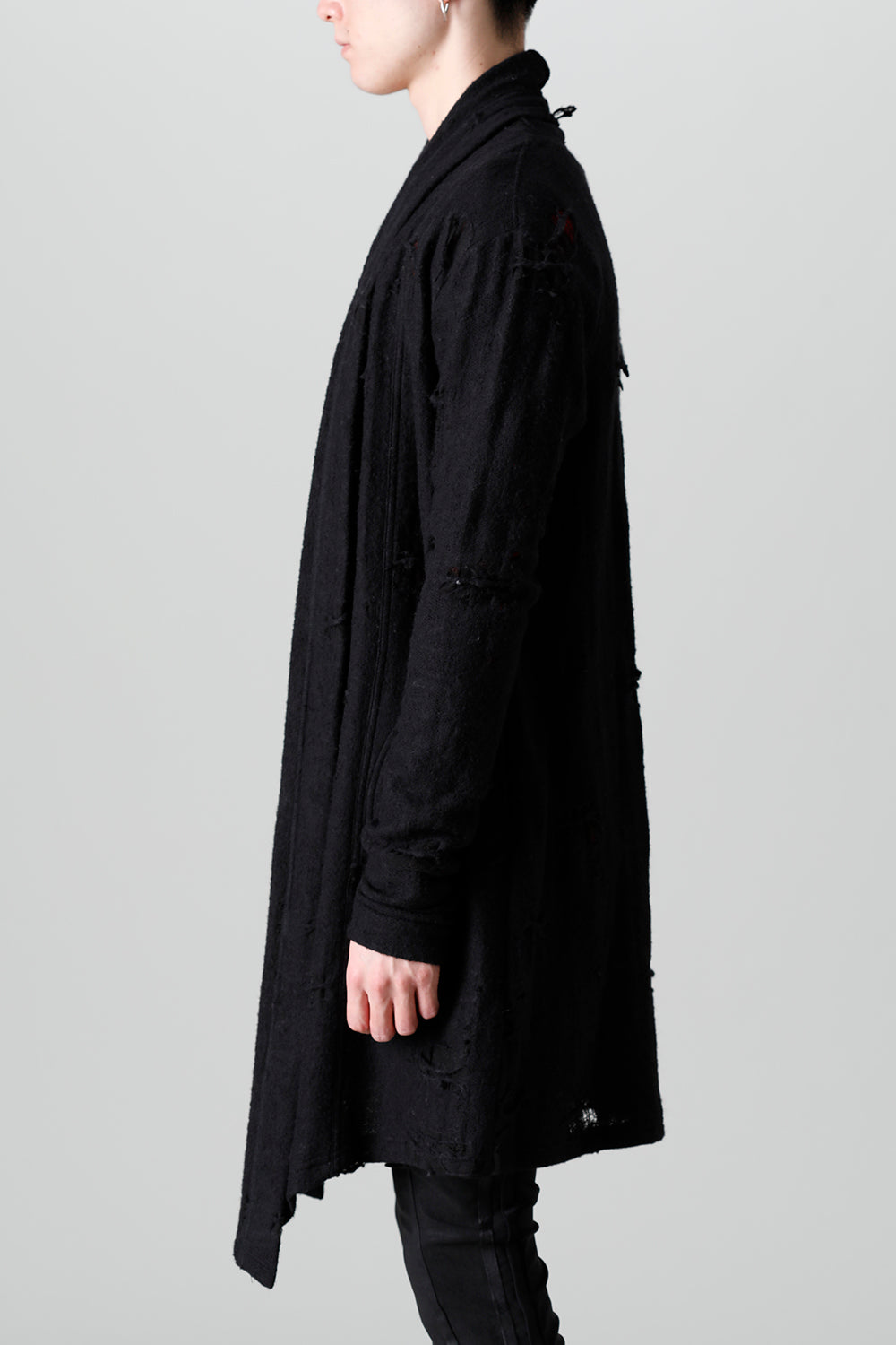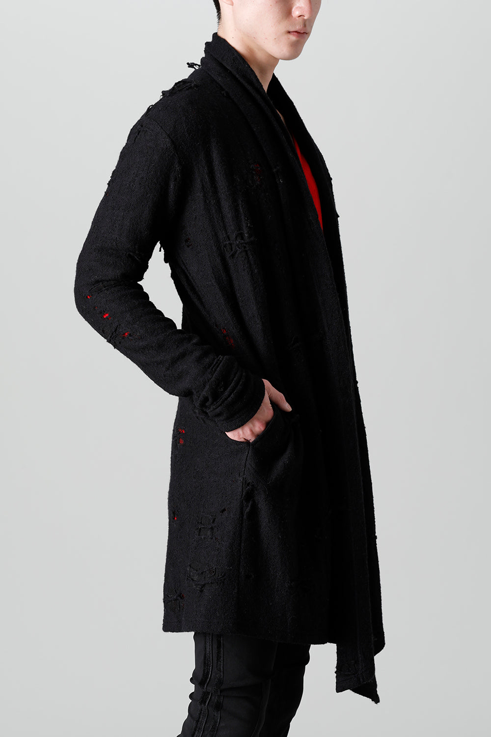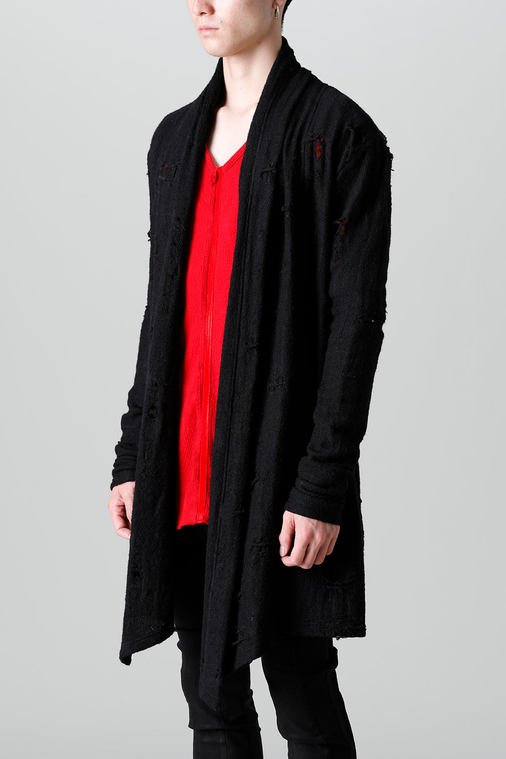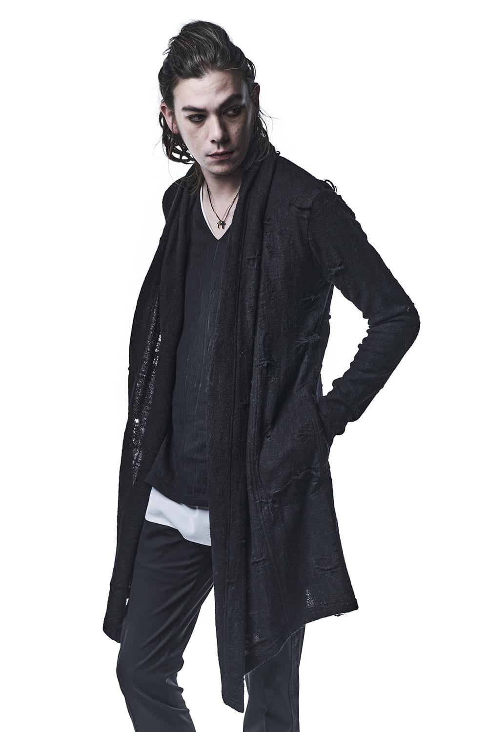 This shawl cardigan is the brand's standard shawl cardigan made of jacquard jersey fabric with damage processing everywhere.