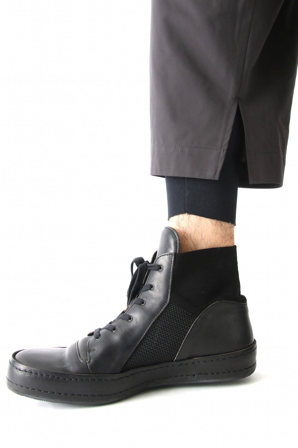 Made with a top silk 100% strong twist yarn, it has a dry touch, the dull glossiness and natural breathability of silk. The pattern is a deep rise wide silhouette layered pants. The hem has a 0.4mm layer made with limestone rubber with holes for a great air circulation, and bonded to a warp knitting jersey.