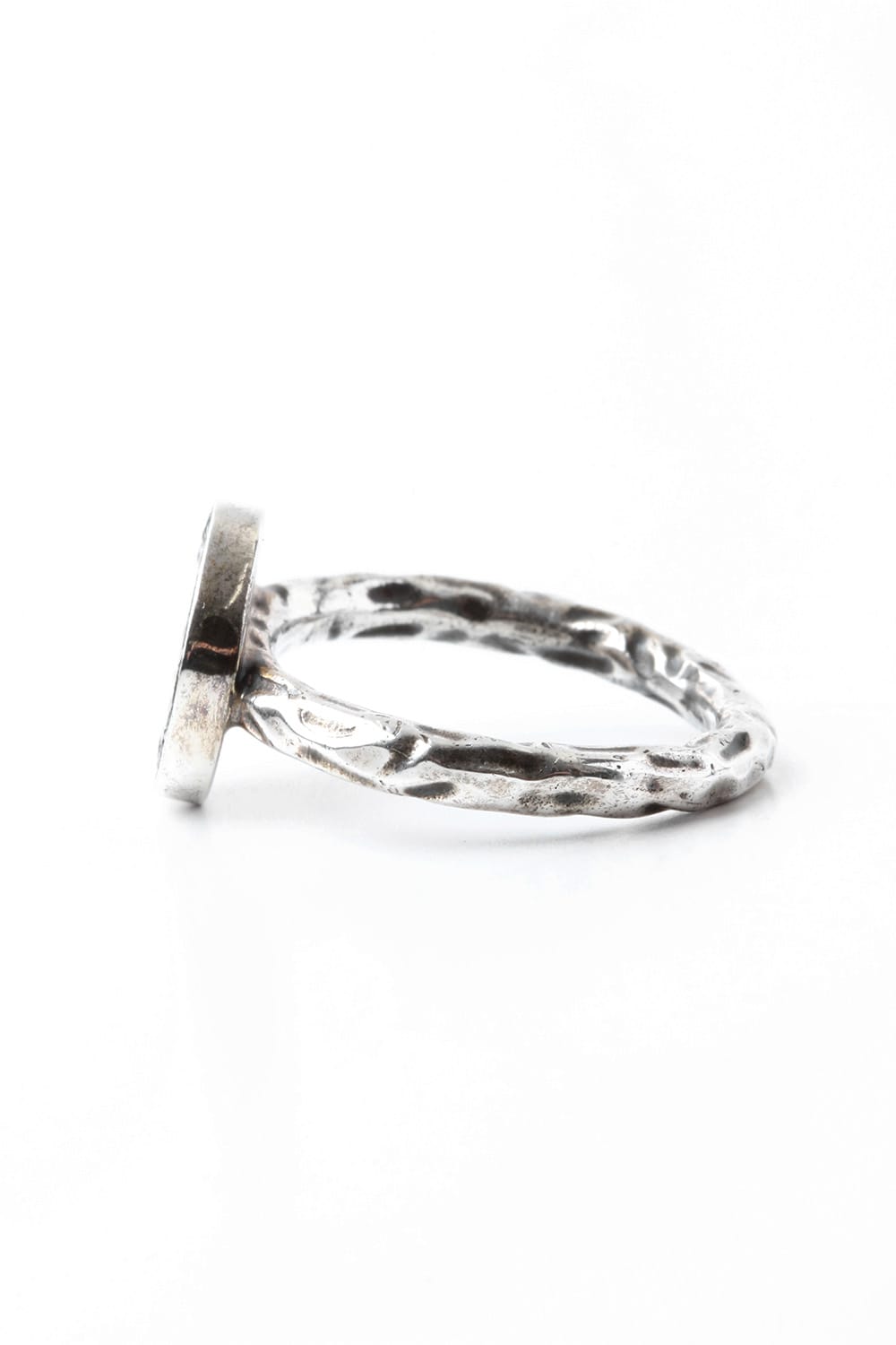 A silver ring with black diamond and leather on the randomly shaped top. The ring has a rugged mallet that combines delicate and rugged design.