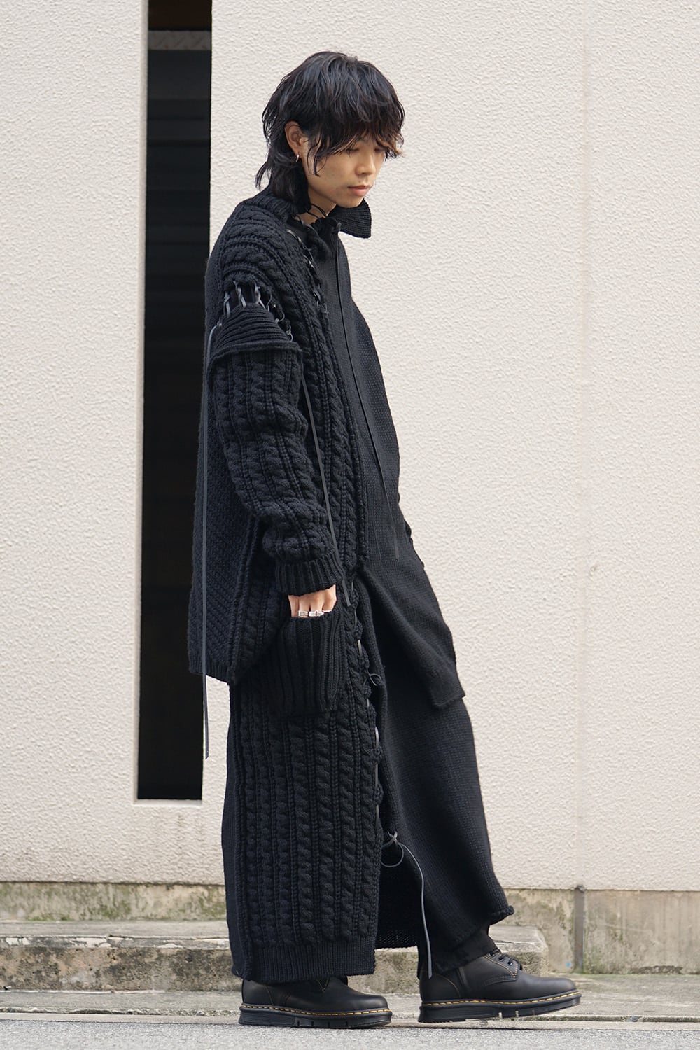 The knit is 100% wool yarn and it is a light material. Rope braid and ground patterns are partly taken in and a part of it uses a strap.