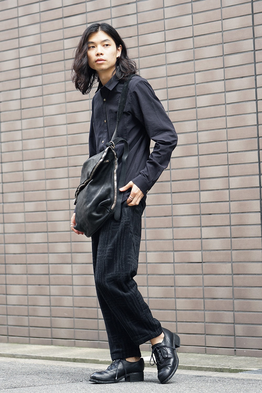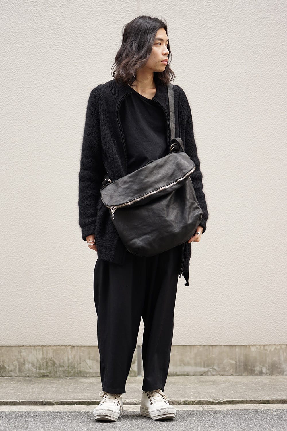 This messenger bag-like shoulder bag is made with a soft horse leather adapting well. It has a pleasant and yet simple design with GUIDI leather and a zip, while having a strong presence. This is a great piece for people looking for a bag they can use for many years.
