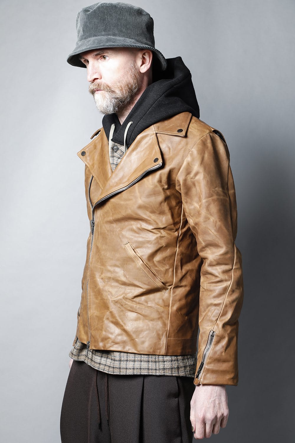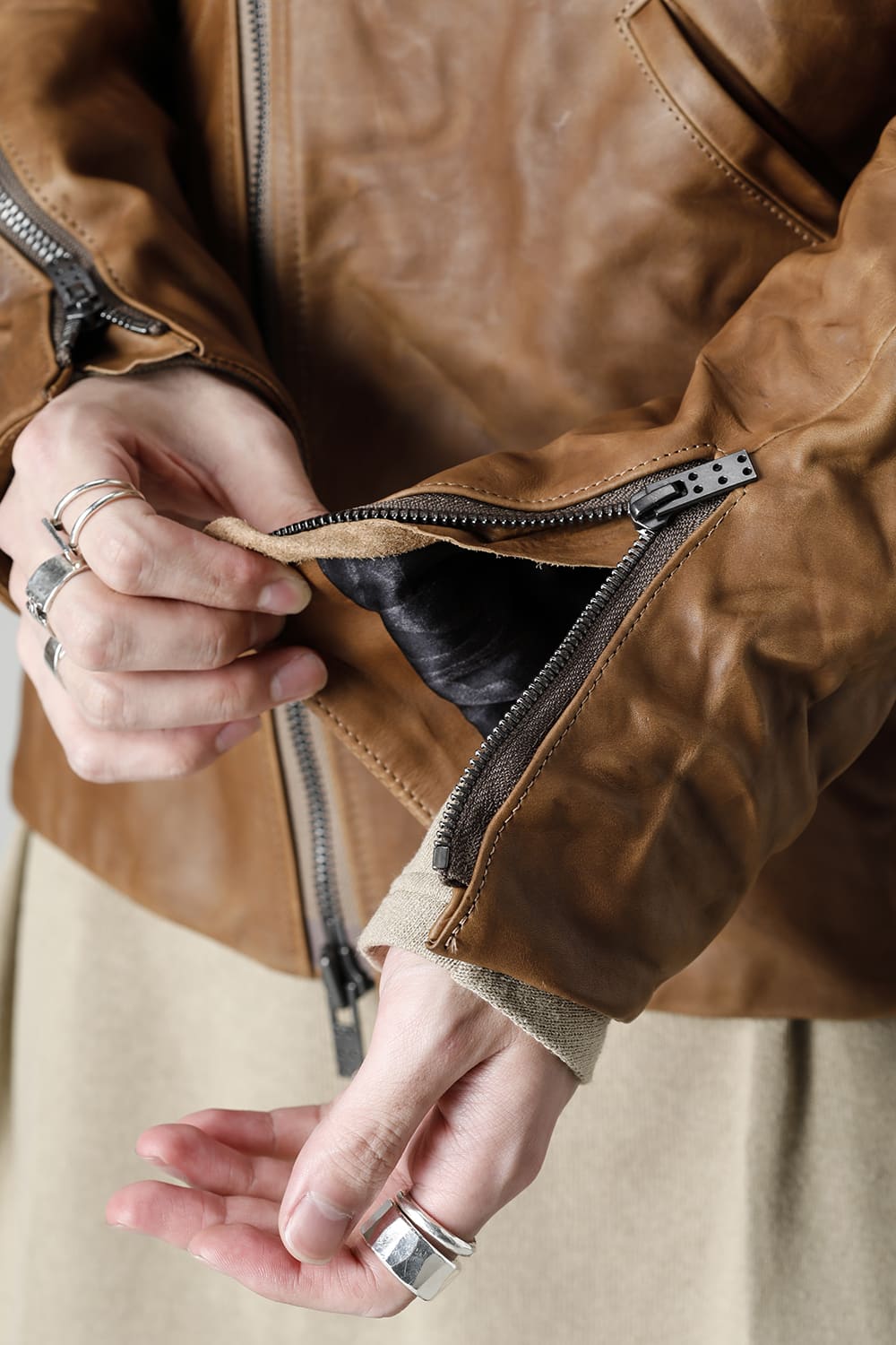 This is a double rider's jacket made of 1.2 mm thick calf leather from GUIDI in Italy.
