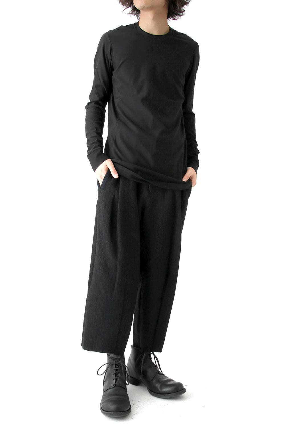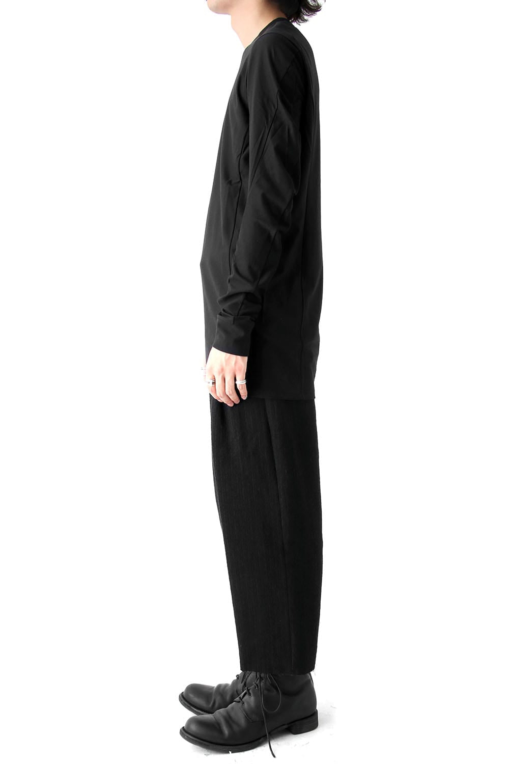 Long sleeve cut-sew made with a raising finishing suvin cotton jersey. It has a very nice soft touch, and a smooth feeling on the inner side where the finishing was made. The silhouette is a regular fit.
