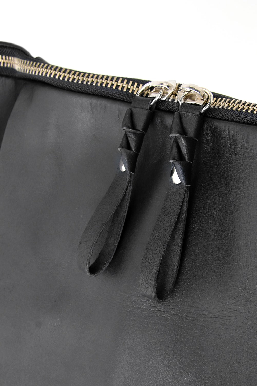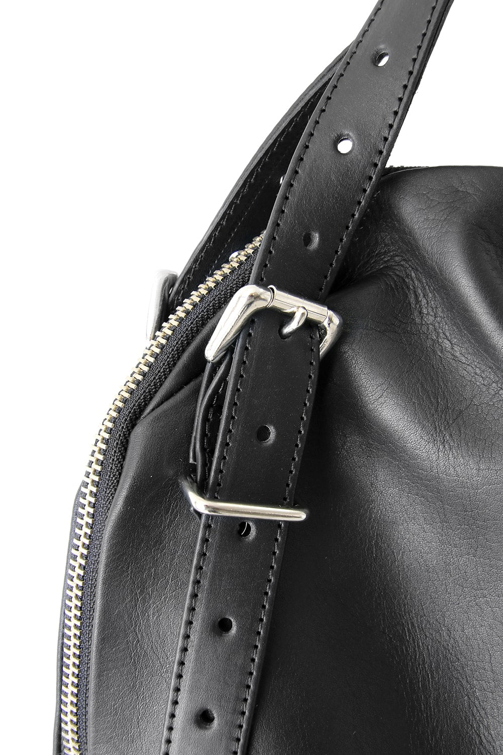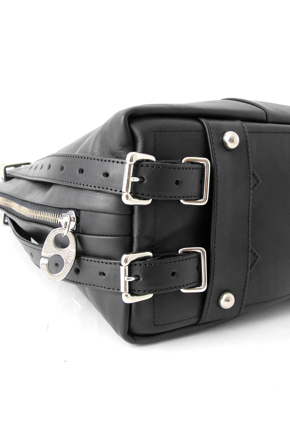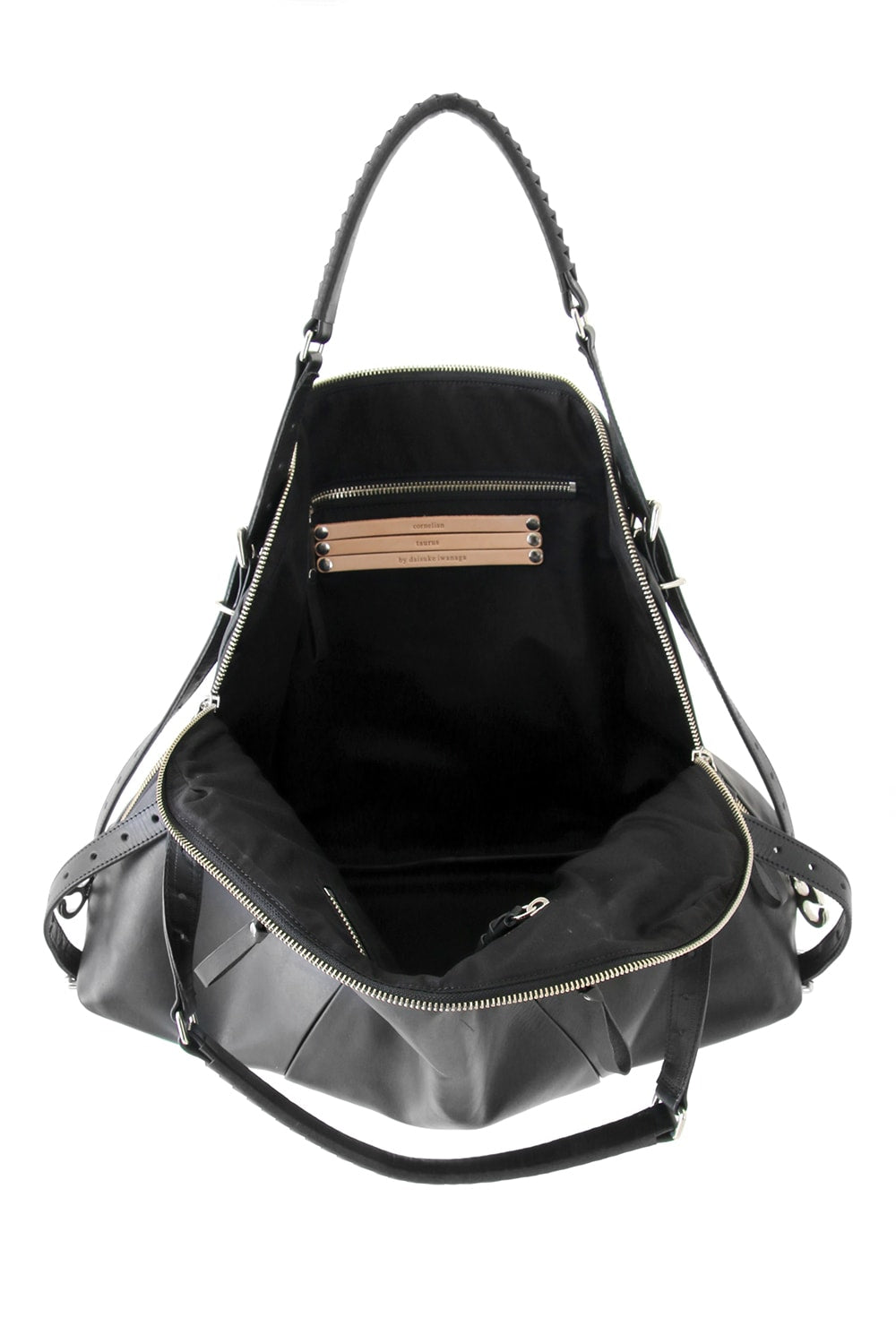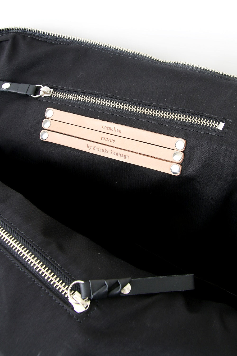 This bag is made with a beautiful soft touch kip leather that had a sumi dying and has a matte impression. The handle passes through from the bottom of the bag and its length can be adjusted, so you can modify it to hold this bag many different ways. The body has 4 sliders on its zip. 2 of these sliders have a ship chandlery inspired part, these are original parts that can also be used to connect to other cornelian taurus items such as a coin case or a key holder for example.