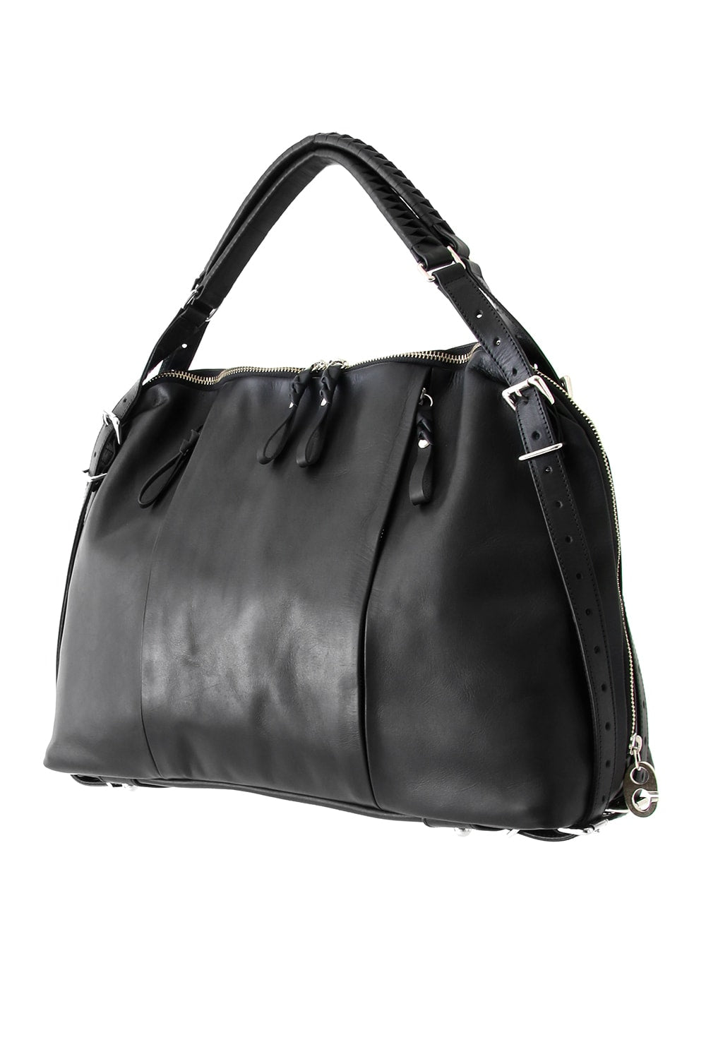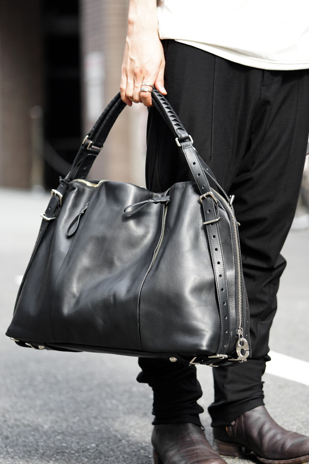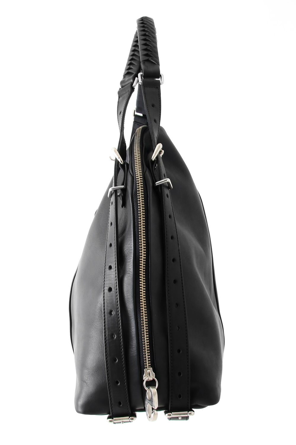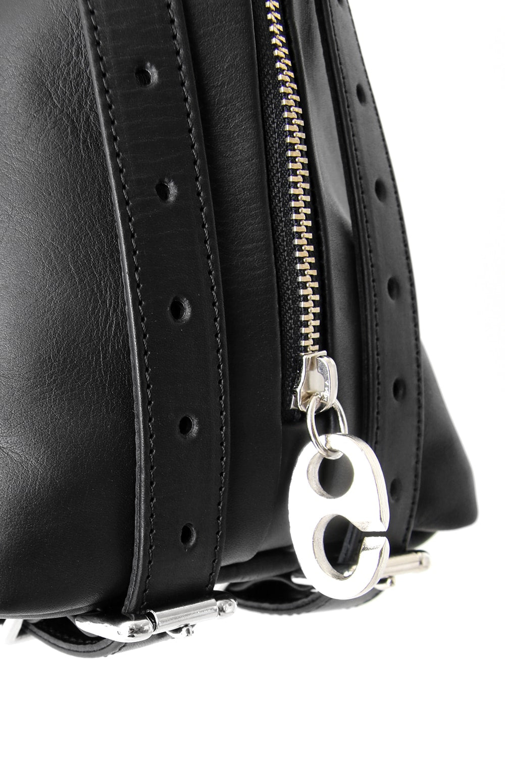 This bag is made with a beautiful soft touch kip leather that had a sumi dying and has a matte impression. The handle passes through from the bottom of the bag and its length can be adjusted, so you can modify it to hold this bag many different ways. The body has 4 sliders on its zip. 2 of these sliders have a ship chandlery inspired part, these are original parts that can also be used to connect to other cornelian taurus items such as a coin case or a key holder for example.