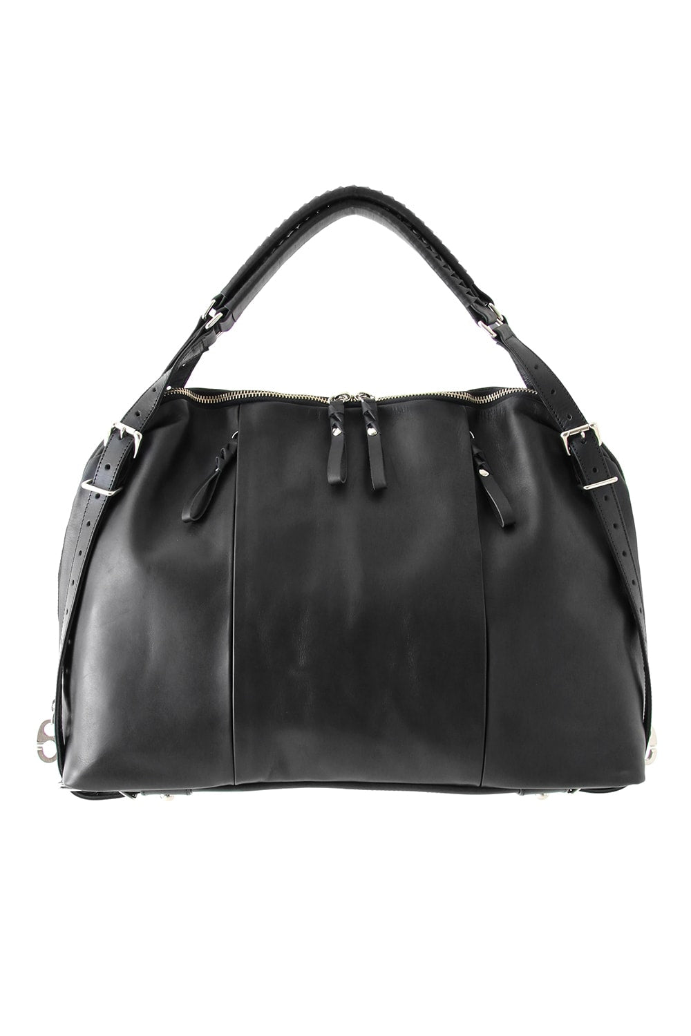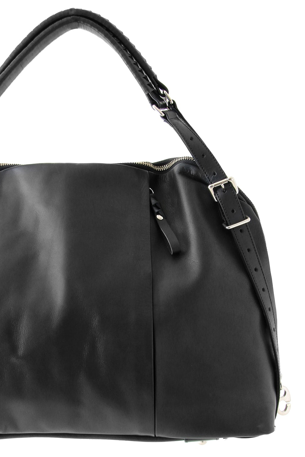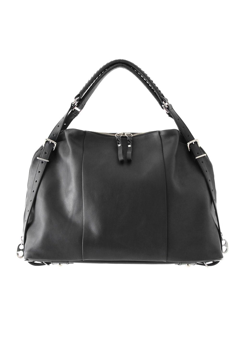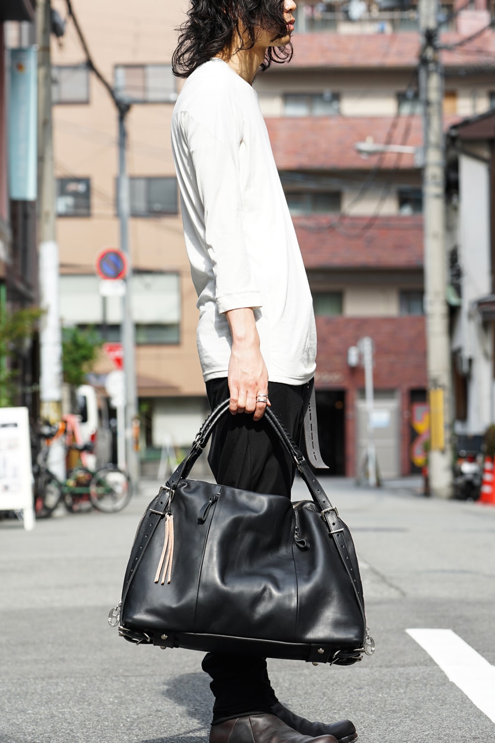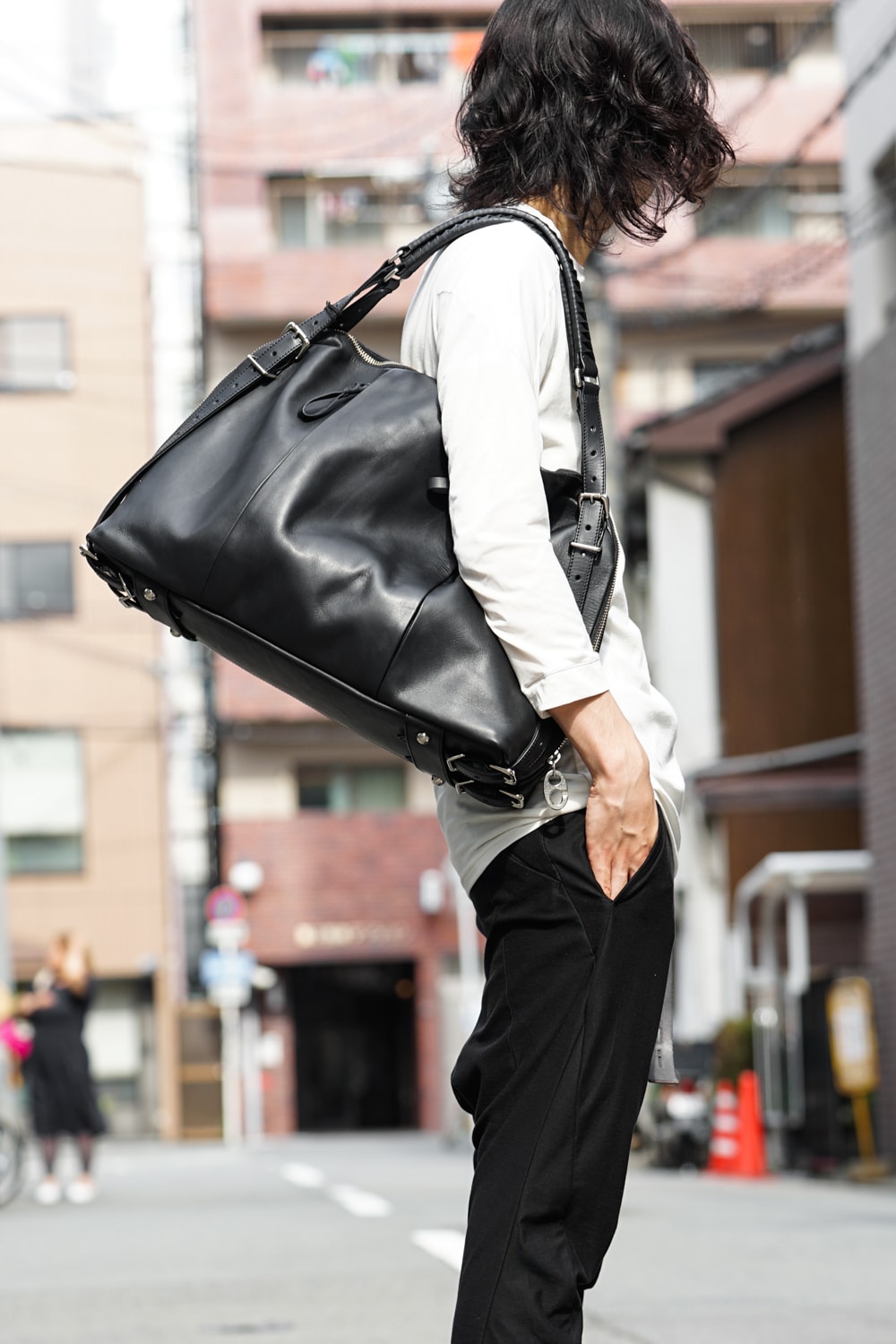This bag is made with a beautiful soft touch kip leather that had a sumi dying and has a matte impression. The handle passes through from the bottom of the bag and its length can be adjusted, so you can modify it to hold this bag many different ways. The body has 4 sliders on its zip. 2 of these sliders have a ship chandlery inspired part, these are original parts that can also be used to connect to other cornelian taurus items such as a coin case or a key holder for example.