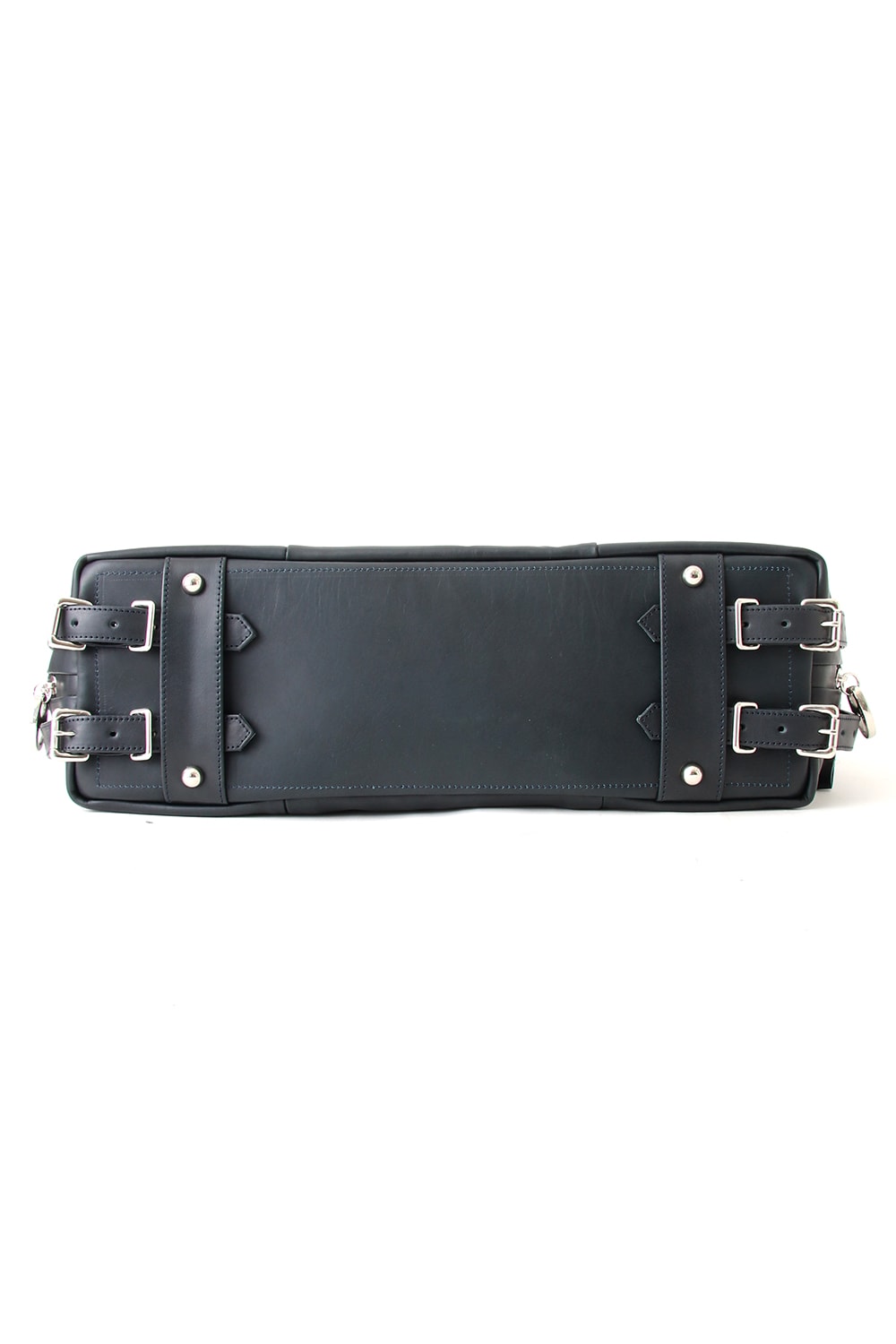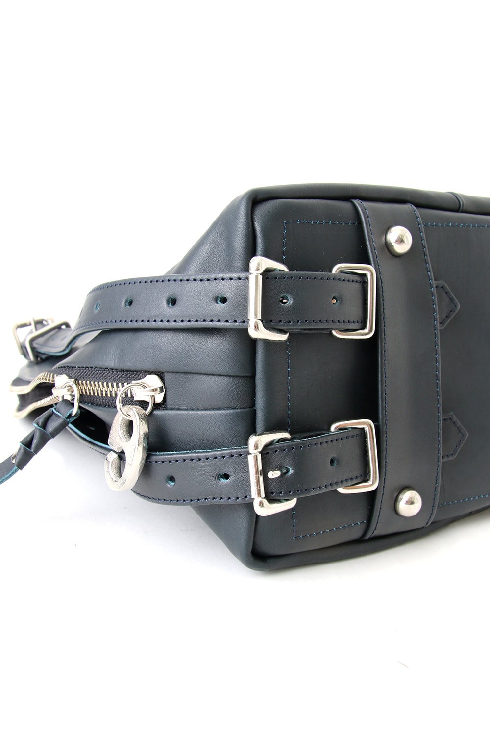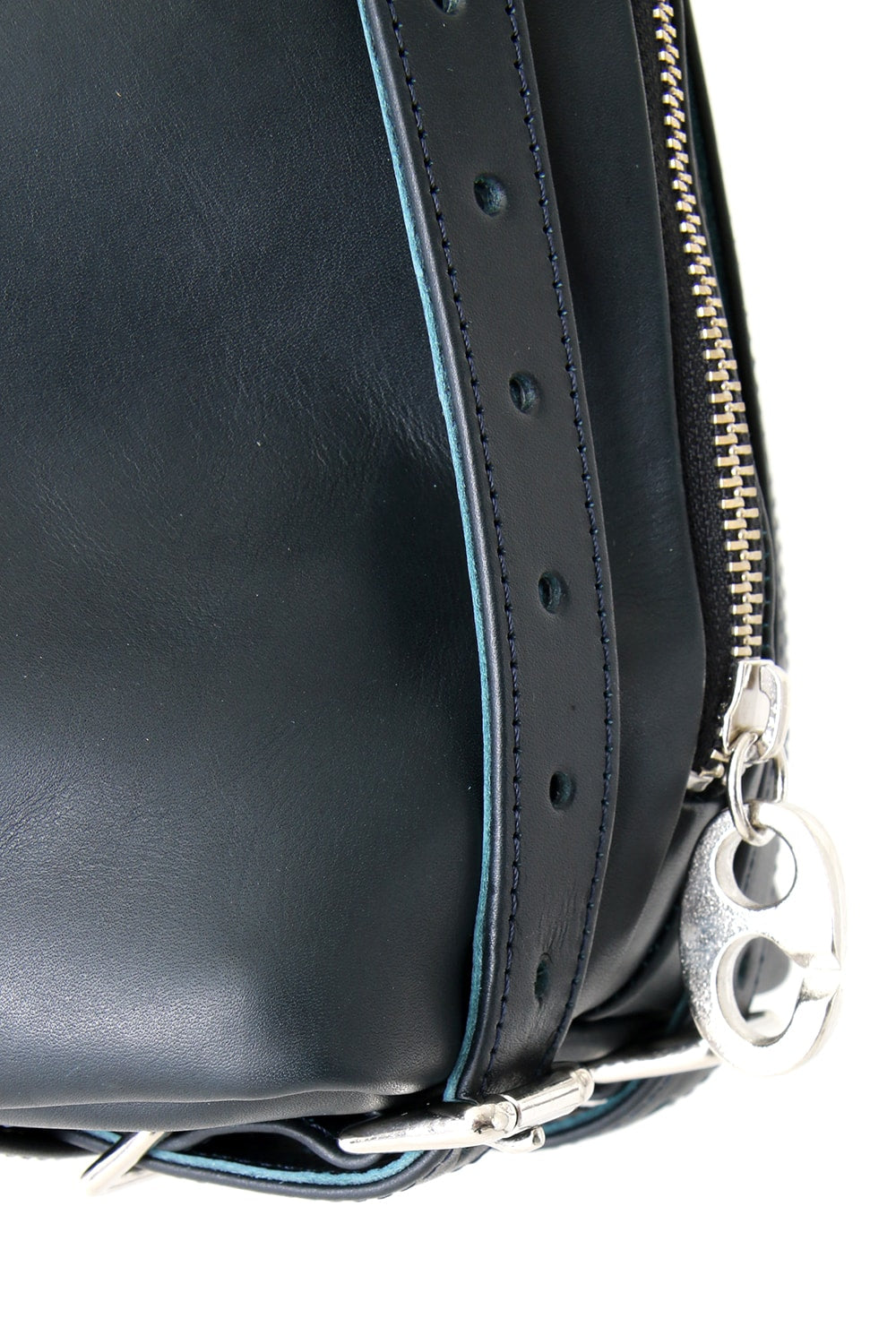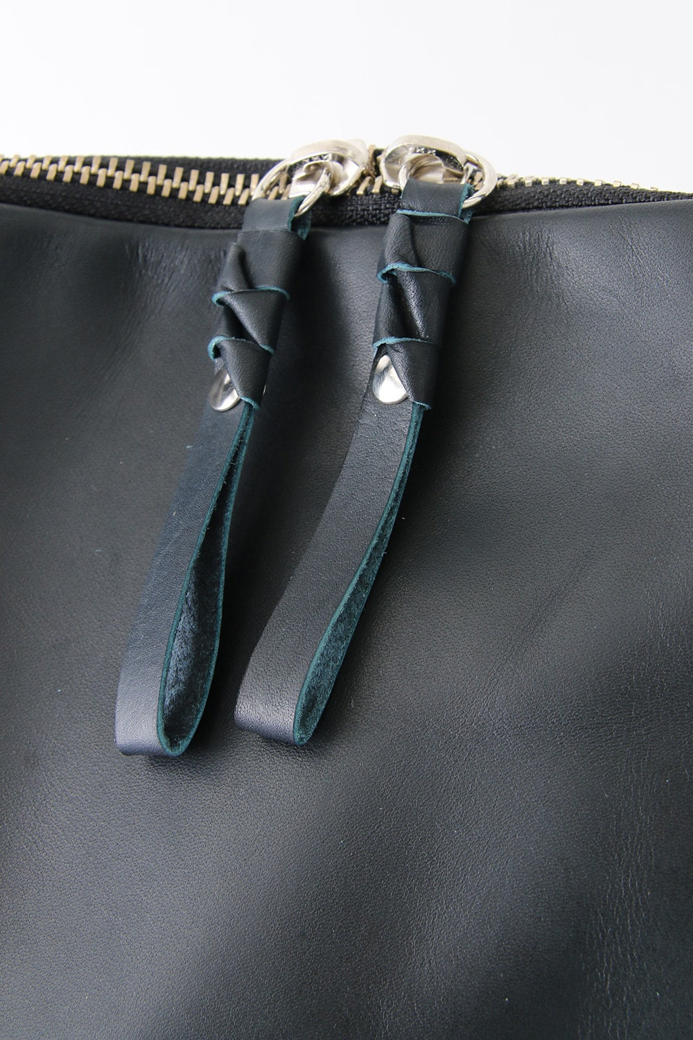 This bag is made with a beautiful soft touch kip leather that had a sumi dying and has a matte impression. The handle passes through from the bottom of the bag and its length can be adjusted, so you can modify it to hold this bag many different ways. The body has 4 sliders on its zip. 2 of these sliders have a ship chandlery inspired part, these are original parts that can also be used to connect to other cornelian taurus items such as a coin case or a key holder for example.