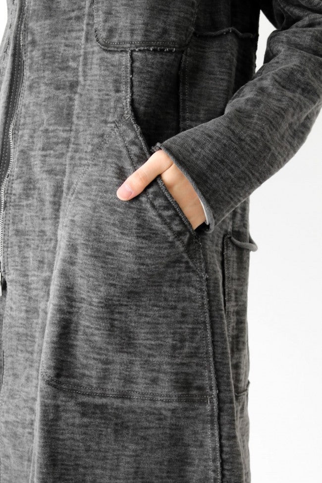 This loop wheel machine fabric was made extremely dense to construct this thin long length zip up hoodie. The front has a chest and side pocket made with cut-off parts for a nice accent. The Ink is a sumi dyed coloring.