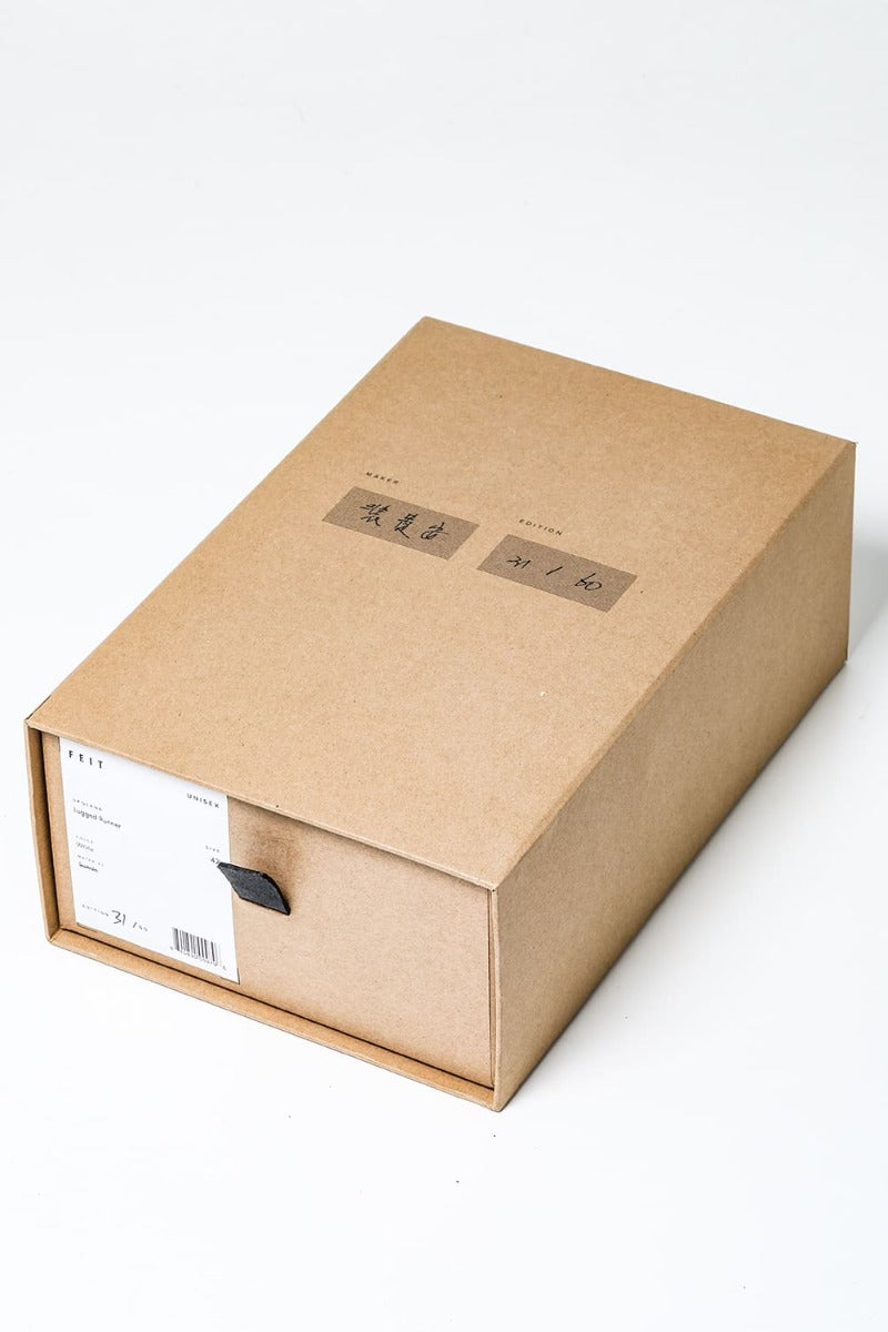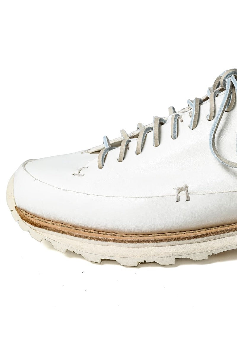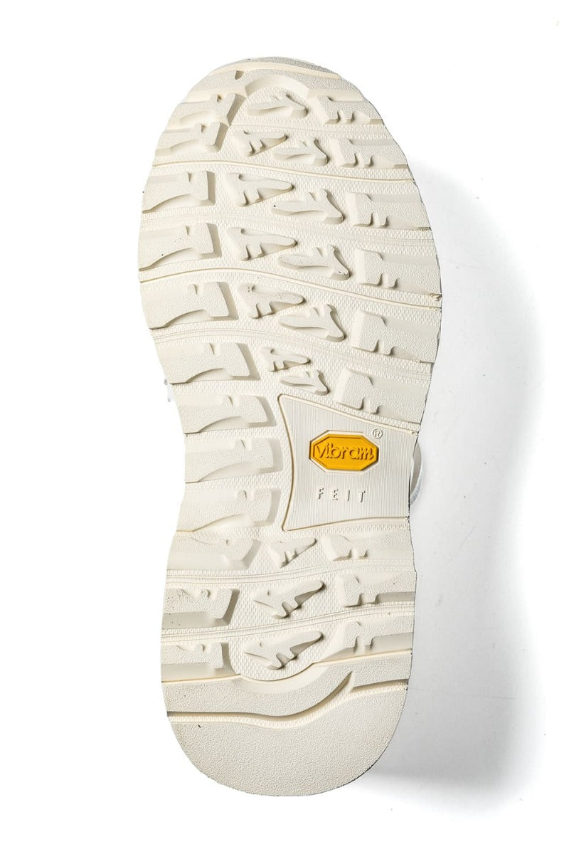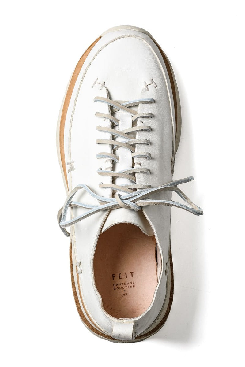 A pair of voluminous sneakers with a custom Vibram sole after the upper and sole are attached by a Goodyear welt process.