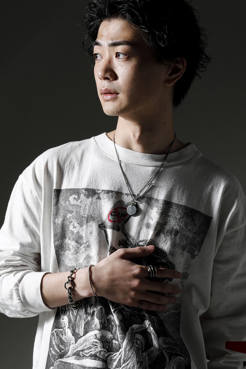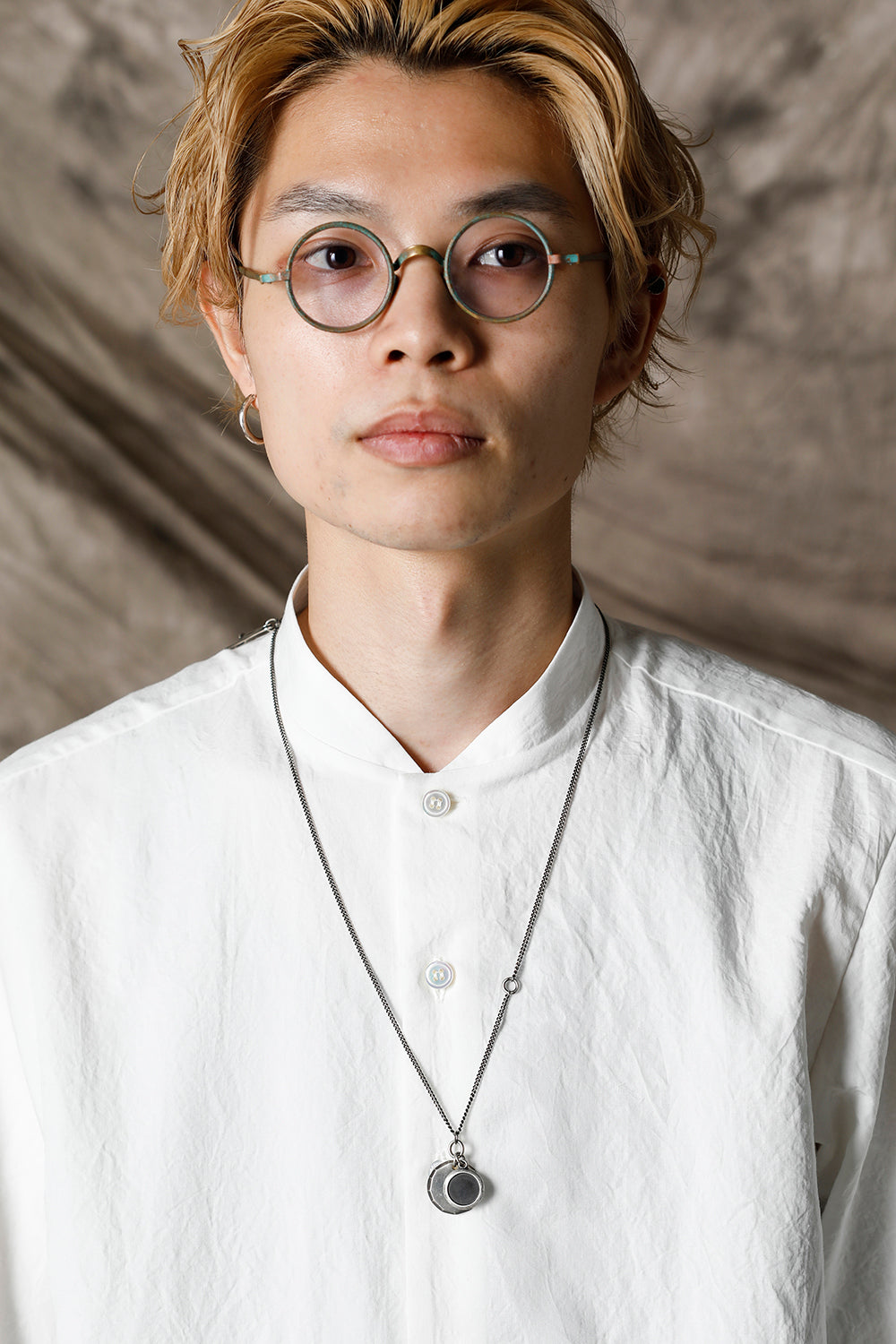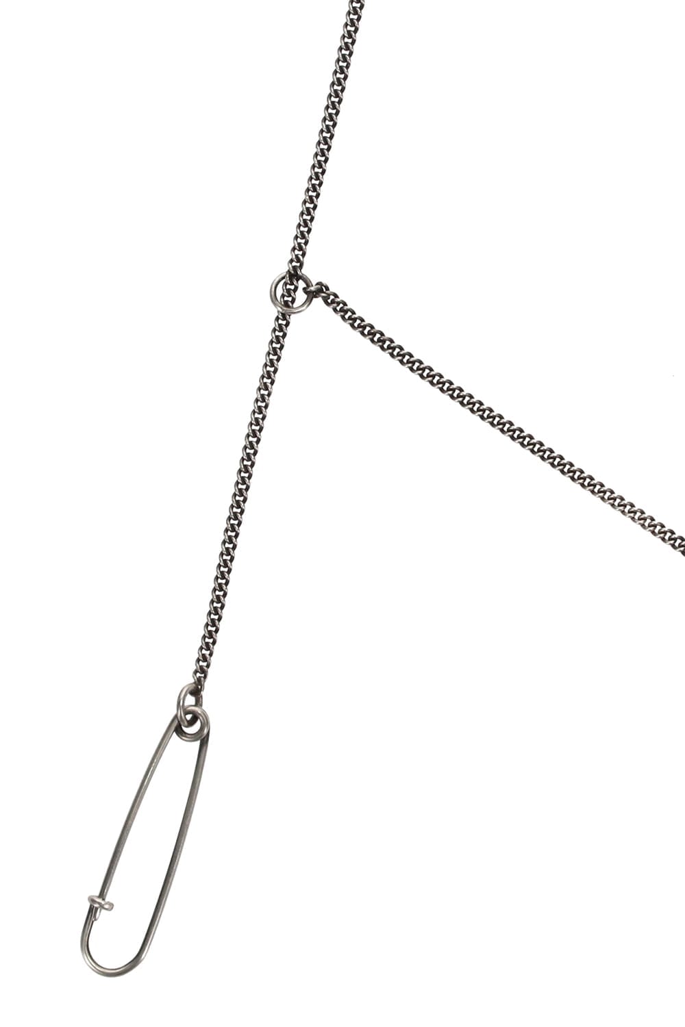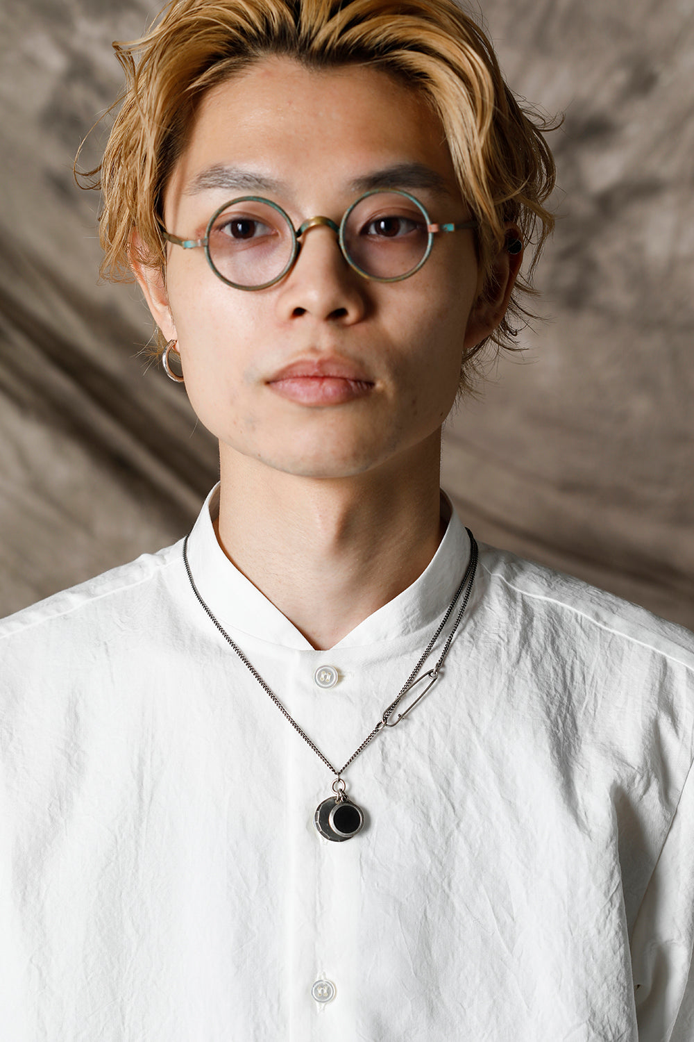 This is a necklace with two types of plate tops and safety pins. Bypassing the top of the safety pin through the round can of the chain, the length can be adjusted short.