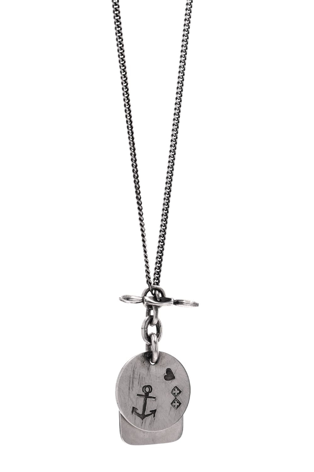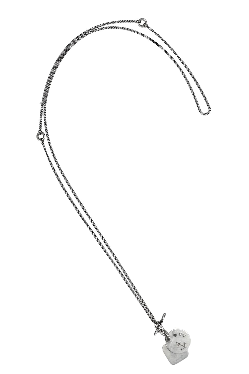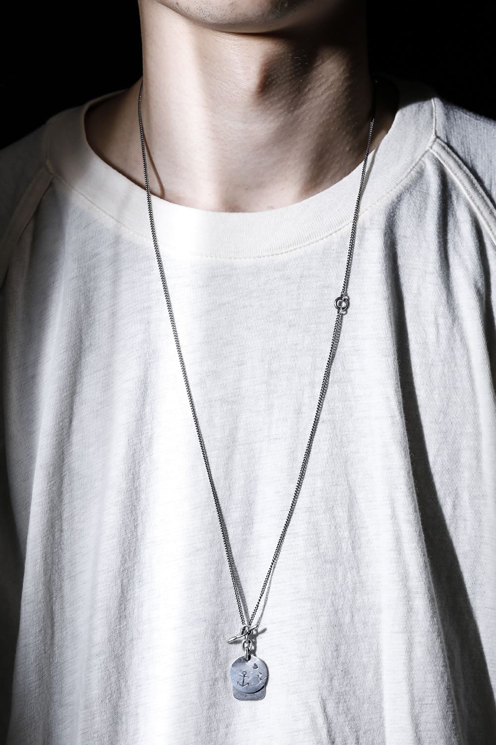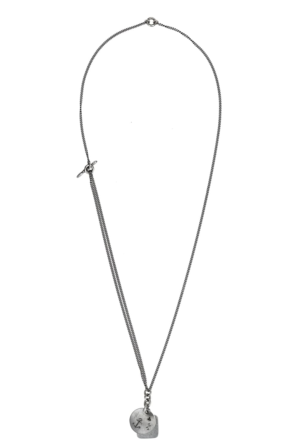 A charm design combining square and round tags. The engraving of the cross, heart and anchor of the round tag is a medieval symbol signifying faith, love and hope that has been engraved on the treasured works of Werkstatt:München for many years. The length of this moderately slim chain can be adjusted in 3 levels depending on the position of the toggle, and you can enjoy a layered look.