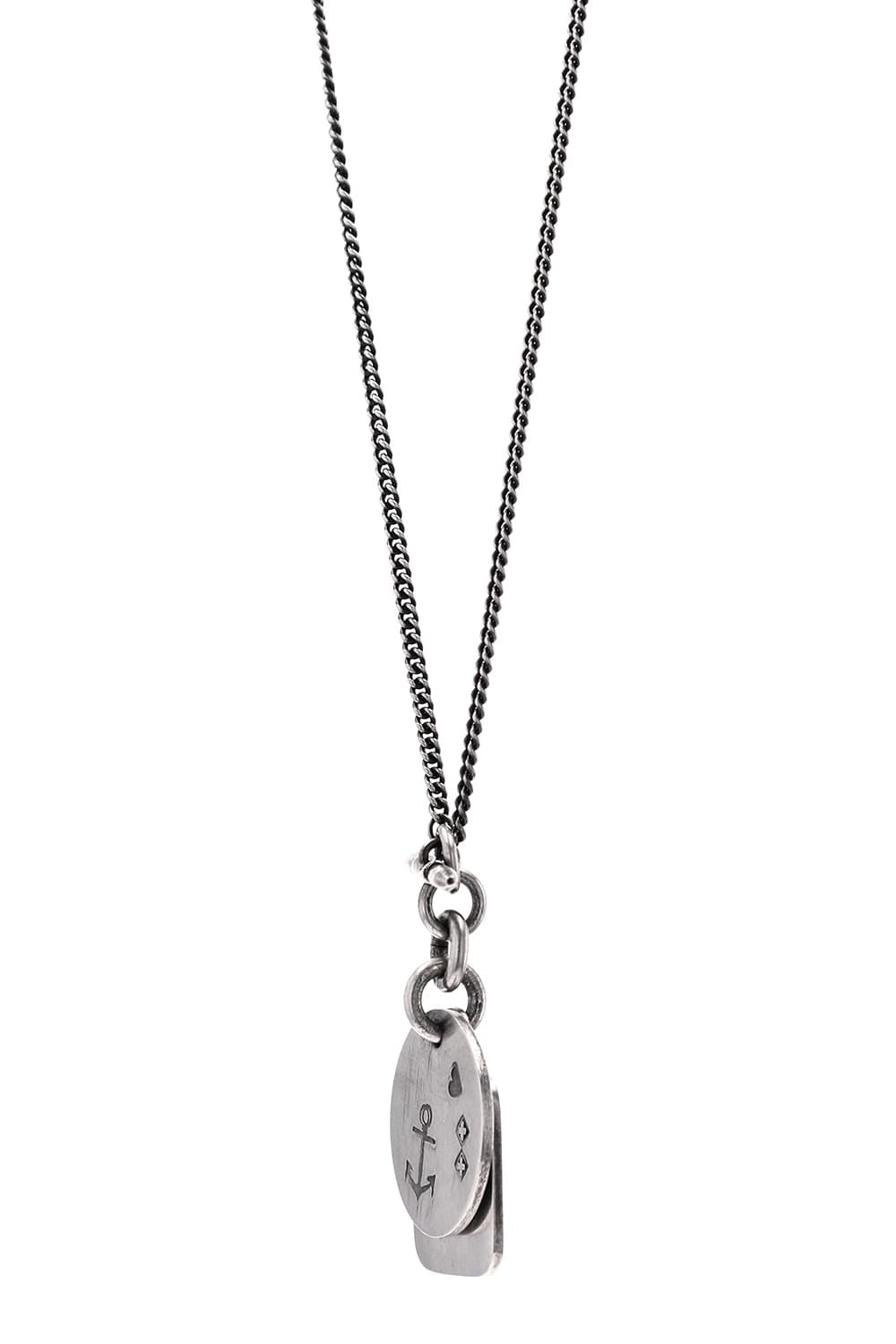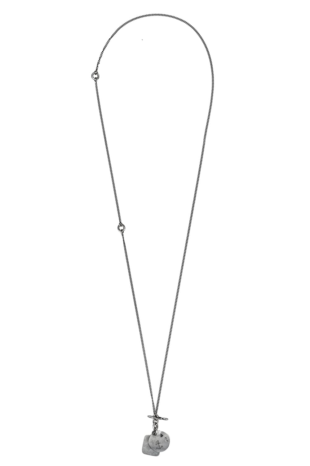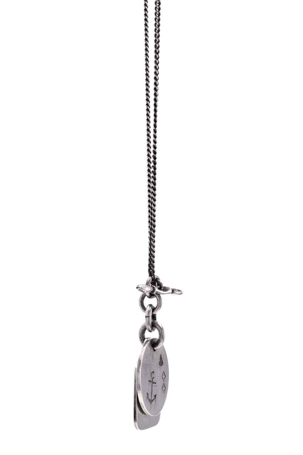 A charm design combining square and round tags. The engraving of the cross, heart and anchor of the round tag is a medieval symbol signifying faith, love and hope that has been engraved on the treasured works of Werkstatt:München for many years. The length of this moderately slim chain can be adjusted in 3 levels depending on the position of the toggle, and you can enjoy a layered look.