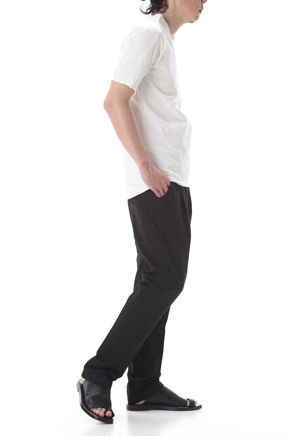 A classic cut sew with a minimalist design that is cut off at the hem and cuffs. The box silhouette makes it very easy to wear. The fabric is a medium jersey with a slightly fleshier and firmer texture than the usual cut sew fabric. The more you wear it, the more comfortable it becomes. It is available in five colours of the same material: Charcoal, Dark Gray, White, Gray Beige and Black. (Only in black, the design has a switch in the center and an overlock stitch finish.)