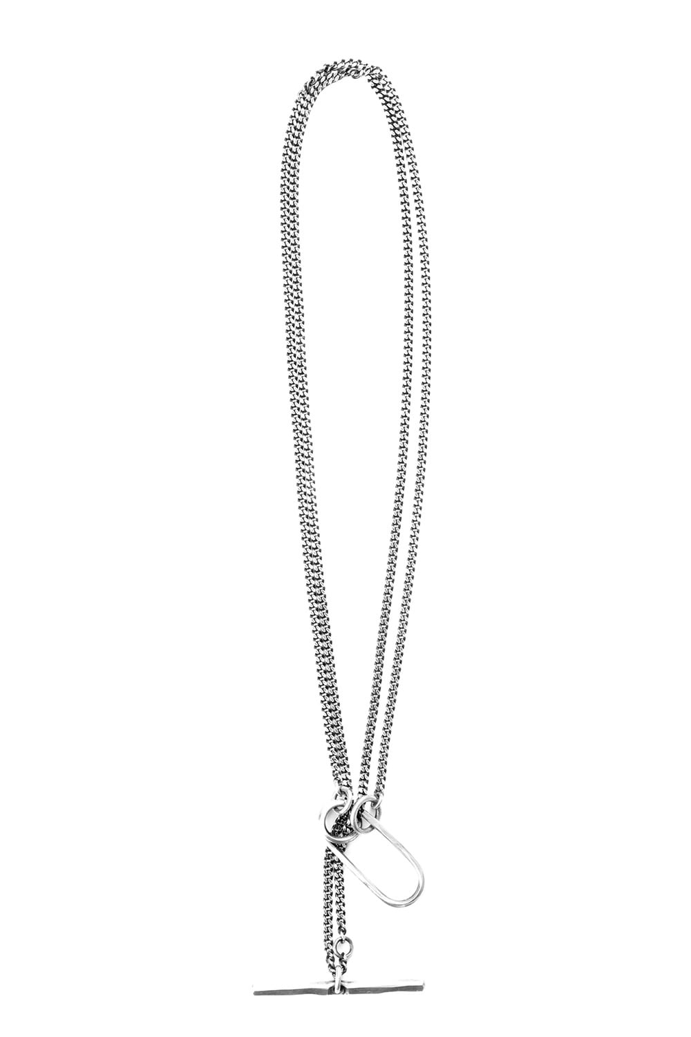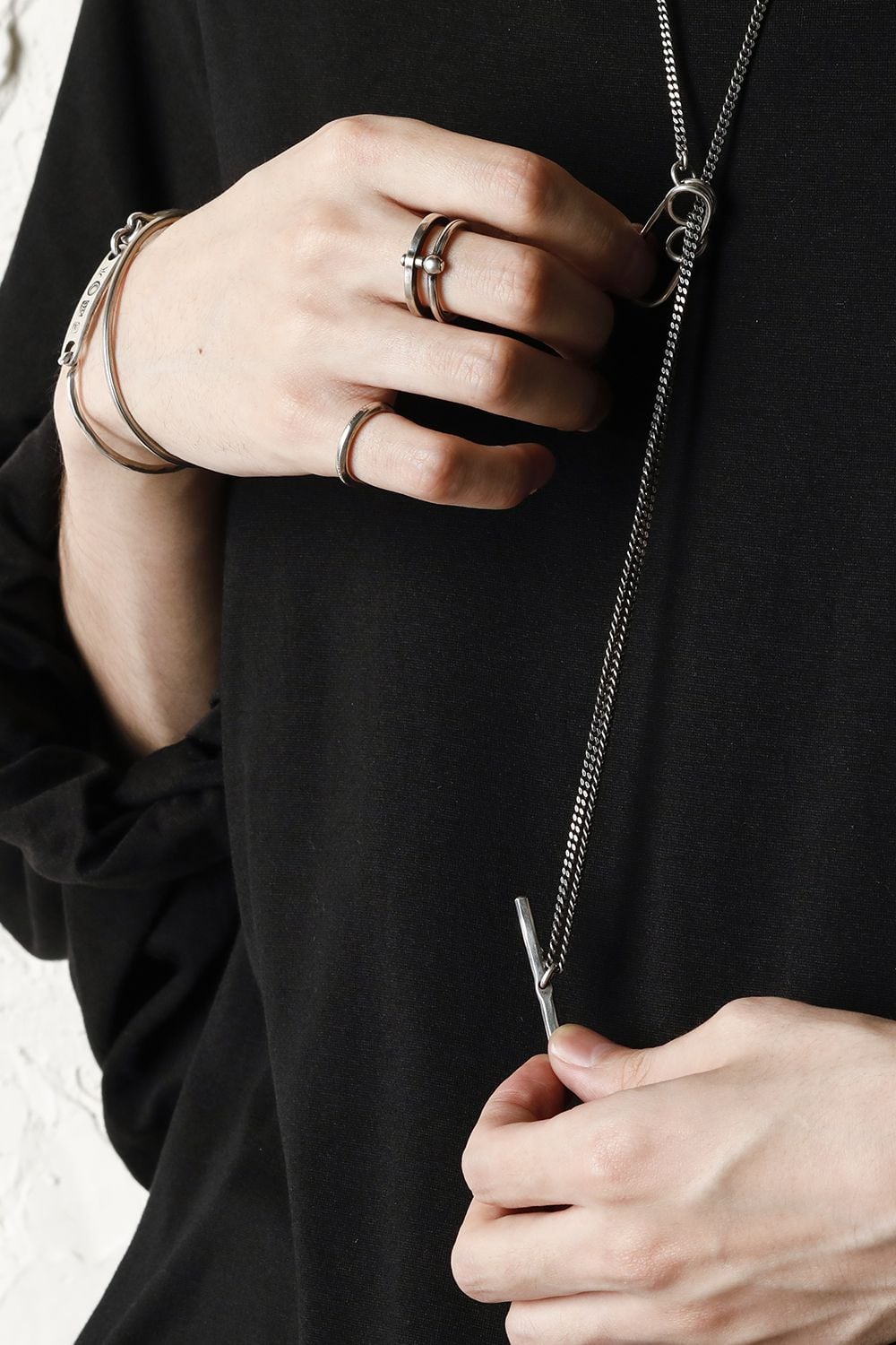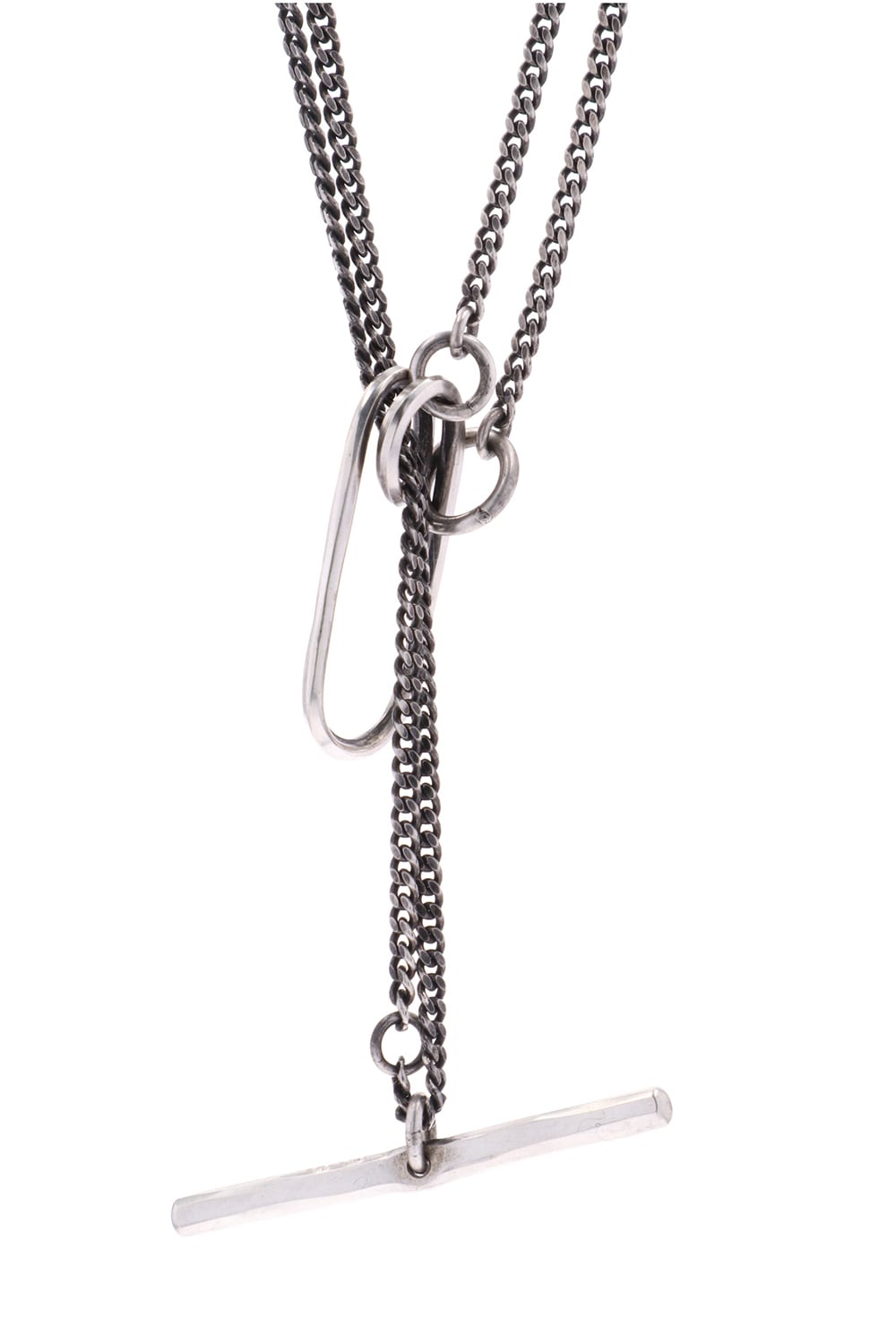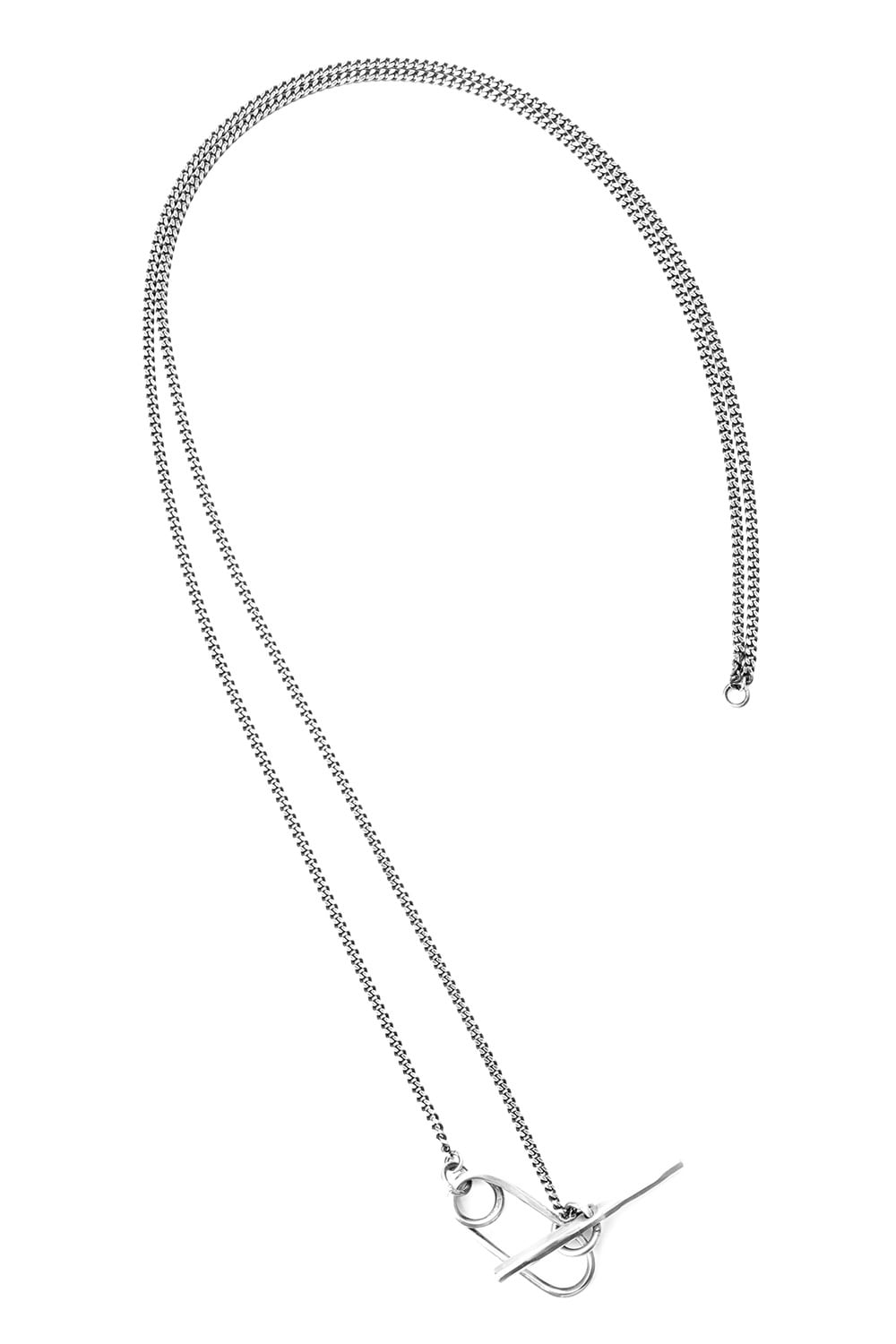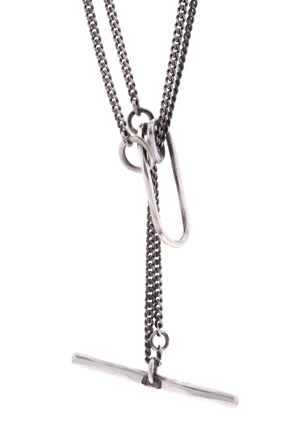 This is a necklace with a modified design that can be worn in 3 ways. You can wear it as a long necklace in the usual way, as a short necklace by putting the bar-shaped parts through the holes of the parts like safety pins, or you can wear it like a loop tie by pulling in the bar-shaped parts further. This is a versatile item that can change the length and design according to the neck type of your clothes.