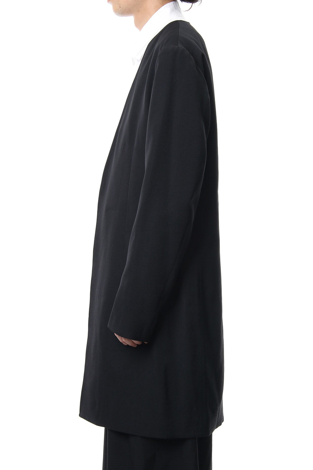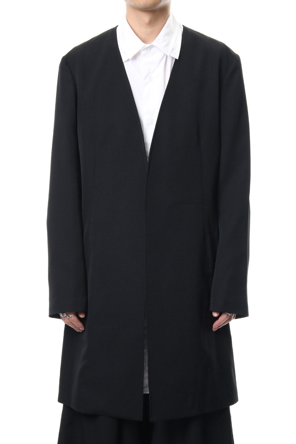 No collar jacket with an unconfined light, minimal and beautiful falling feeling. The fabric is made of a standard and classic material of Yohji Yamamoto. It has a natural texture of wool with a minimal wrinkle or grain on the finishing wool process. It also produces a beautiful drape when the fabric falls and drifts when worn. As it is simple and has a reasonable thickness, you can use it for layering as it gives a good accent for styling.