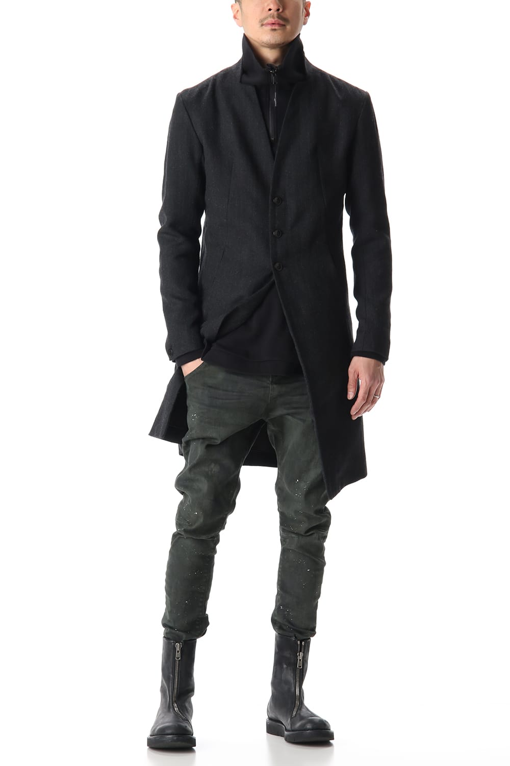 A notch dress coat made of alpaca wool. The classic herringbone pattern is mixed with lustrous and slimy alpaca and wool, and the unique quality of the alpaca creates a rough look. The cross stitching on the back creates a sharp look.