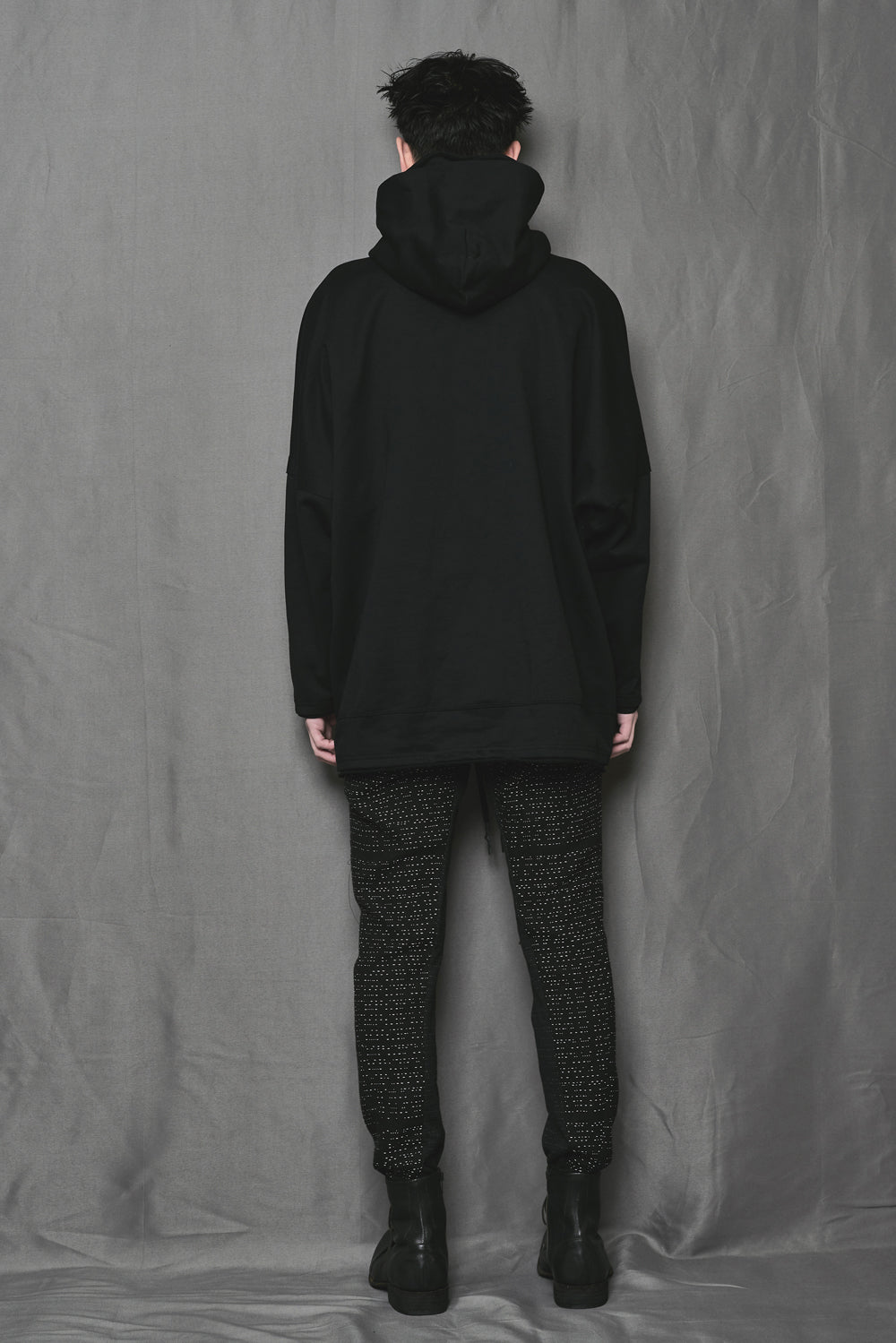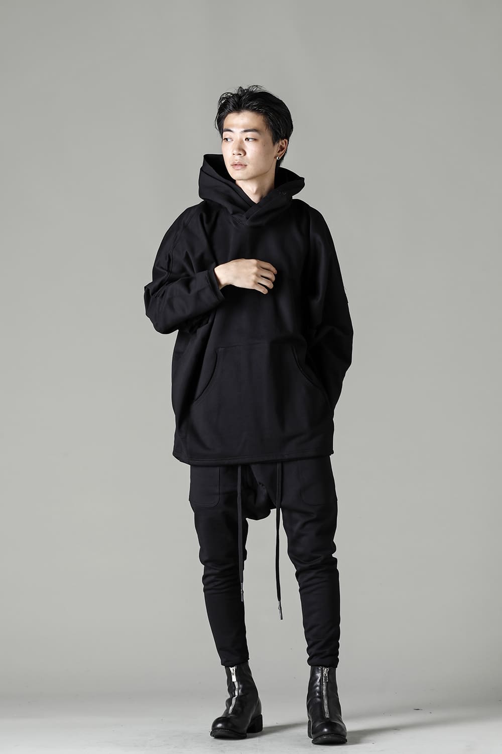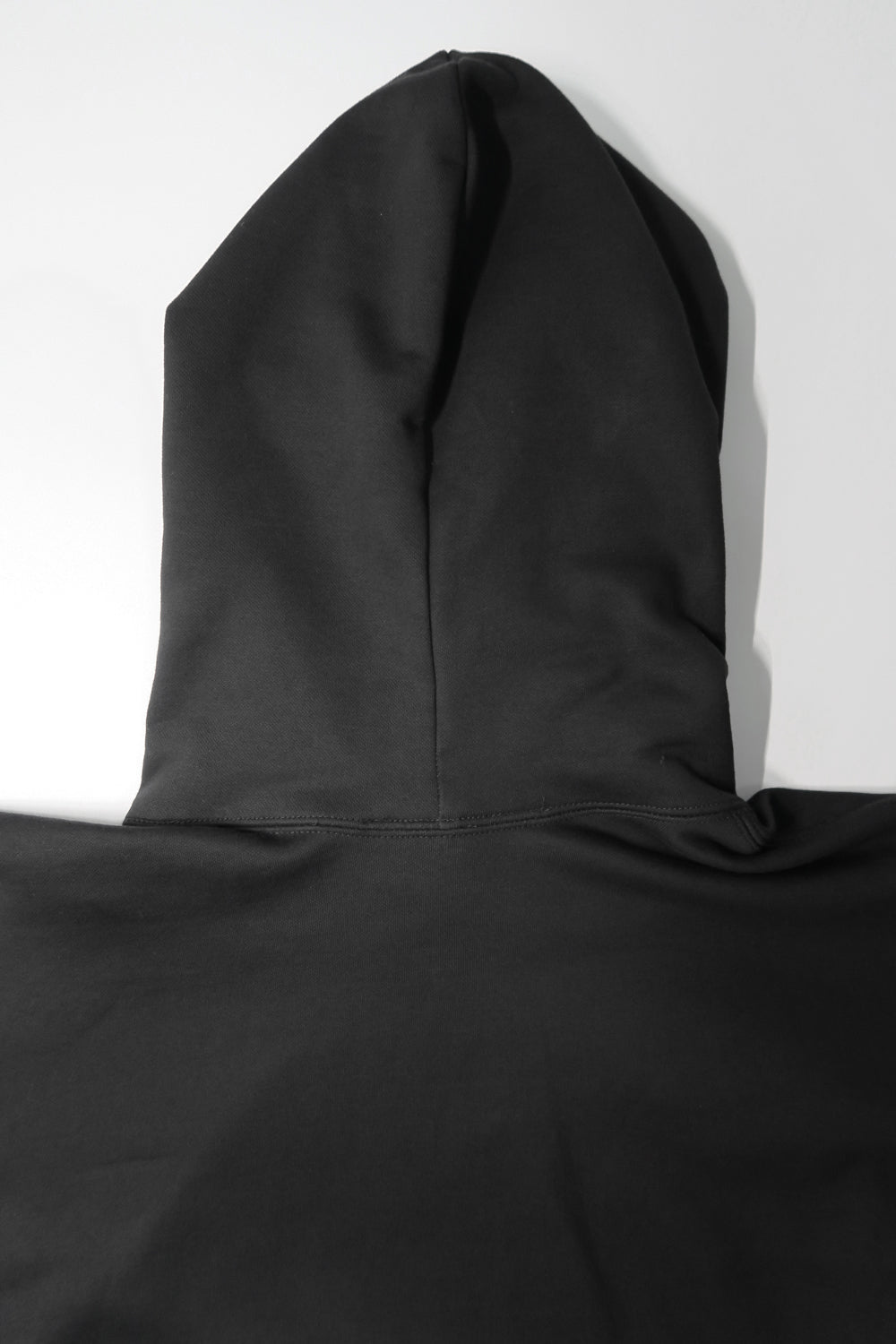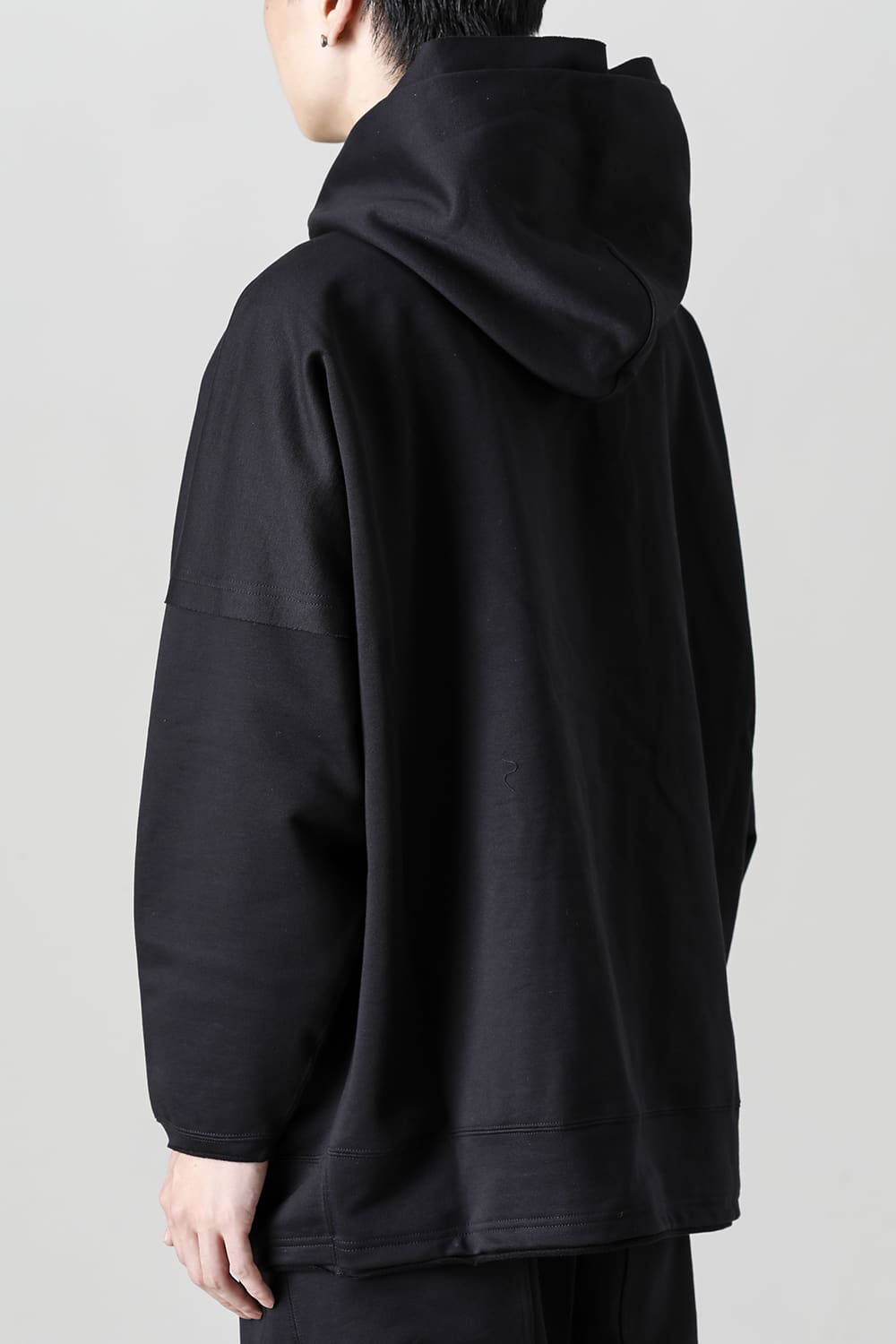 The hood and sleeves have a layered design, and the inside hood ends/cuffs/hem/pocket openings are cut off.