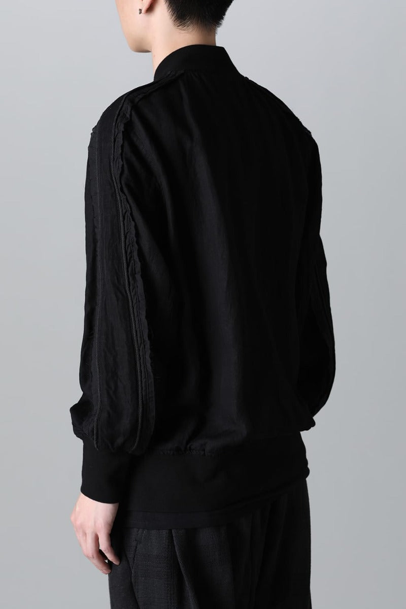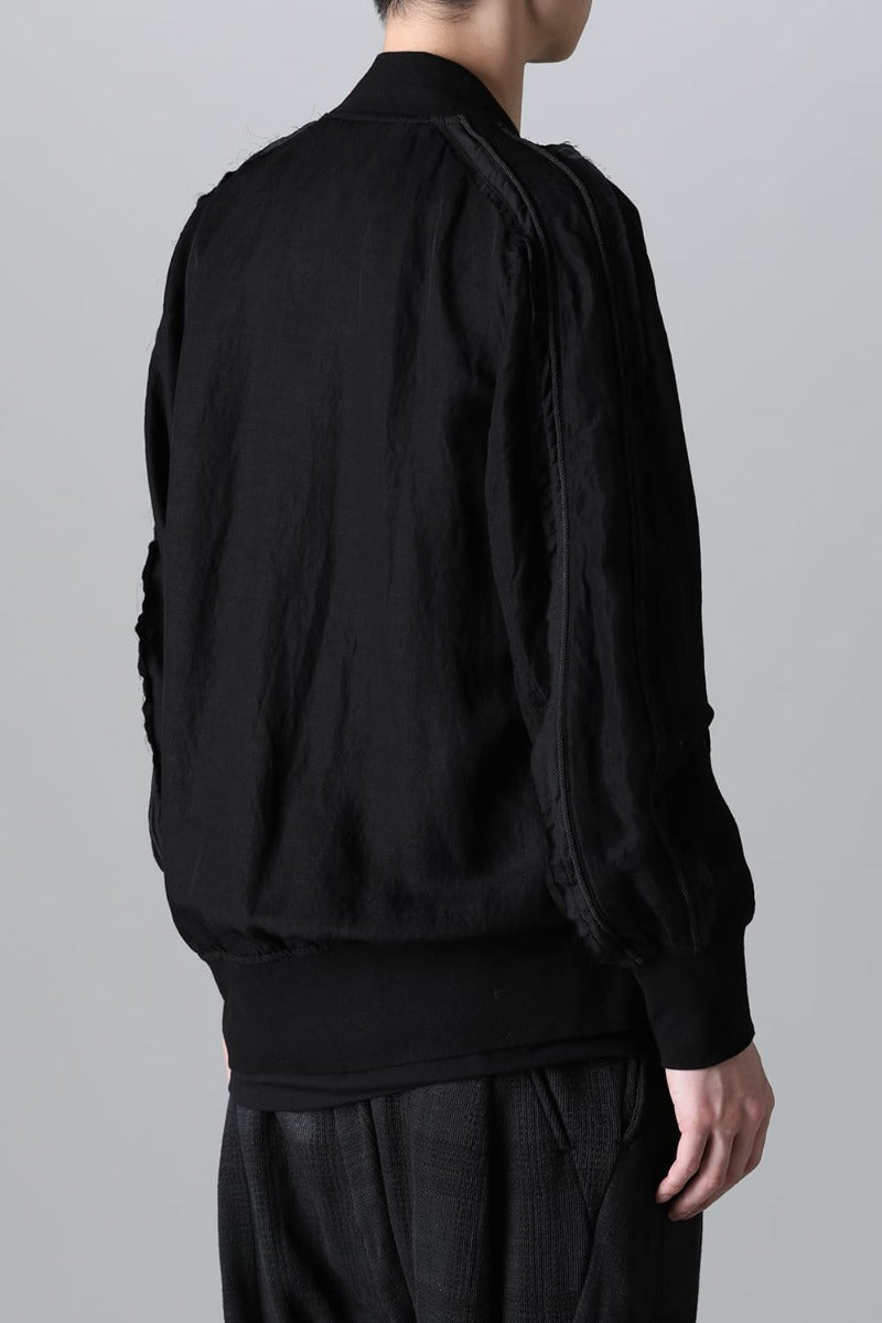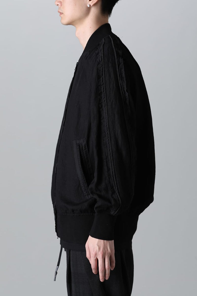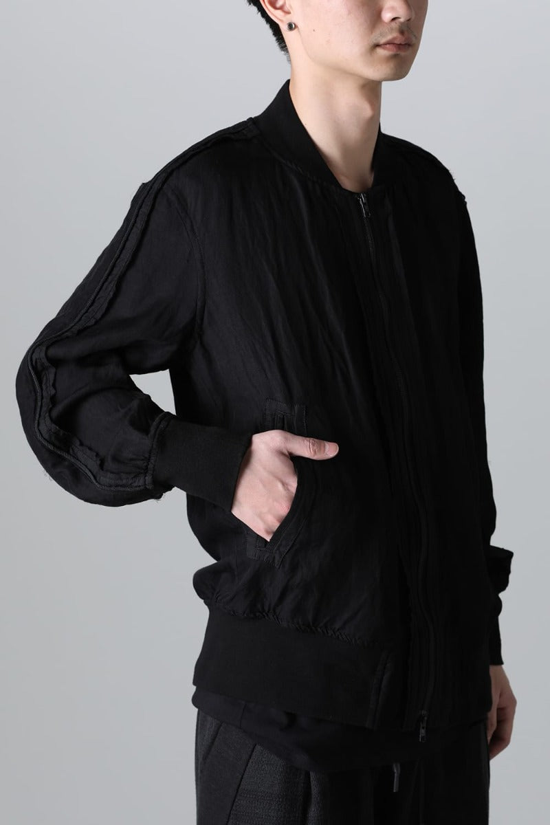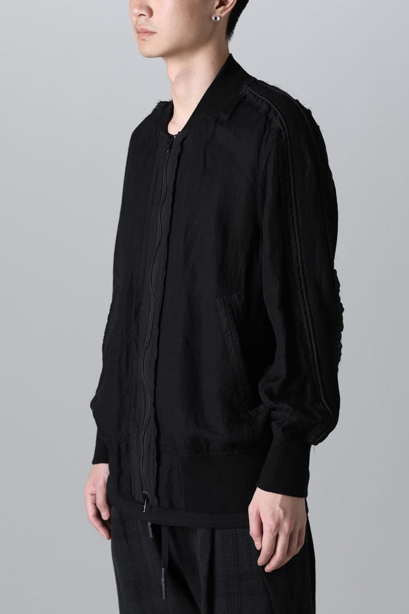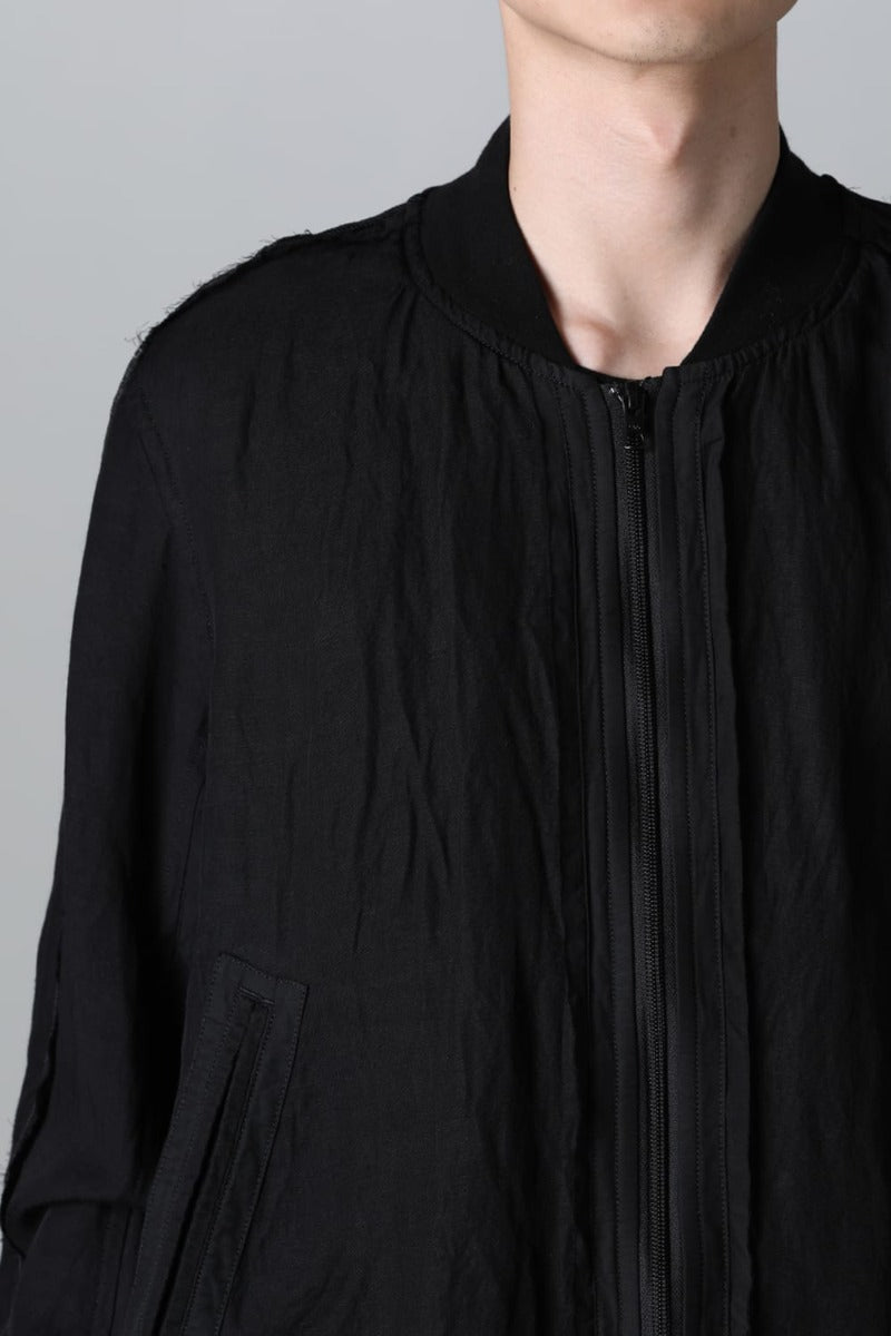 Lightweight and breathable bomber jacket made from a rayon/linen twill fabric, with two types of cupra/cotton materials used for the parts and subjected to product dyeing.