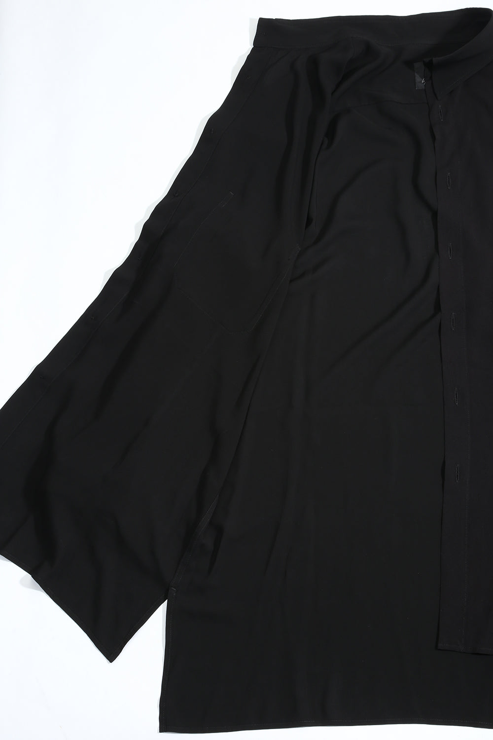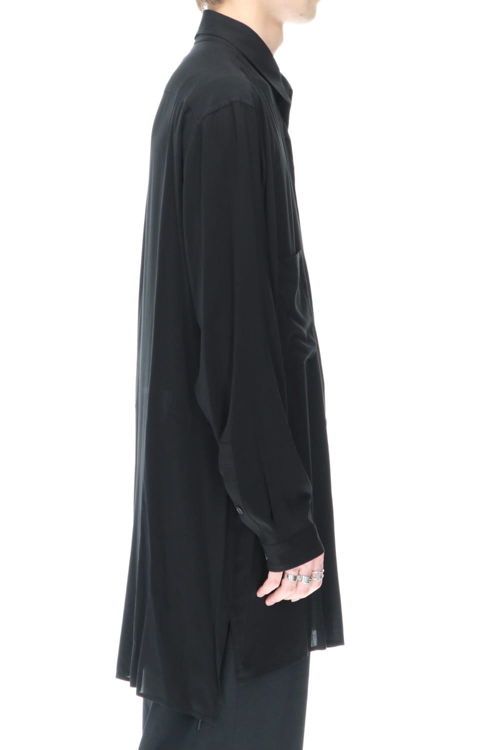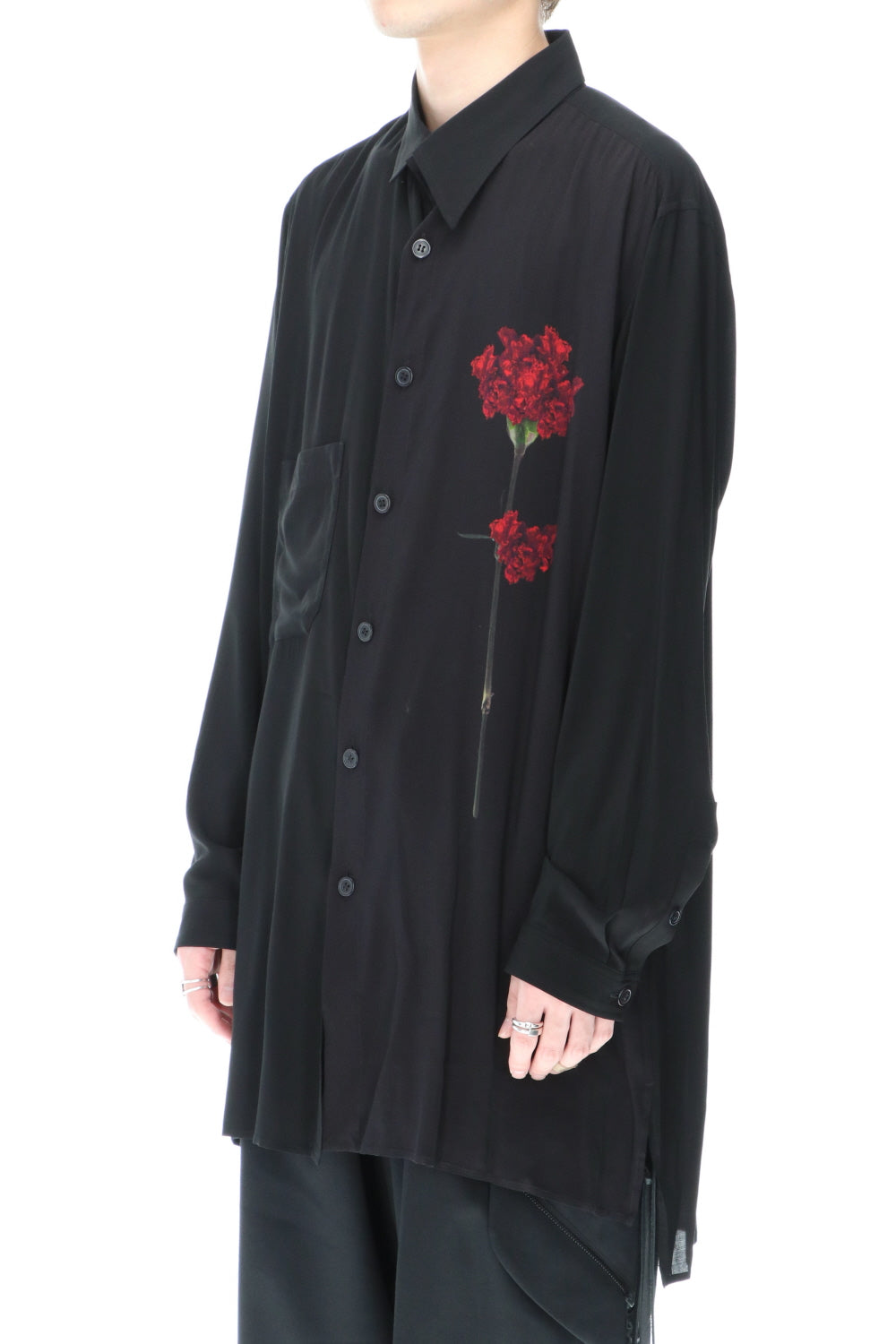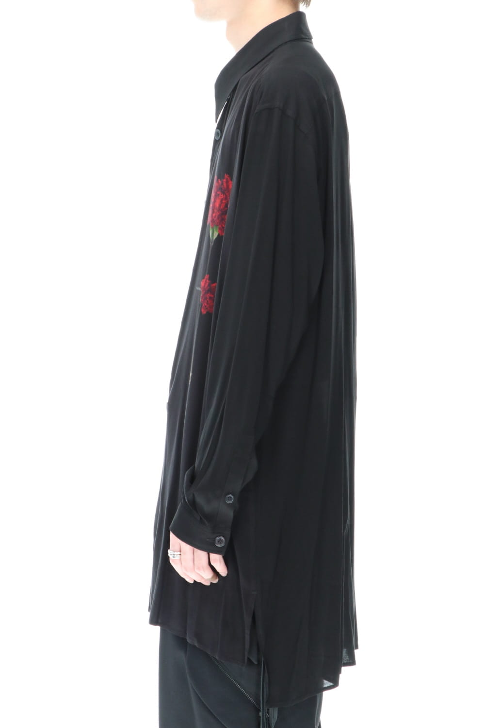 This is a middle length shirt made of rayon lawn fabric with one flower print on the left front body. This item is accented with a flower print that peeks out when you wear a jacket over it.