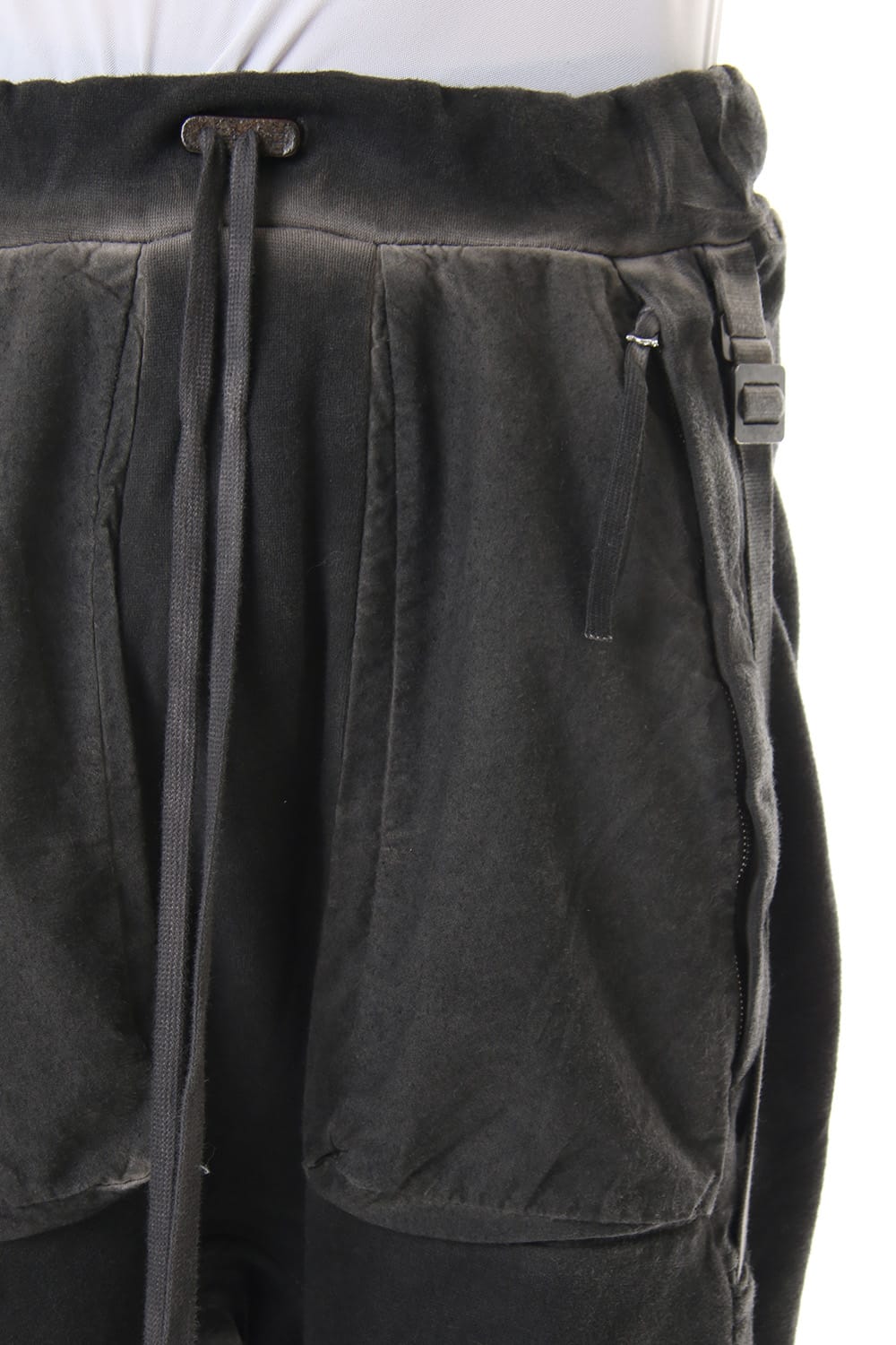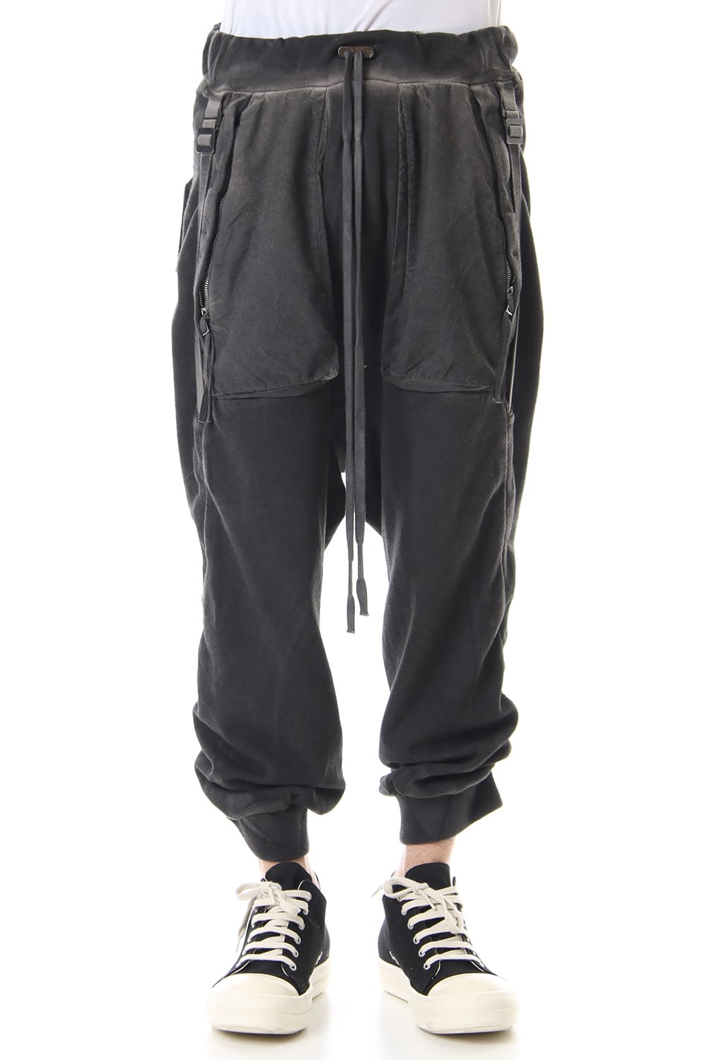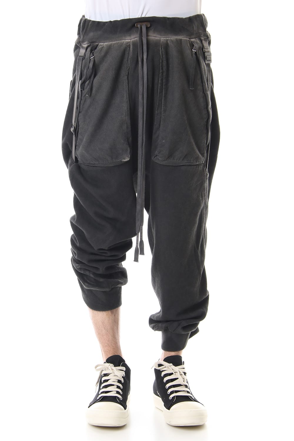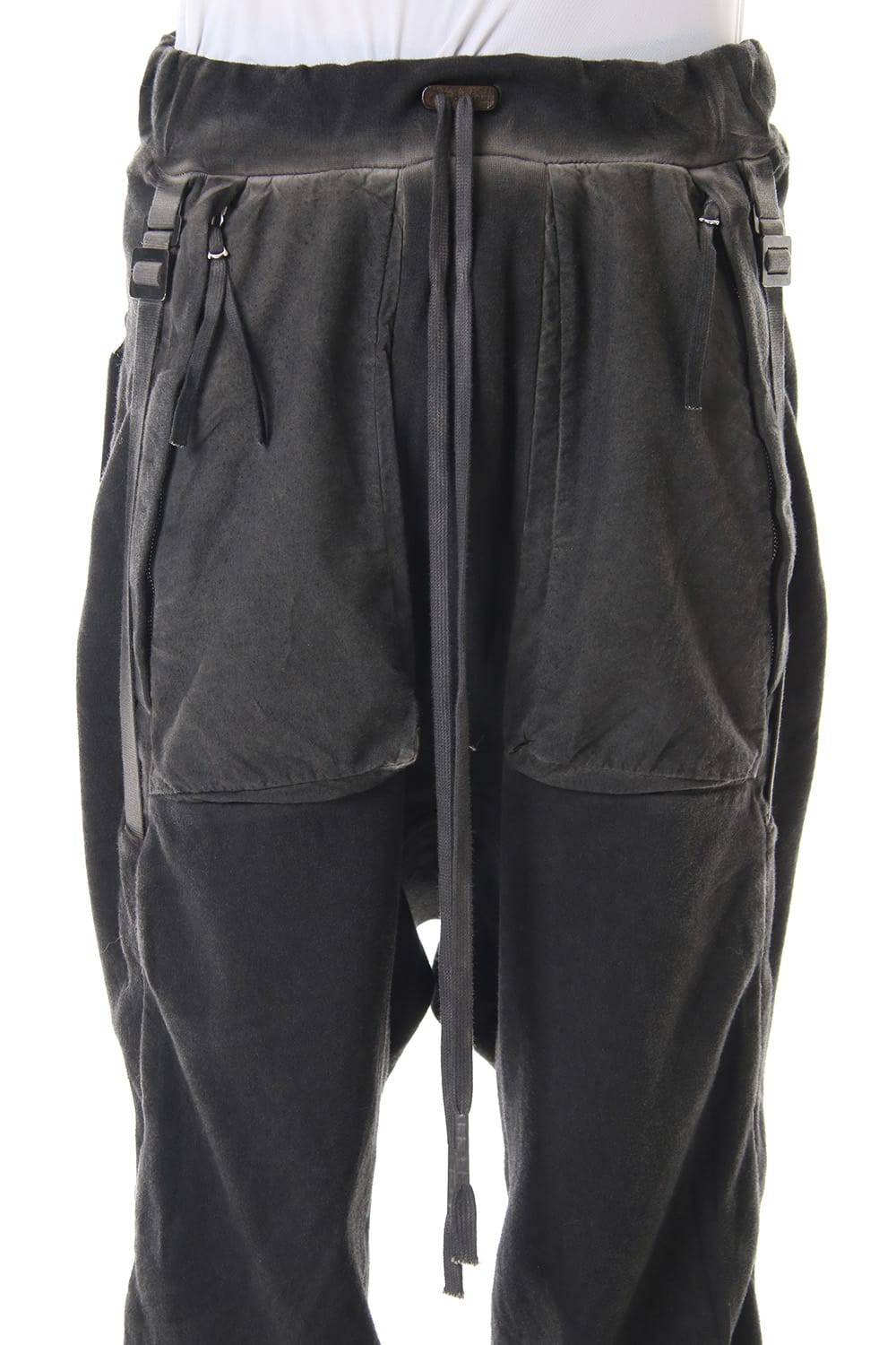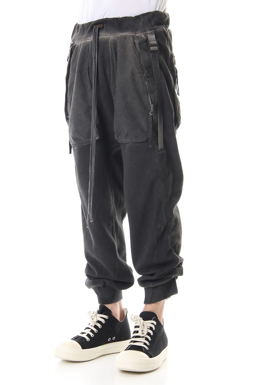 Sweat pants with details like of biker pants and jogger pants. There is a belt that connects from the upper part of the pocket to the inside of the hem, you can change the length by adjusting the length of the belt. The length can be adjusted depending on the balance between the shoes type and the top, the cotton material can be worn in any season.