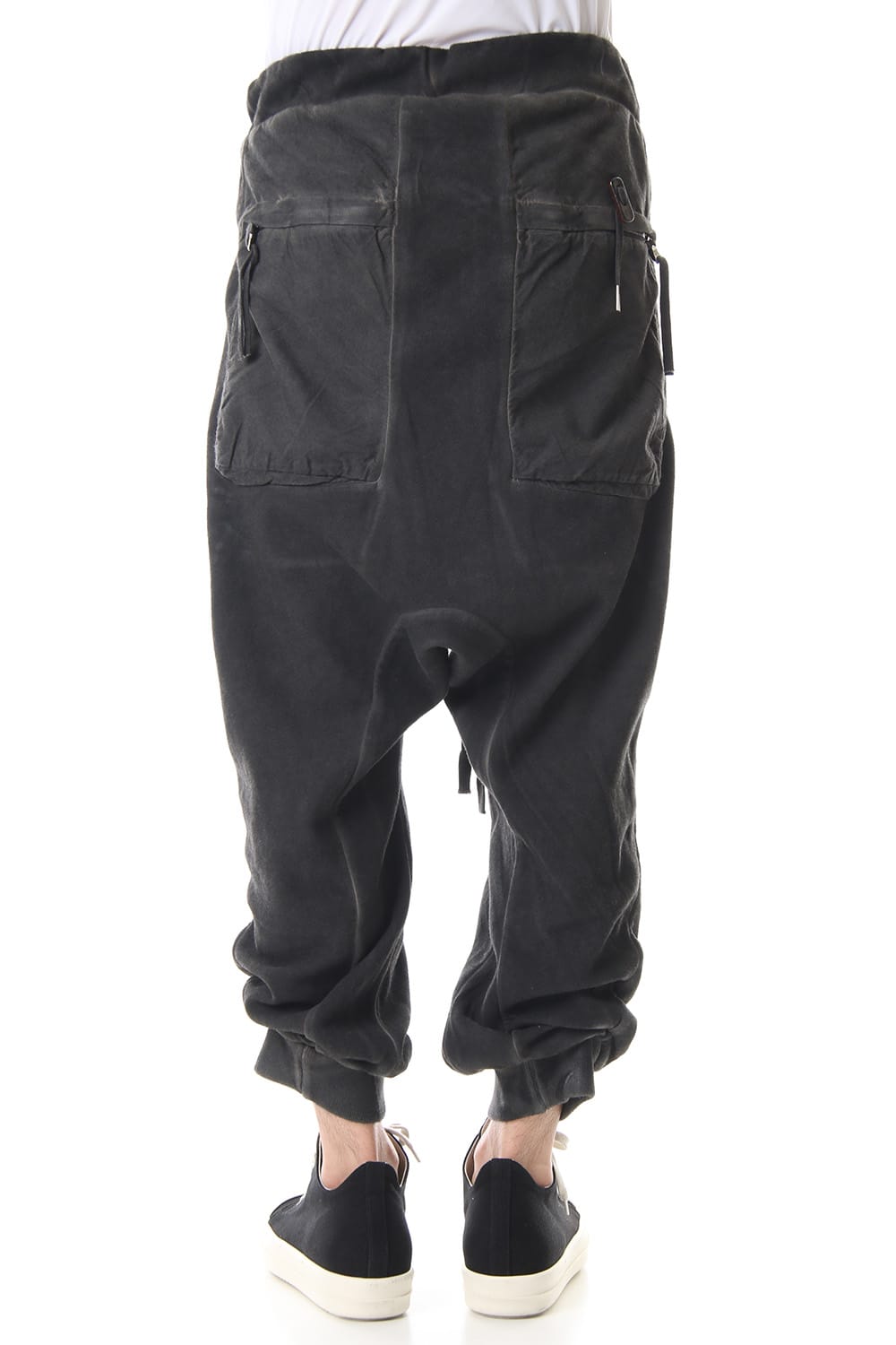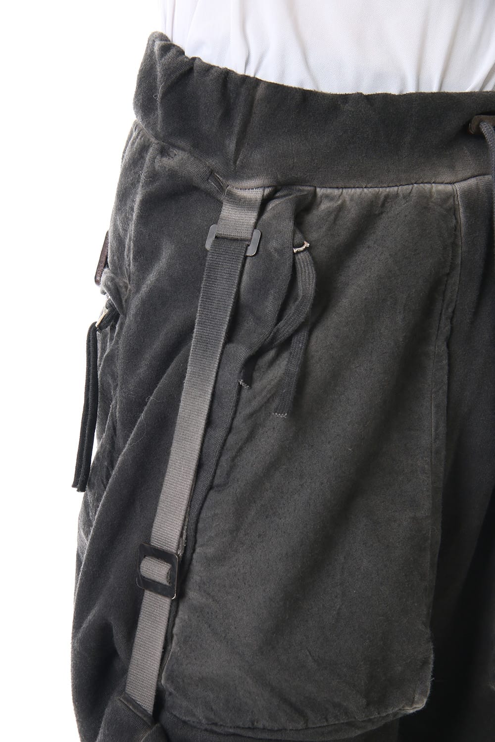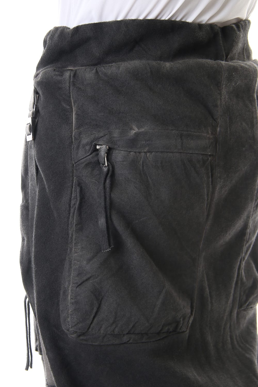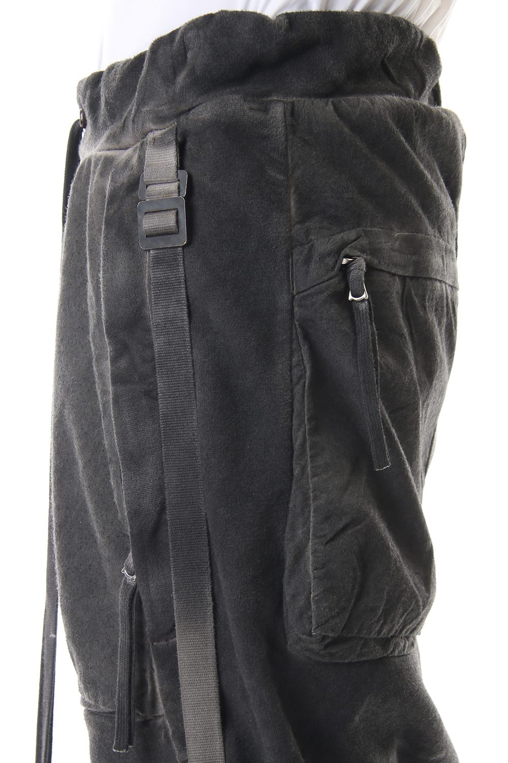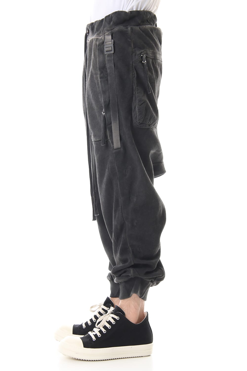 Sweat pants with details like of biker pants and jogger pants. There is a belt that connects from the upper part of the pocket to the inside of the hem, you can change the length by adjusting the length of the belt. The length can be adjusted depending on the balance between the shoes type and the top, the cotton material can be worn in any season.
