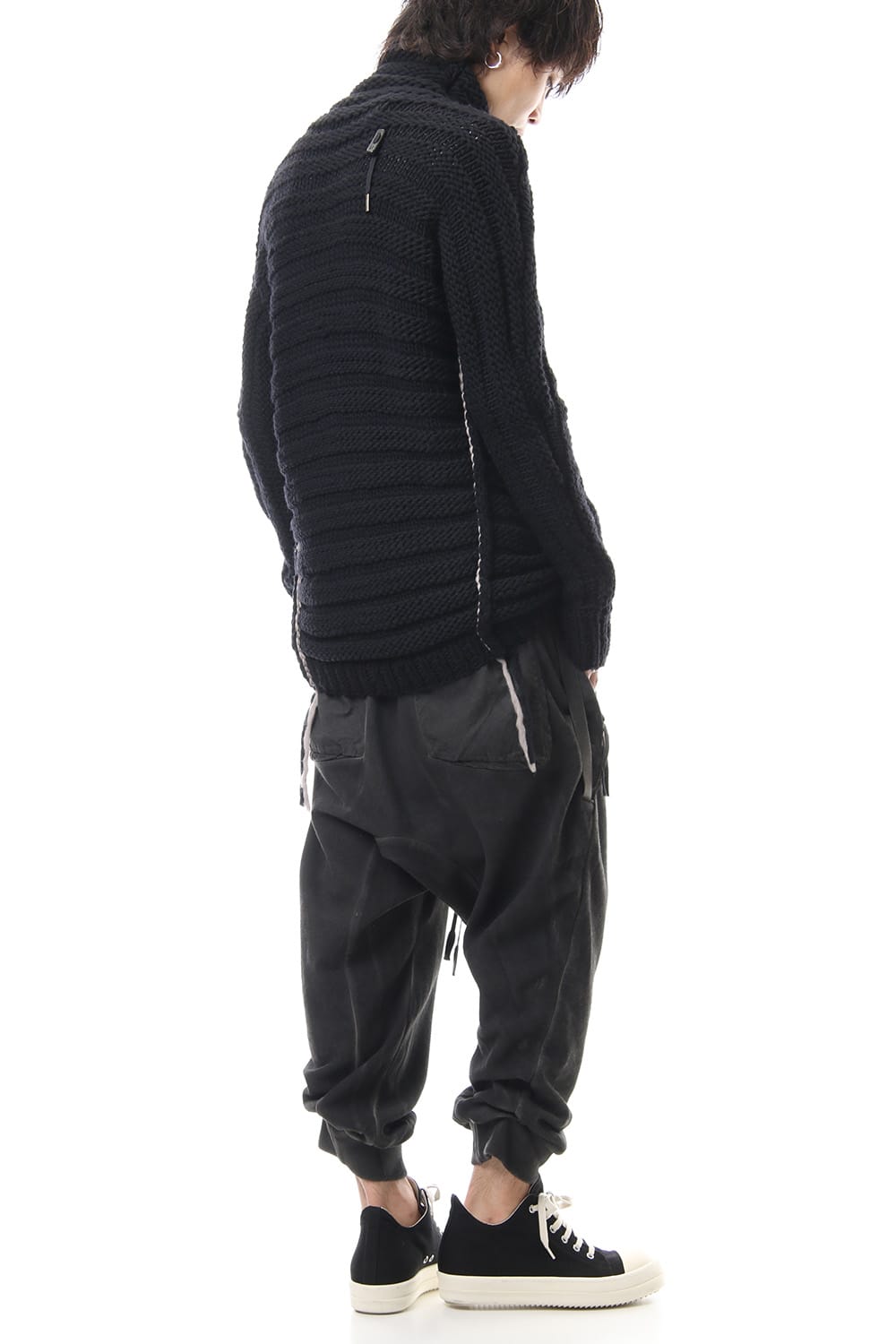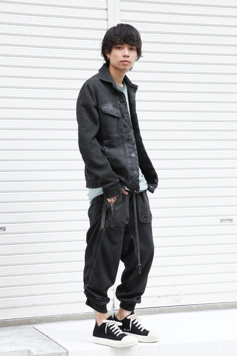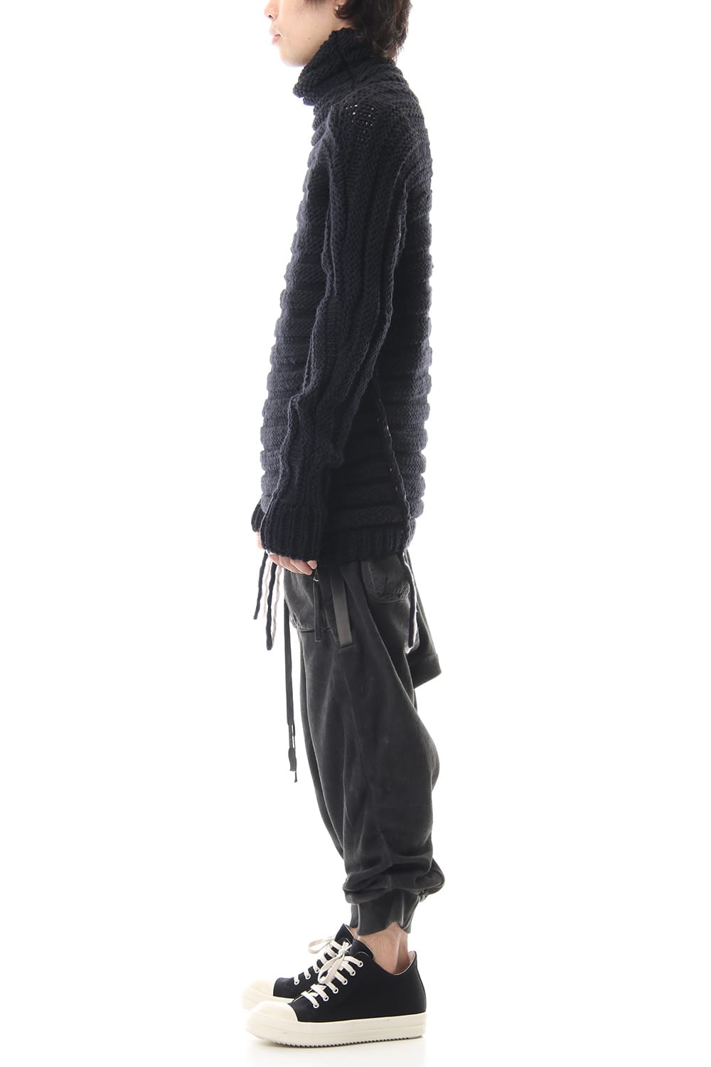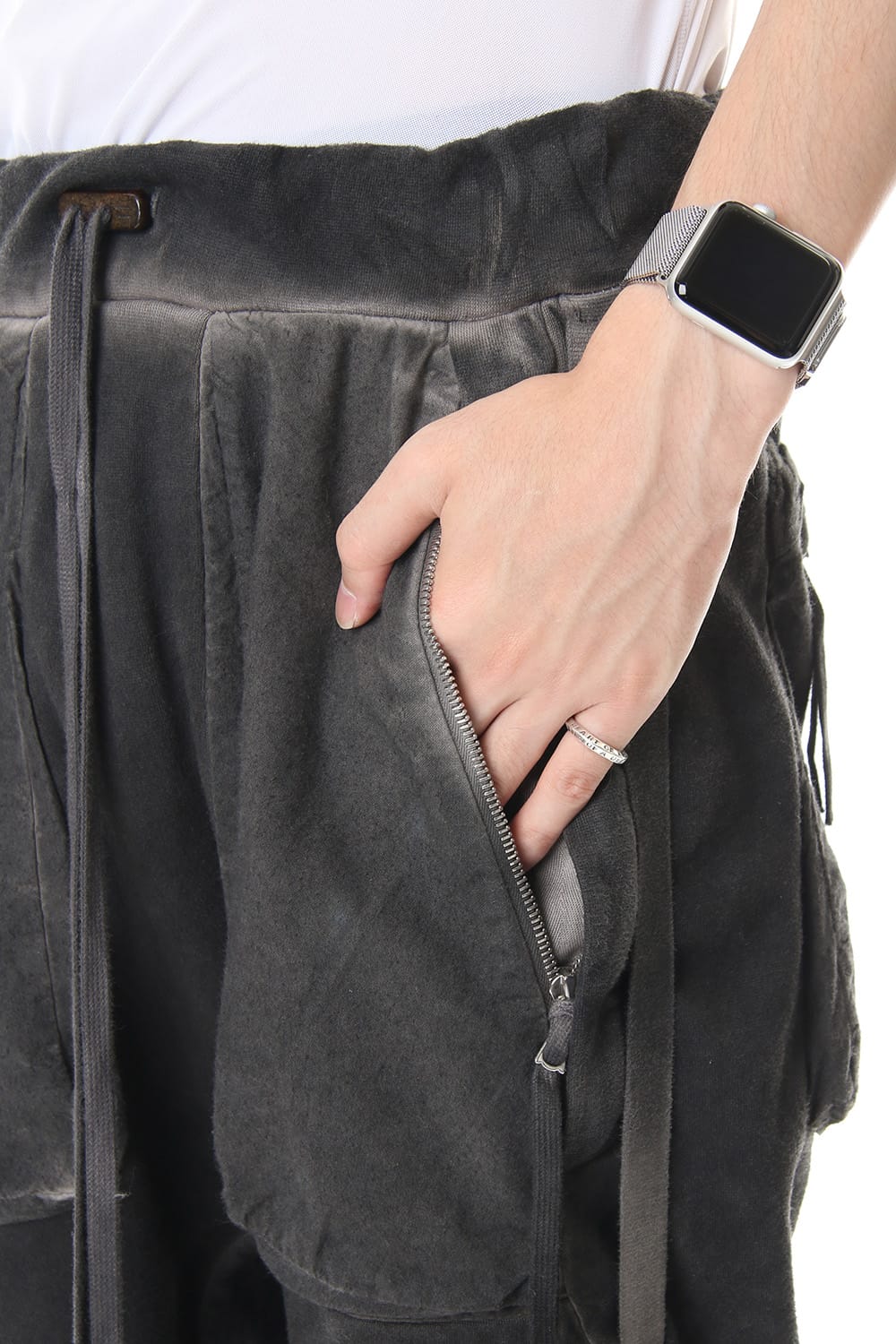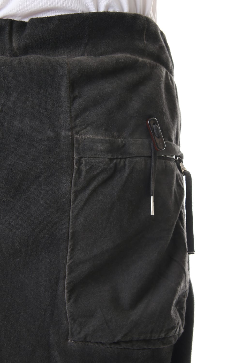 Sweat pants with details like of biker pants and jogger pants. There is a belt that connects from the upper part of the pocket to the inside of the hem, you can change the length by adjusting the length of the belt. The length can be adjusted depending on the balance between the shoes type and the top, the cotton material can be worn in any season.