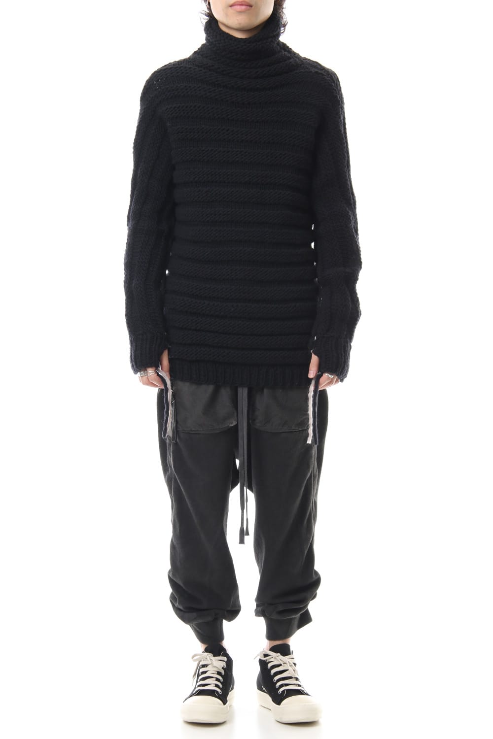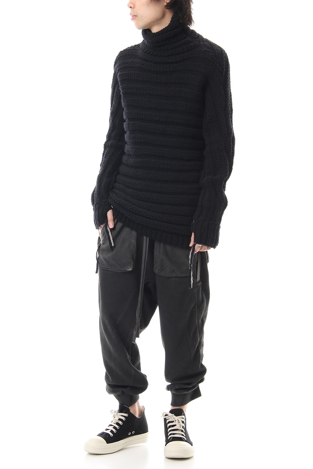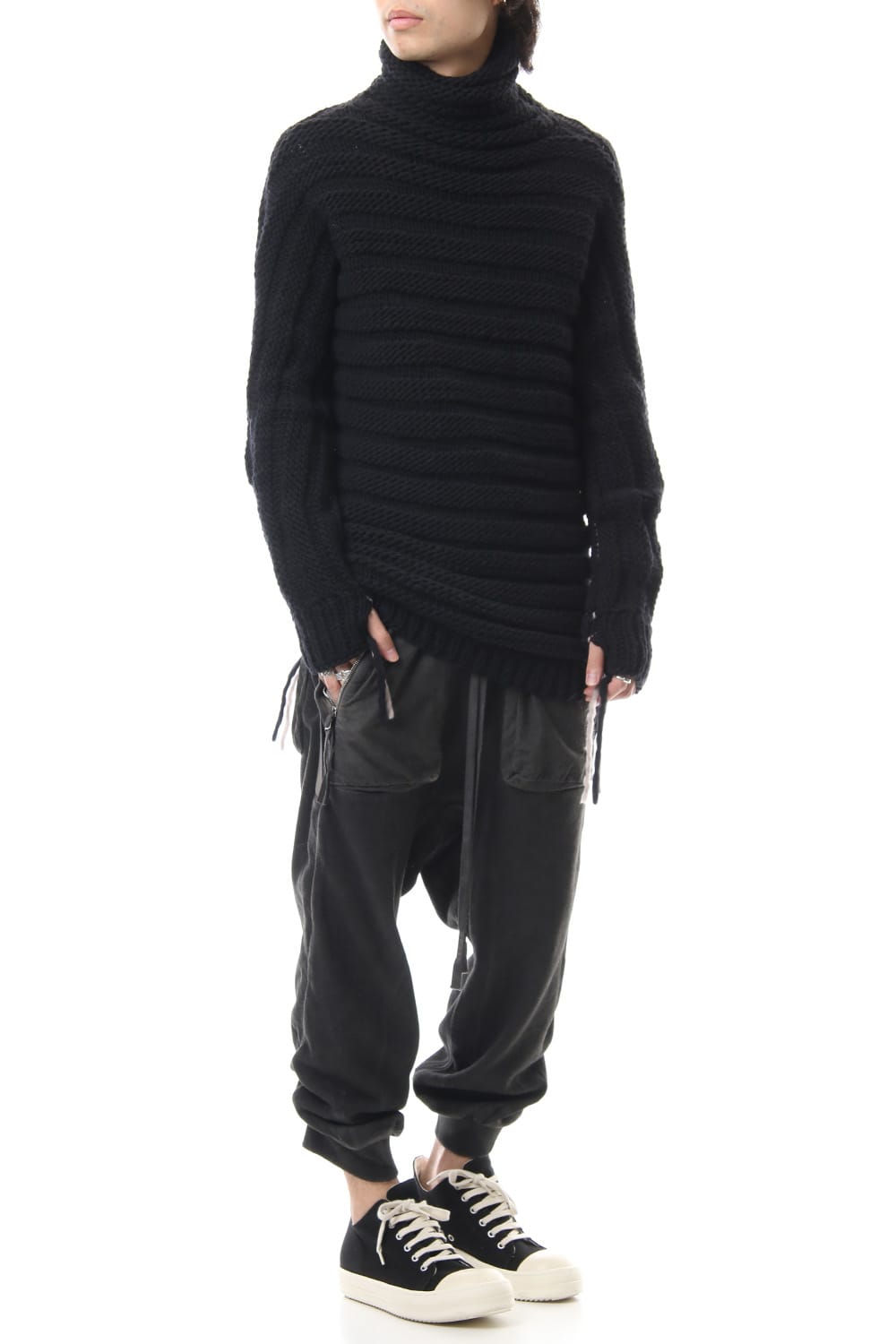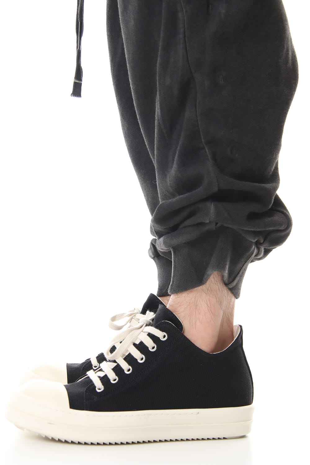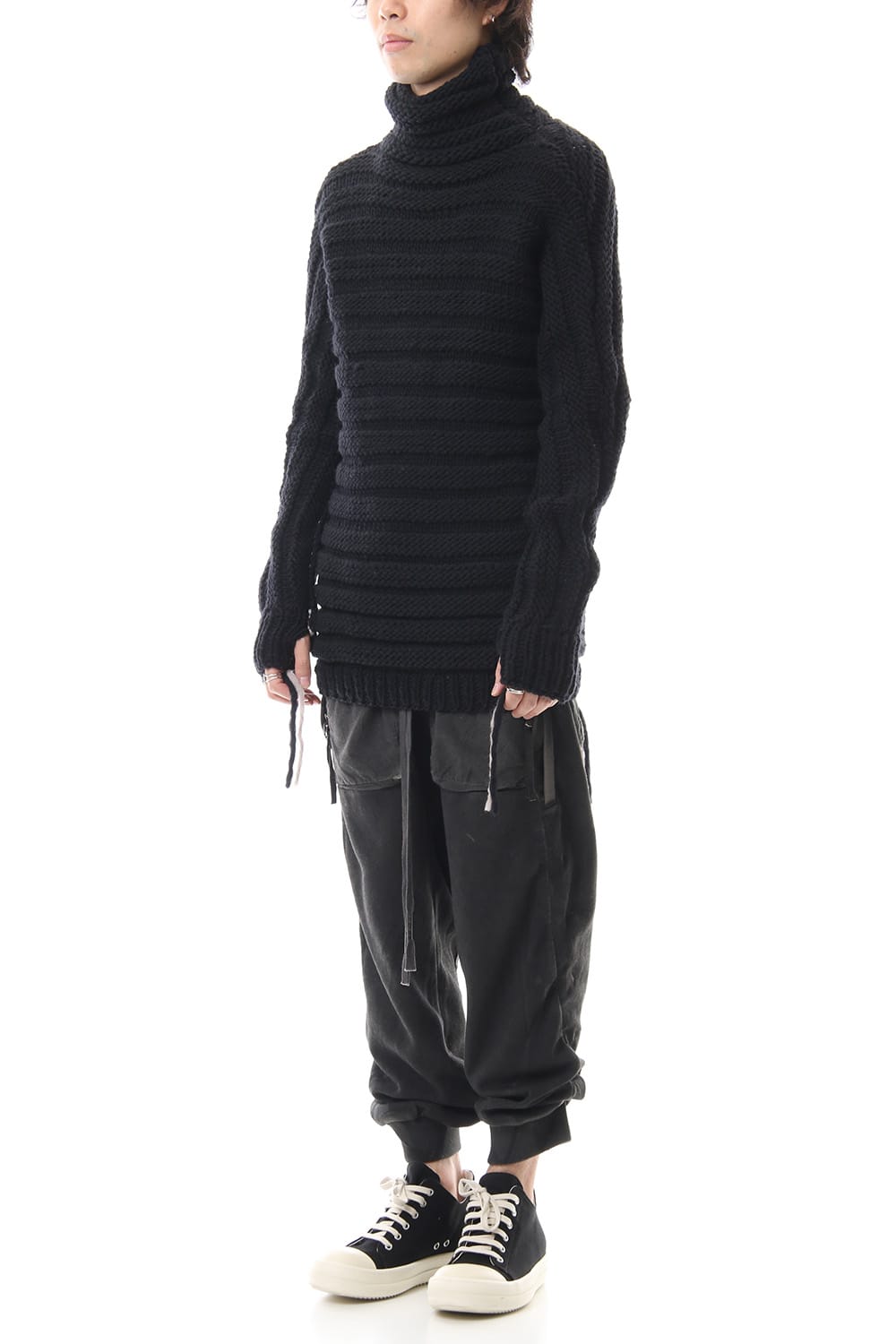 Sweat pants with details like of biker pants and jogger pants. There is a belt that connects from the upper part of the pocket to the inside of the hem, you can change the length by adjusting the length of the belt. The length can be adjusted depending on the balance between the shoes type and the top, the cotton material can be worn in any season.