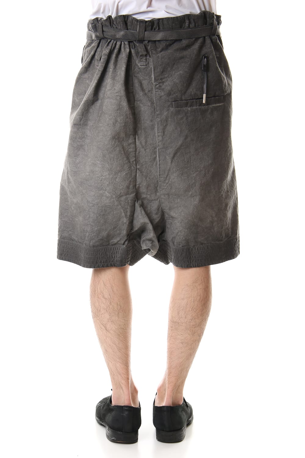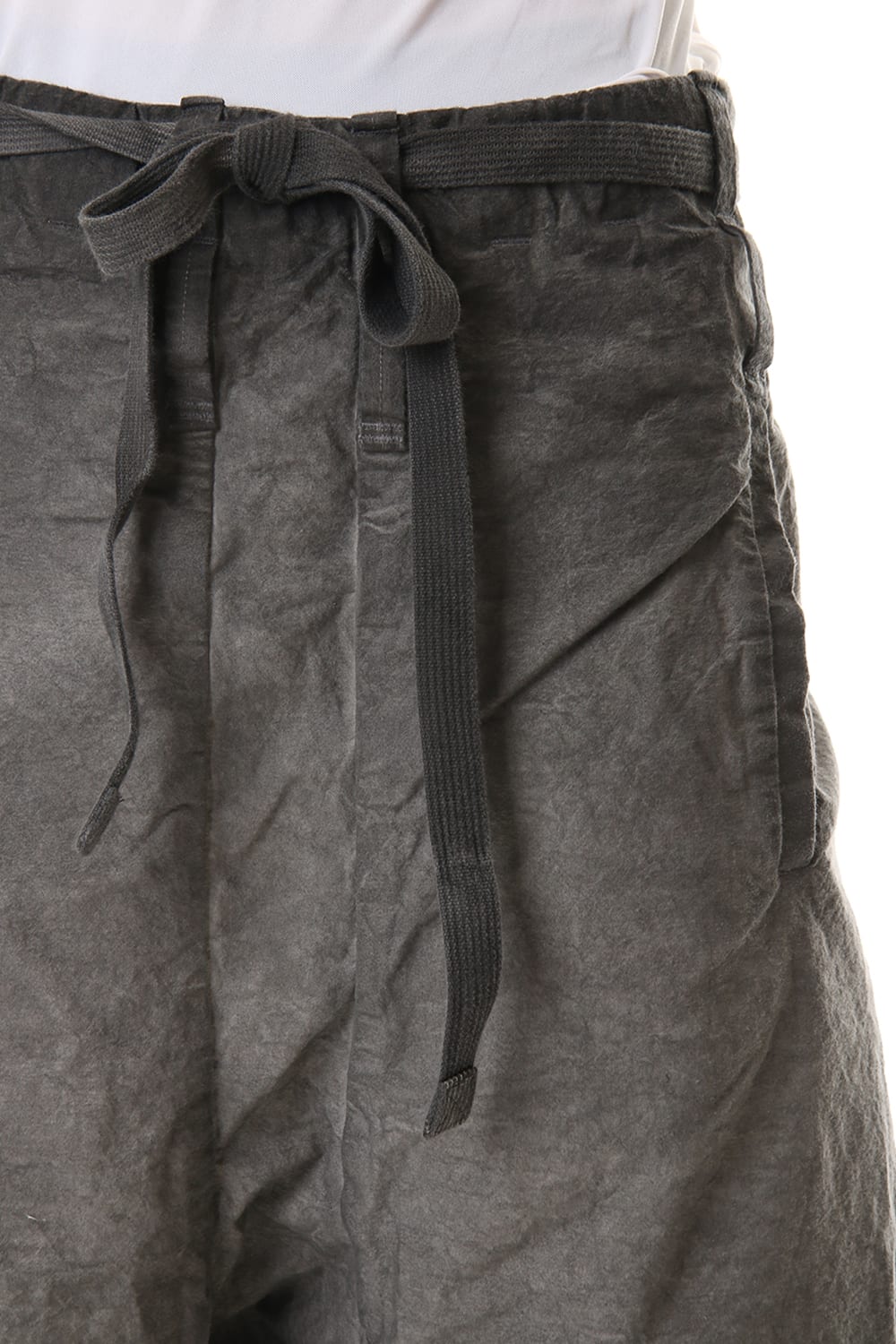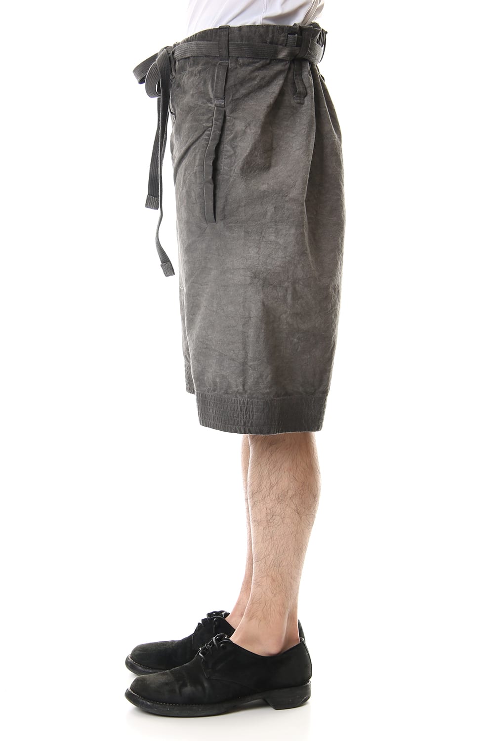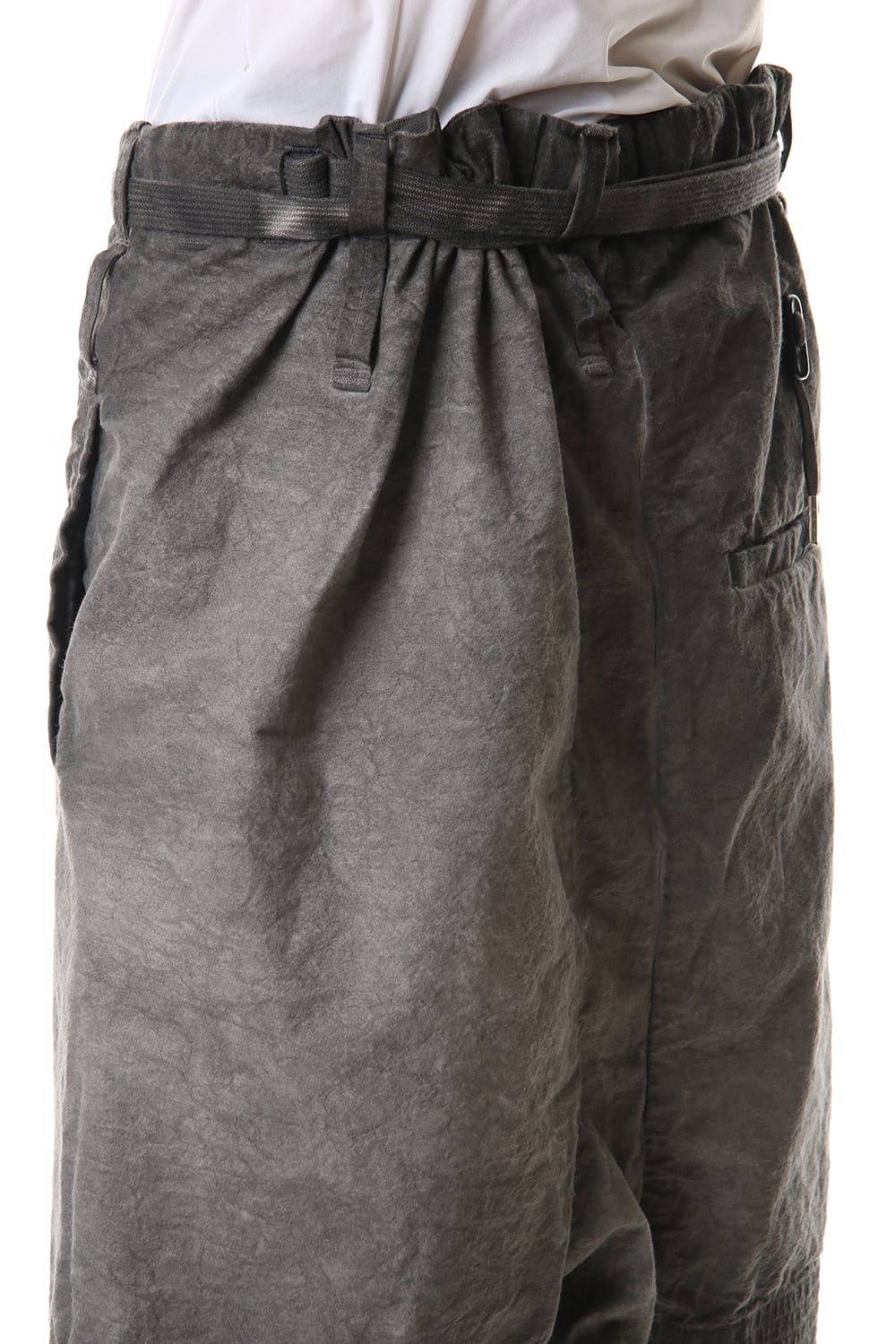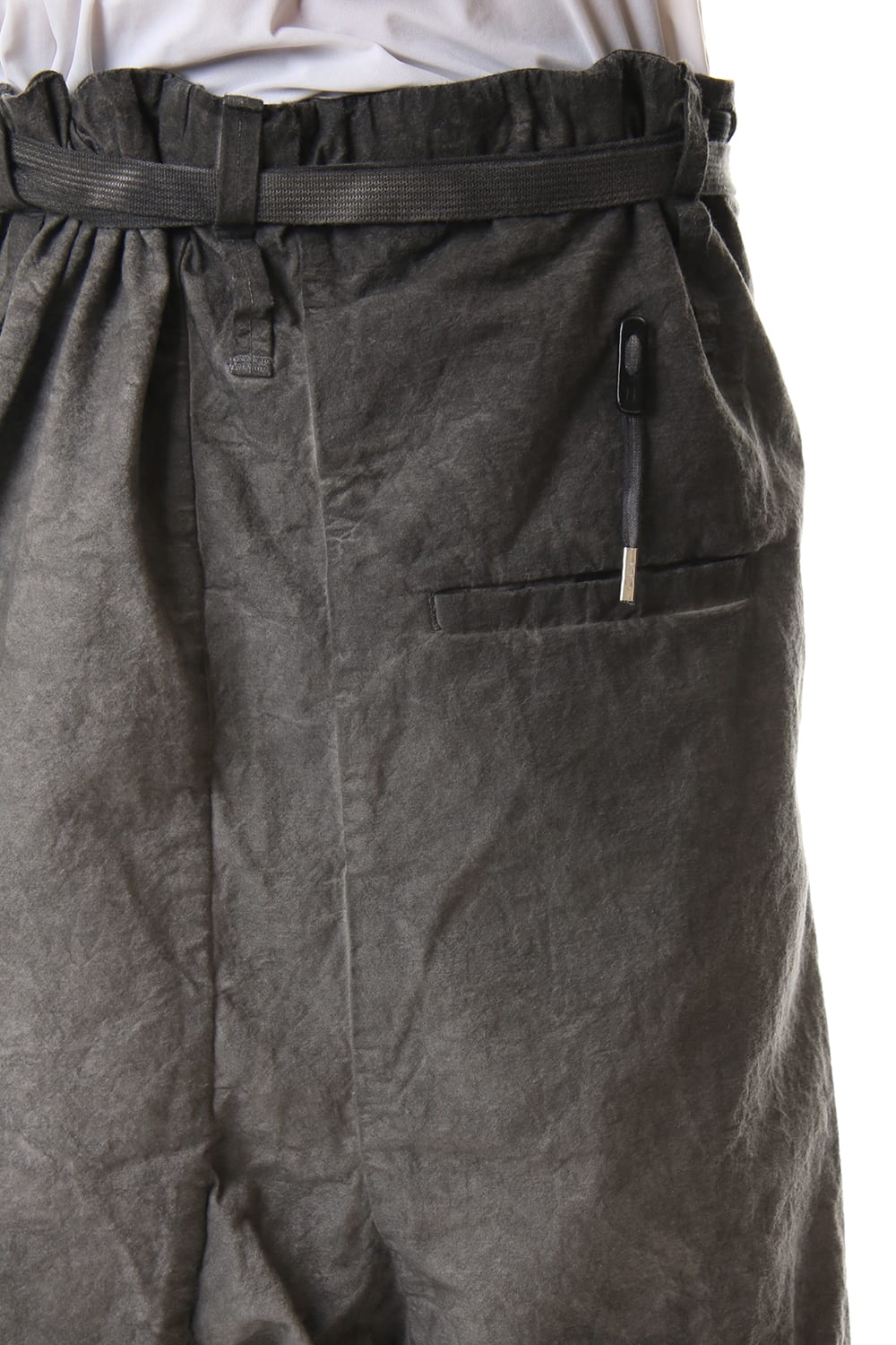 This is a pair of half pants with a wide silhouette that has a silhouette that spreads out due to the elastic cotton poplin fabric and the stitching on the hem. The waist is slightly large and the draw cord on the waist has a unique mechanism that allows it to fit inside the waist belt at both sides.