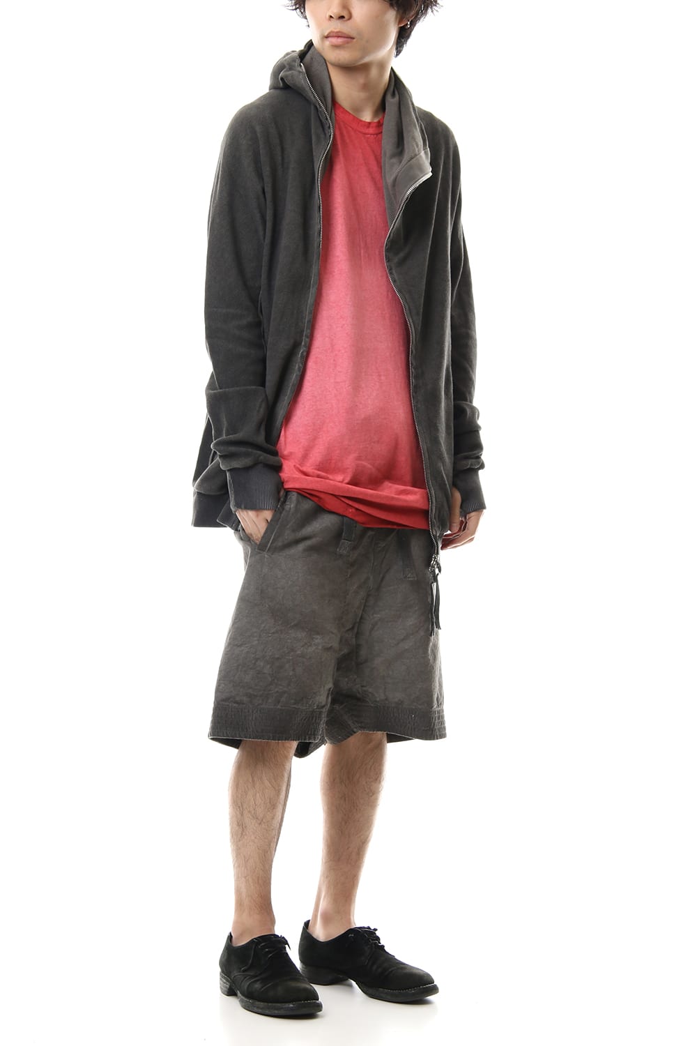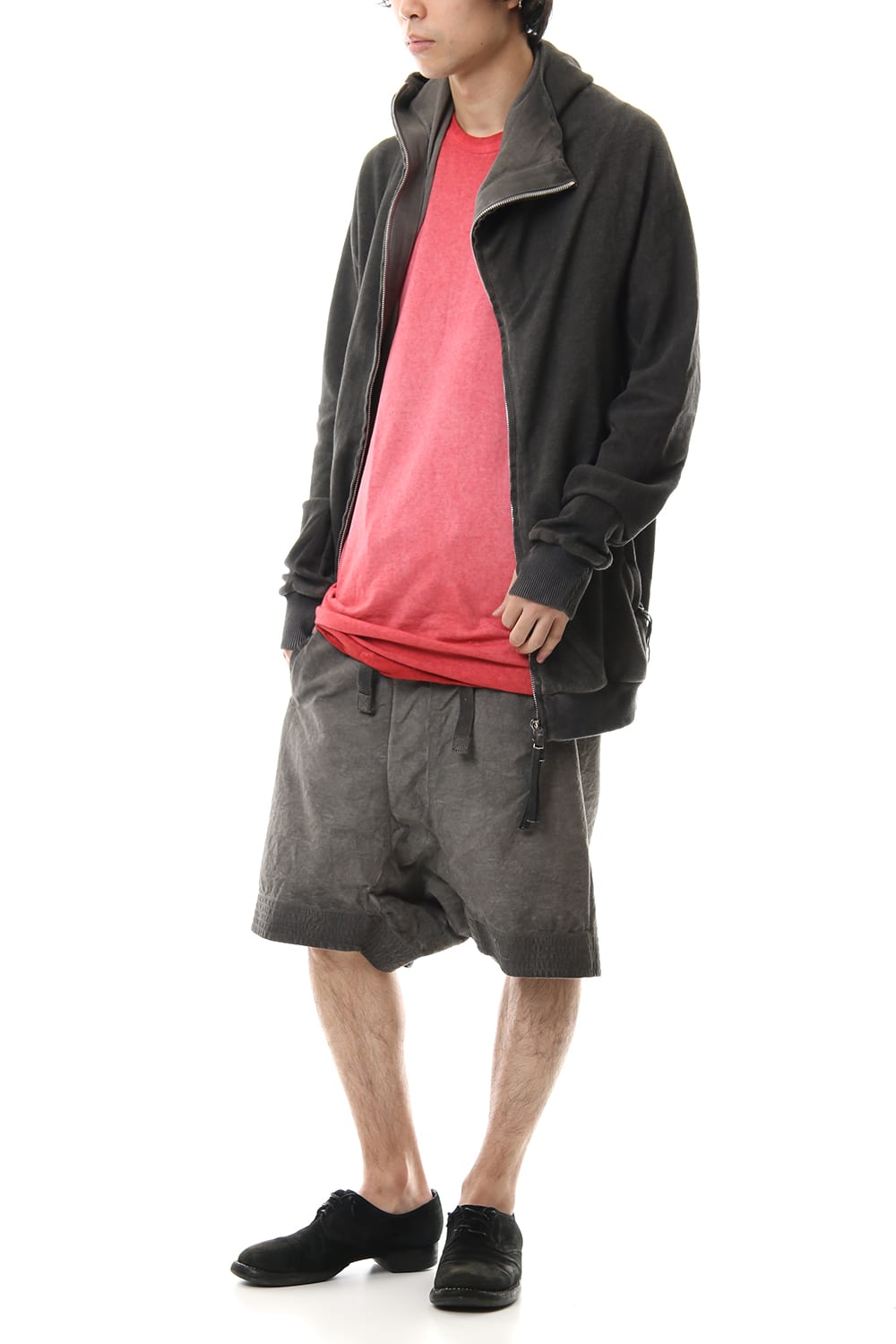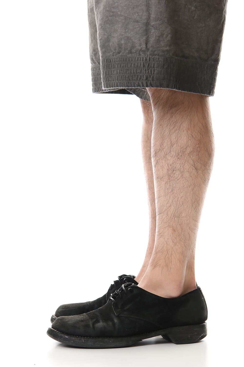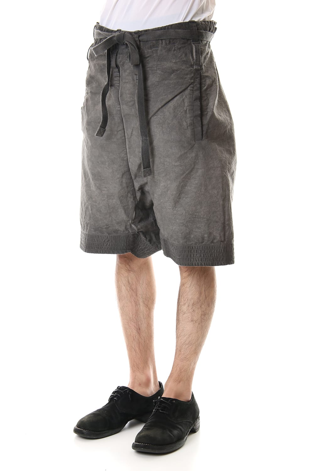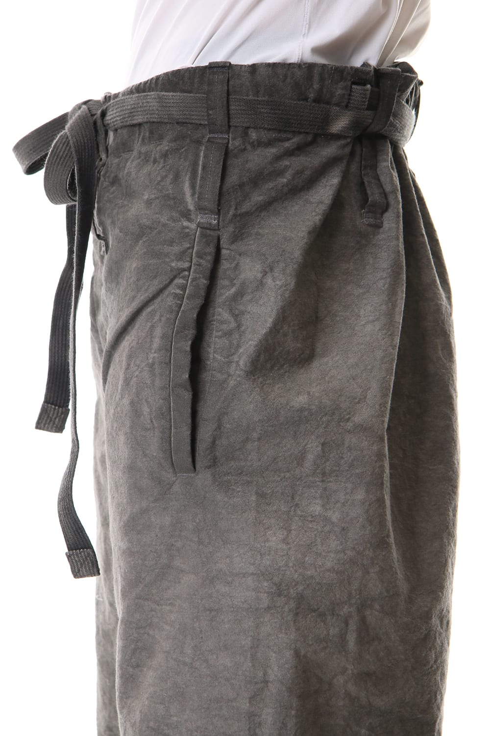 This is a pair of half pants with a wide silhouette that has a silhouette that spreads out due to the elastic cotton poplin fabric and the stitching on the hem. The waist is slightly large and the draw cord on the waist has a unique mechanism that allows it to fit inside the waist belt at both sides.