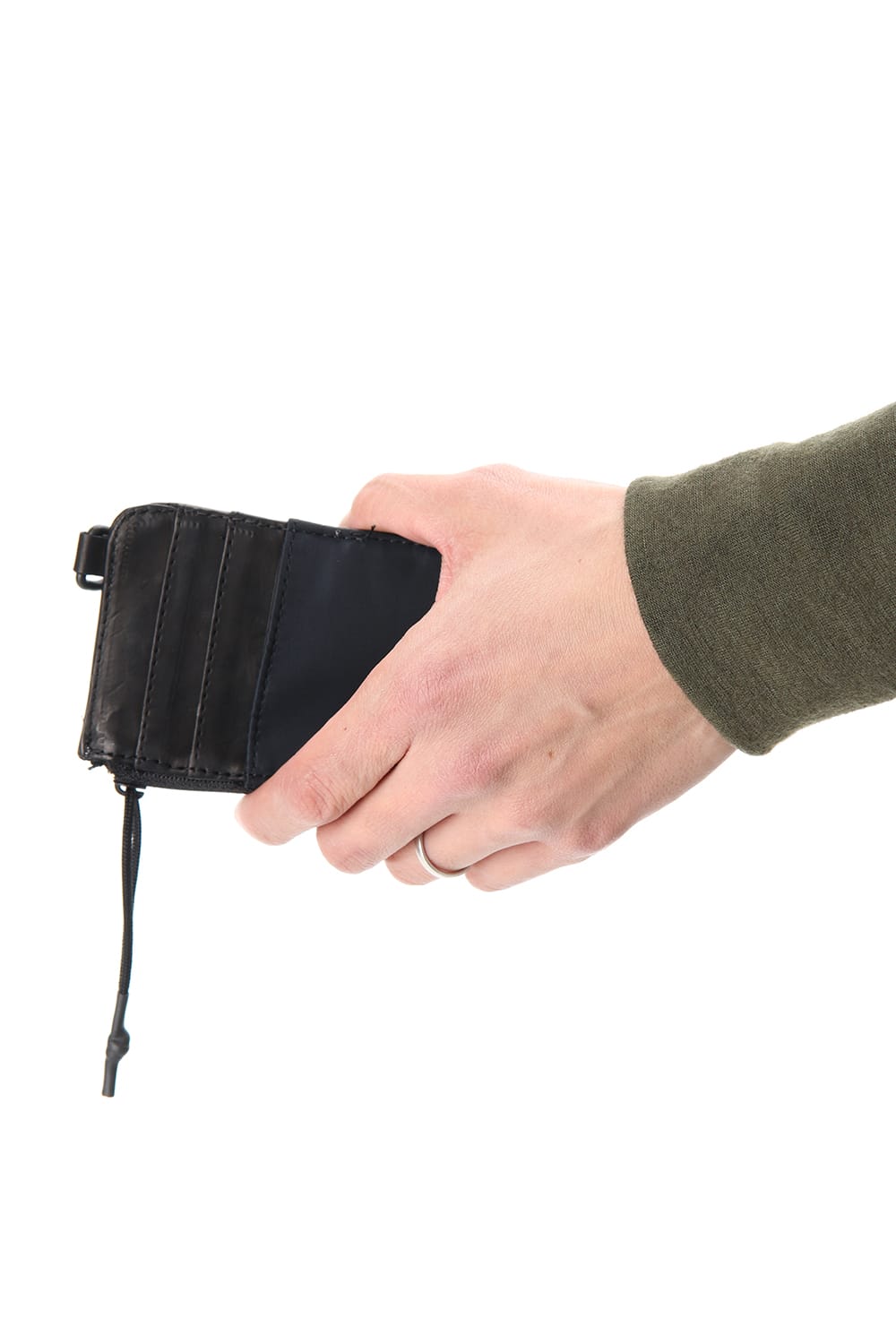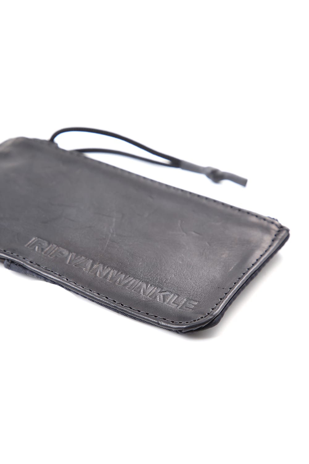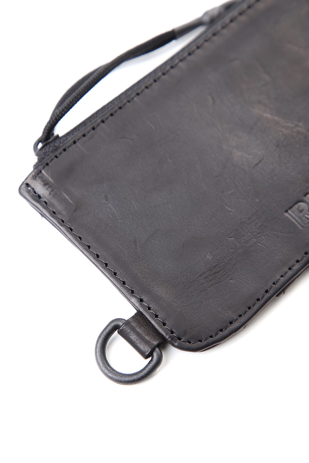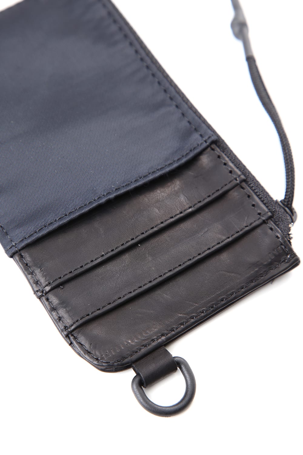 This multi-case is made from domestic raw leather (Leather of 3-month-old calves from Hokkaido). This item is a combination of calf leather and heavy nylon twill. It can also store credit/debit cards. Comes with a ring that can be worn with a neck strap cord.