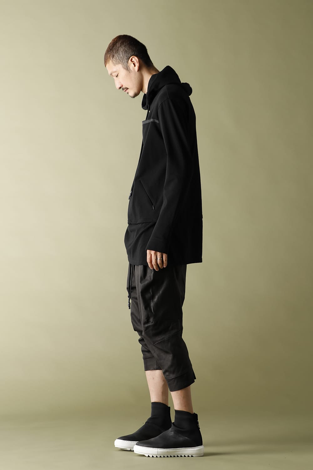 Layered hoodie with slit with concealed pockets and thumb holes.