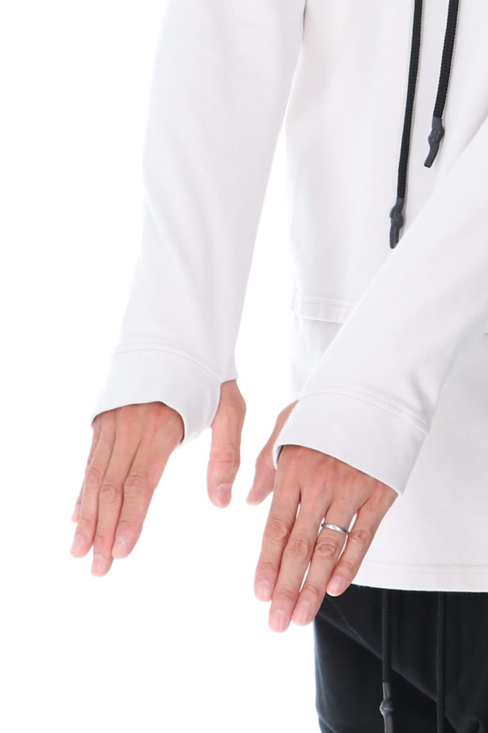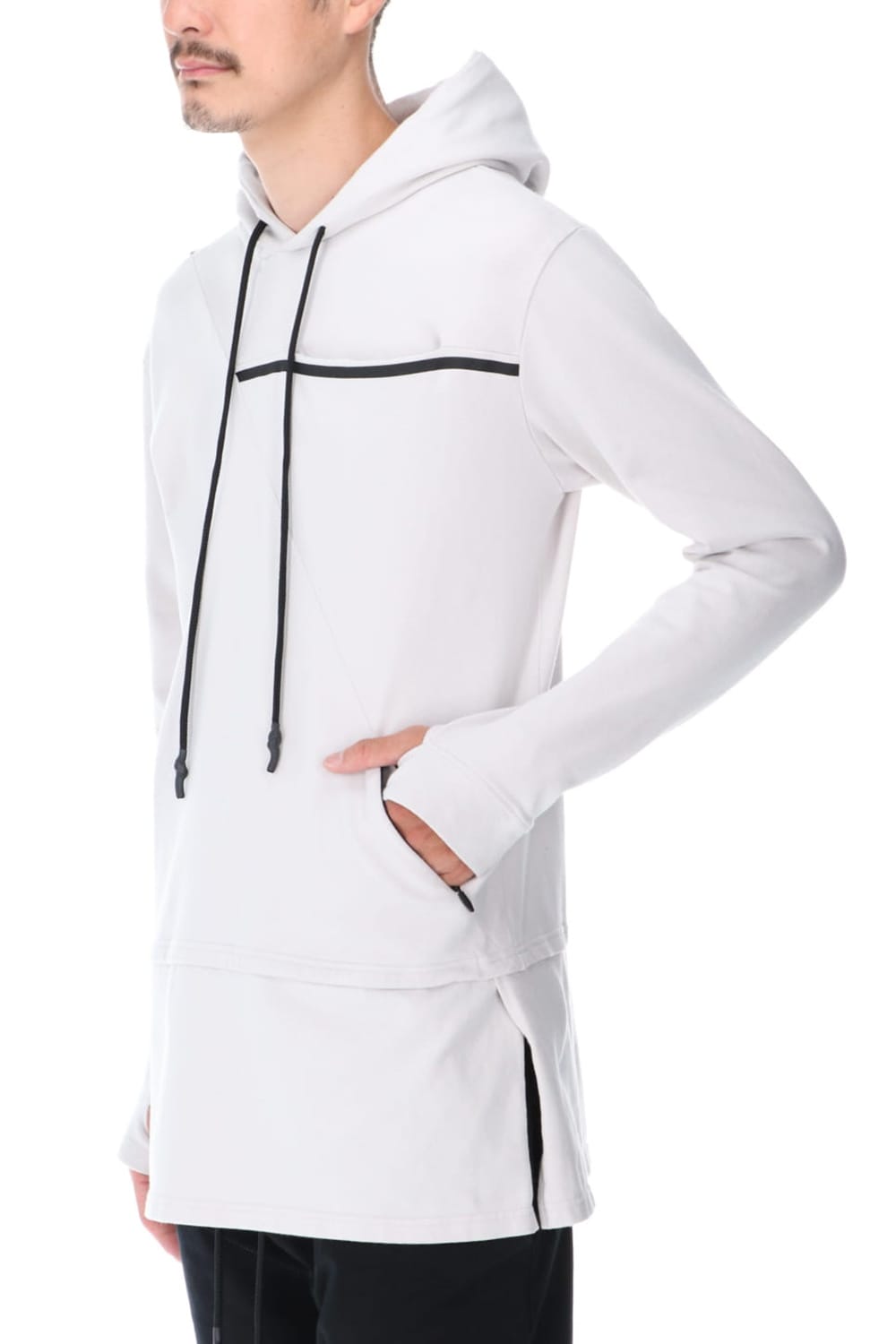 Layered hoodie with slit with concealed pockets and thumb holes.