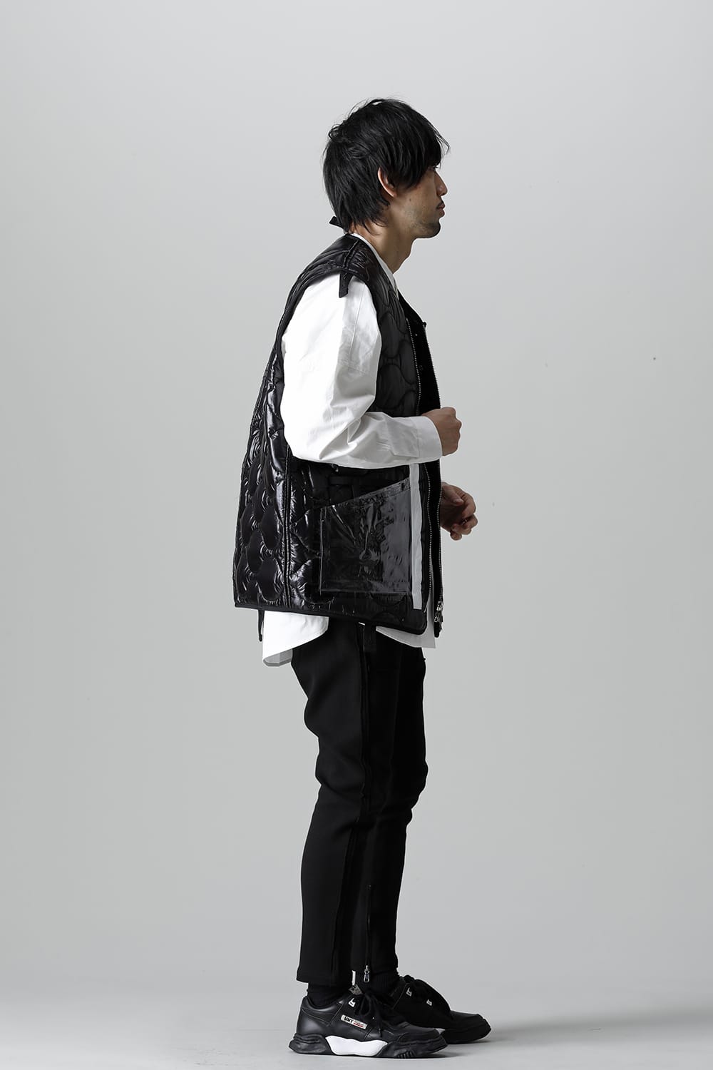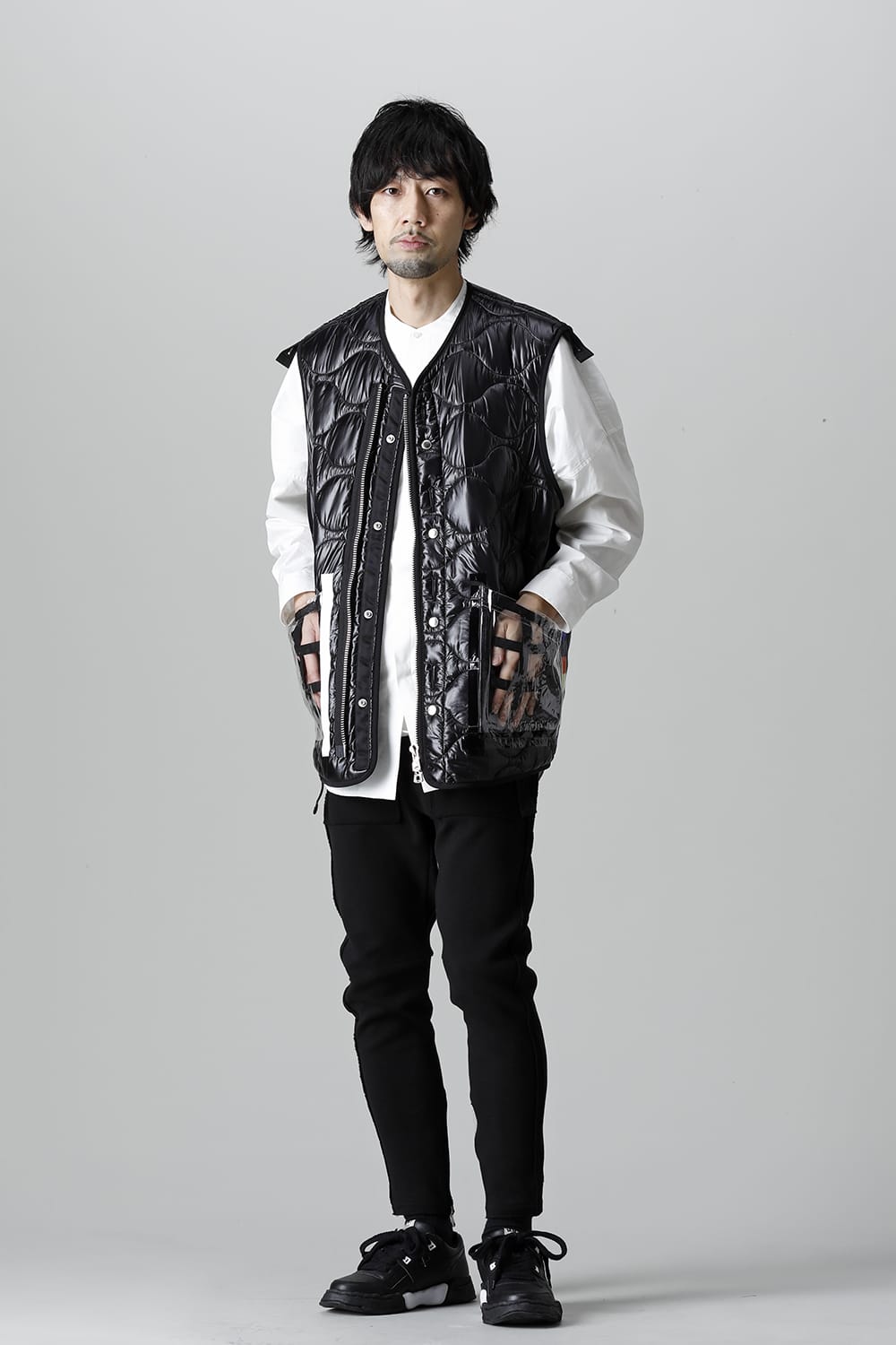 This item is characterized by the vertical arrangement of buttons ,button holes and the front zip design. The PVC and tape designs that have appeared in many shows are used as details, and the oversized gives it a casual look.