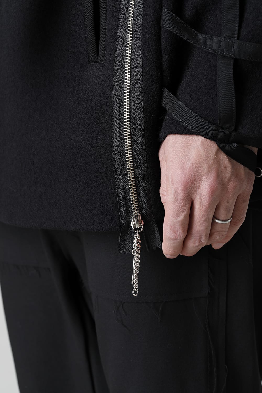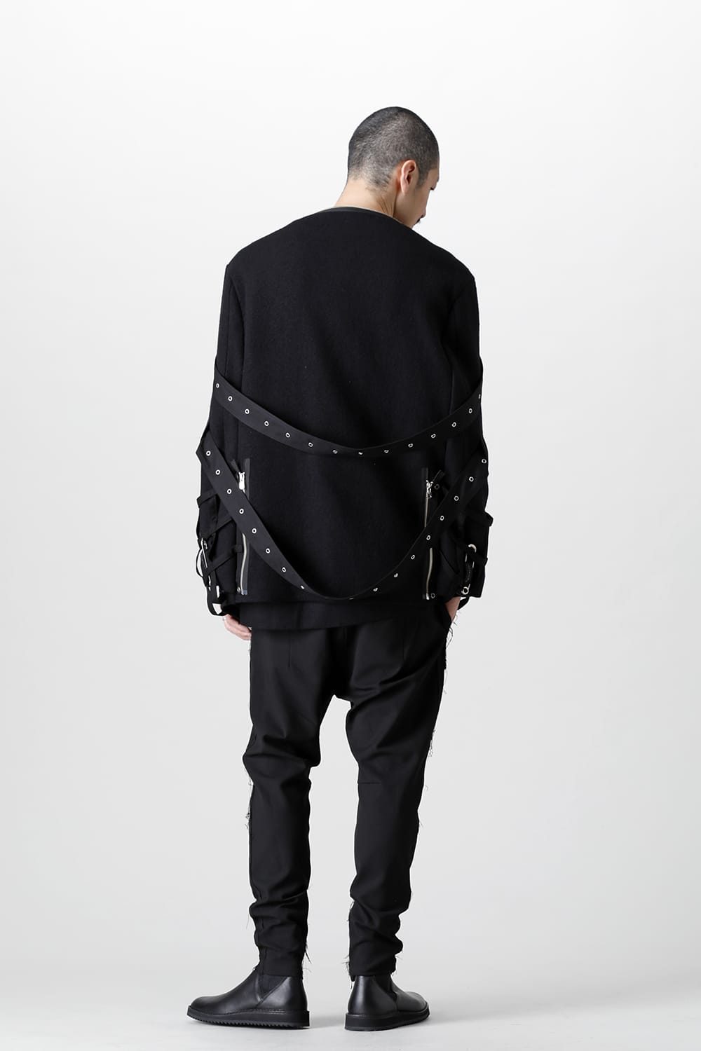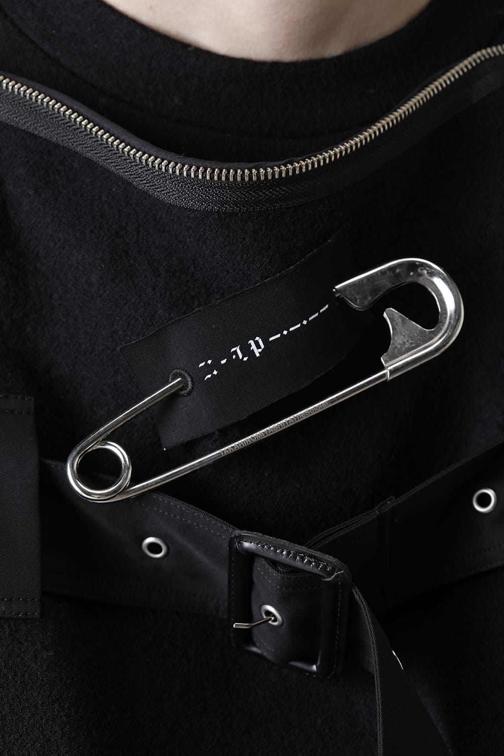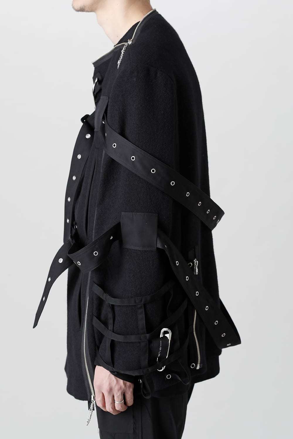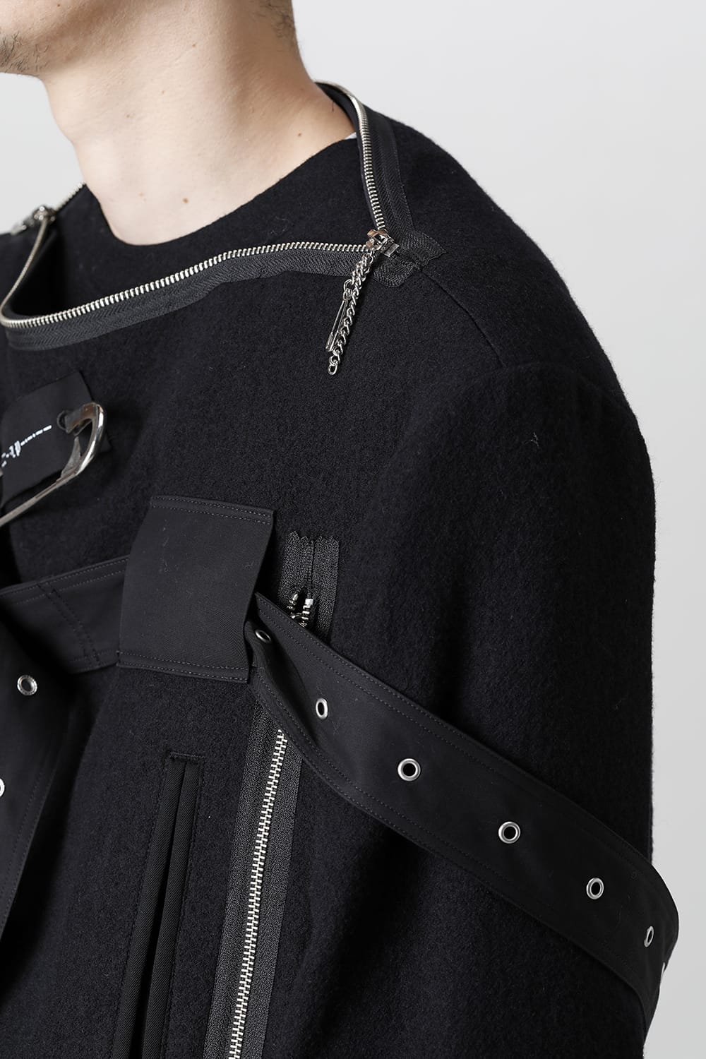 A boat neck wool jacket based on a cape design. By removing the belt that covers the body and opening and closing the front zip and back hem zip, you can style in several patterns. The design and high heat retention are attractive. Comes with 3 safety pins with the theme.