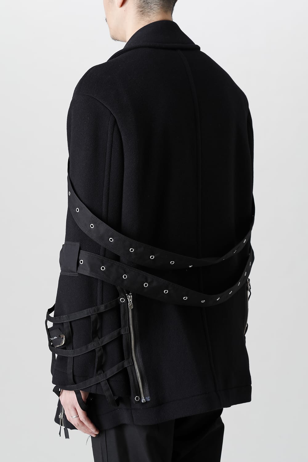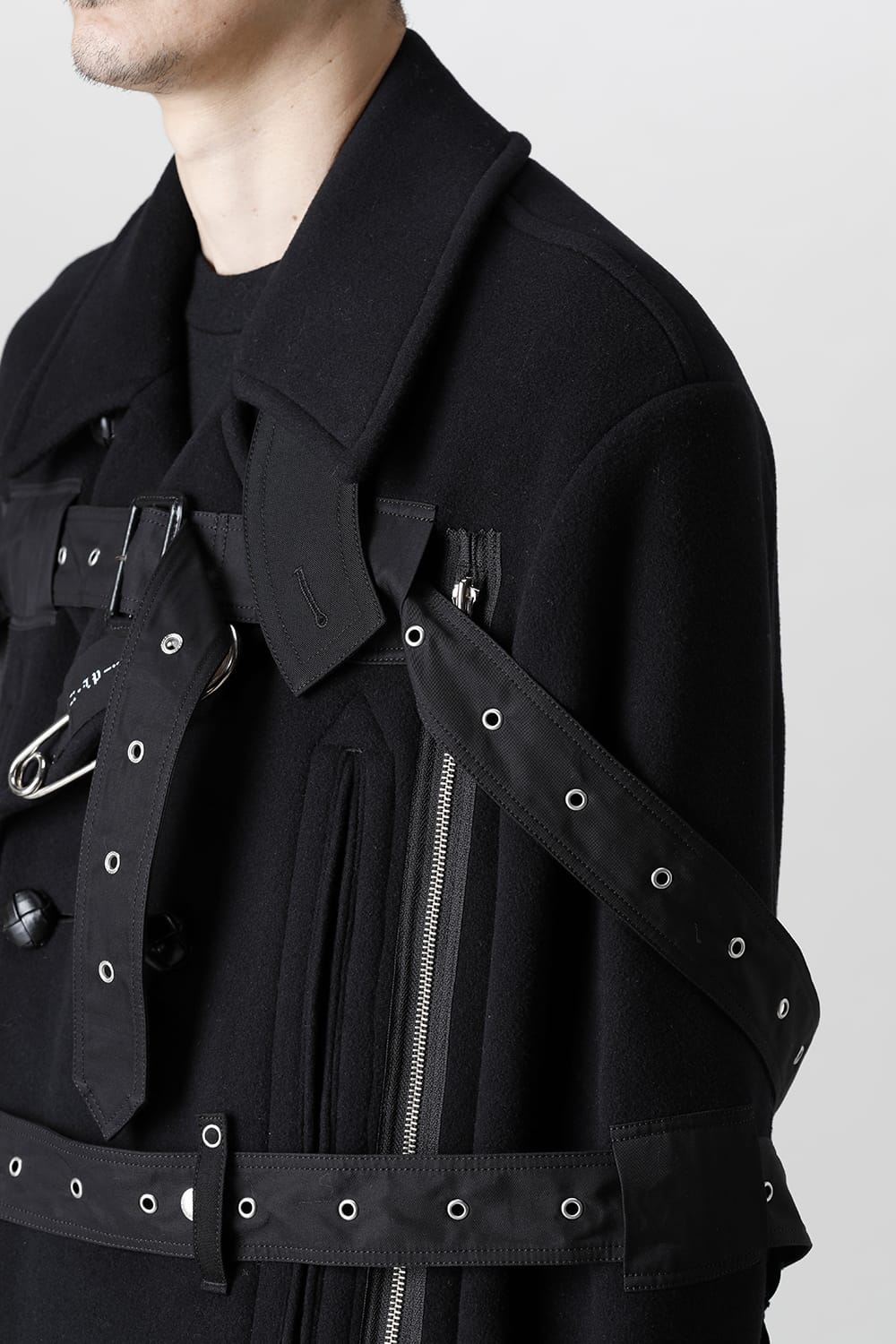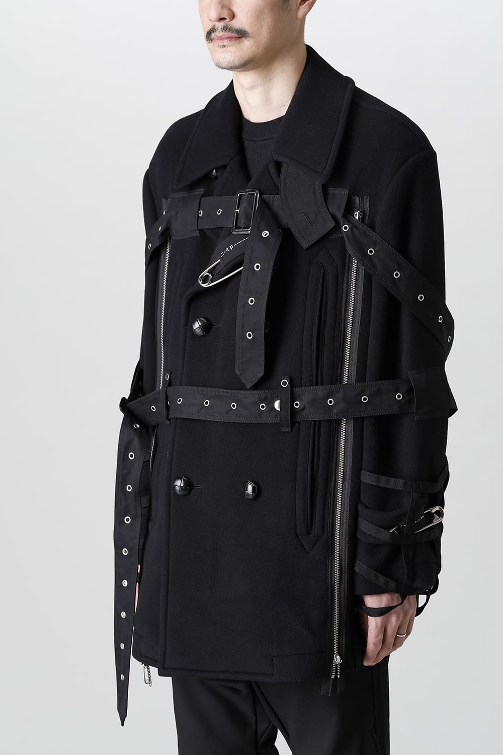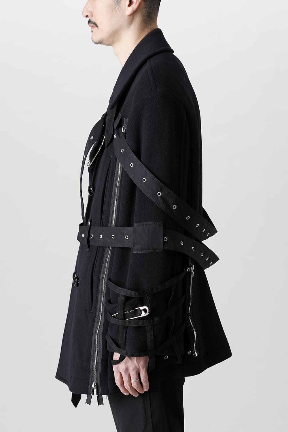 A P-coat made of cashmere blend wool based on a cape design. By removing the belt that covers the body and opening and closing the front zip and back hem zip, you can style in several patterns. The design and high heat retention are attractive. Comes with 3 safety pins with the theme.