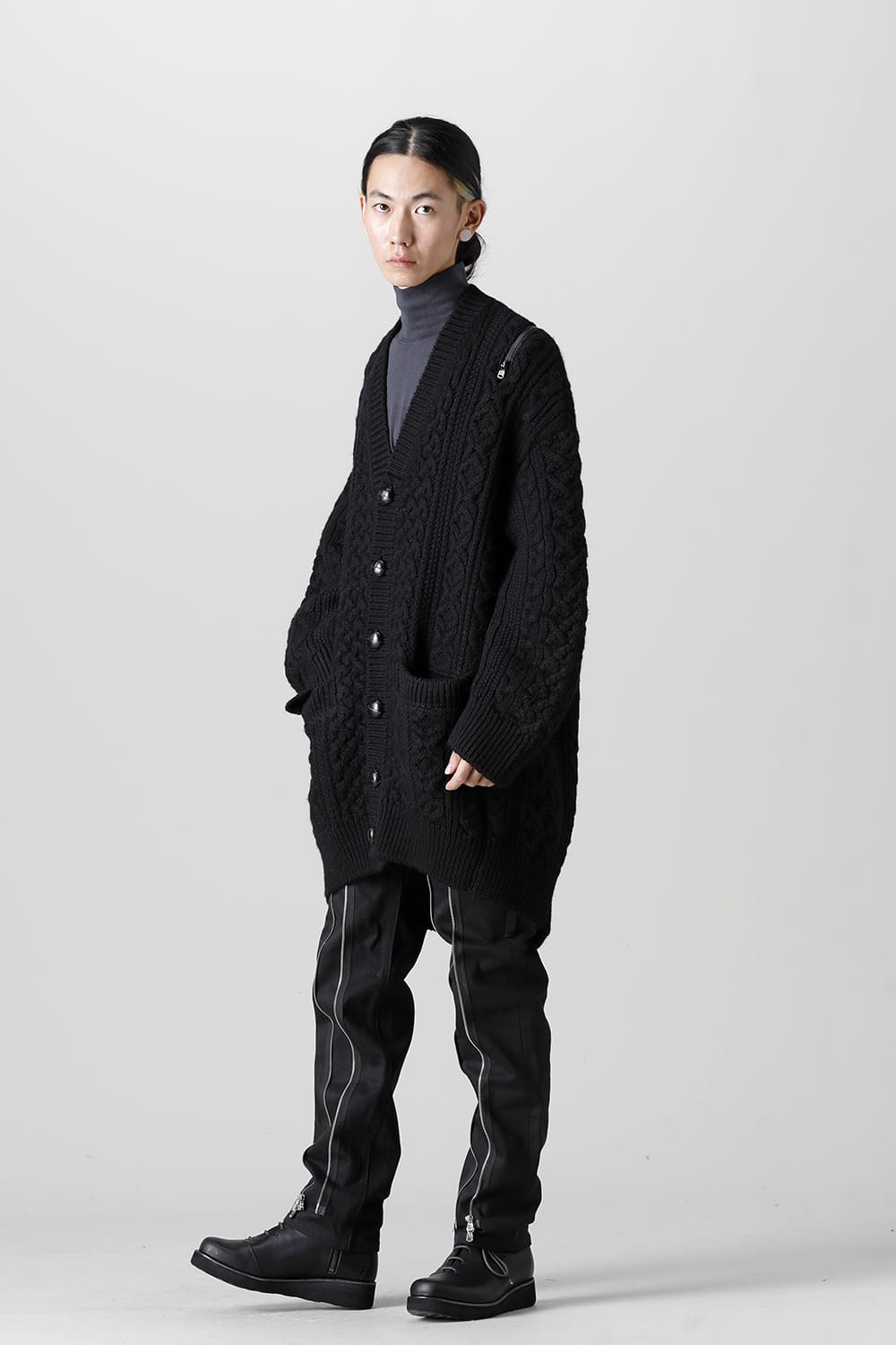 double zip balloon shaped aran pattern cardigan Black