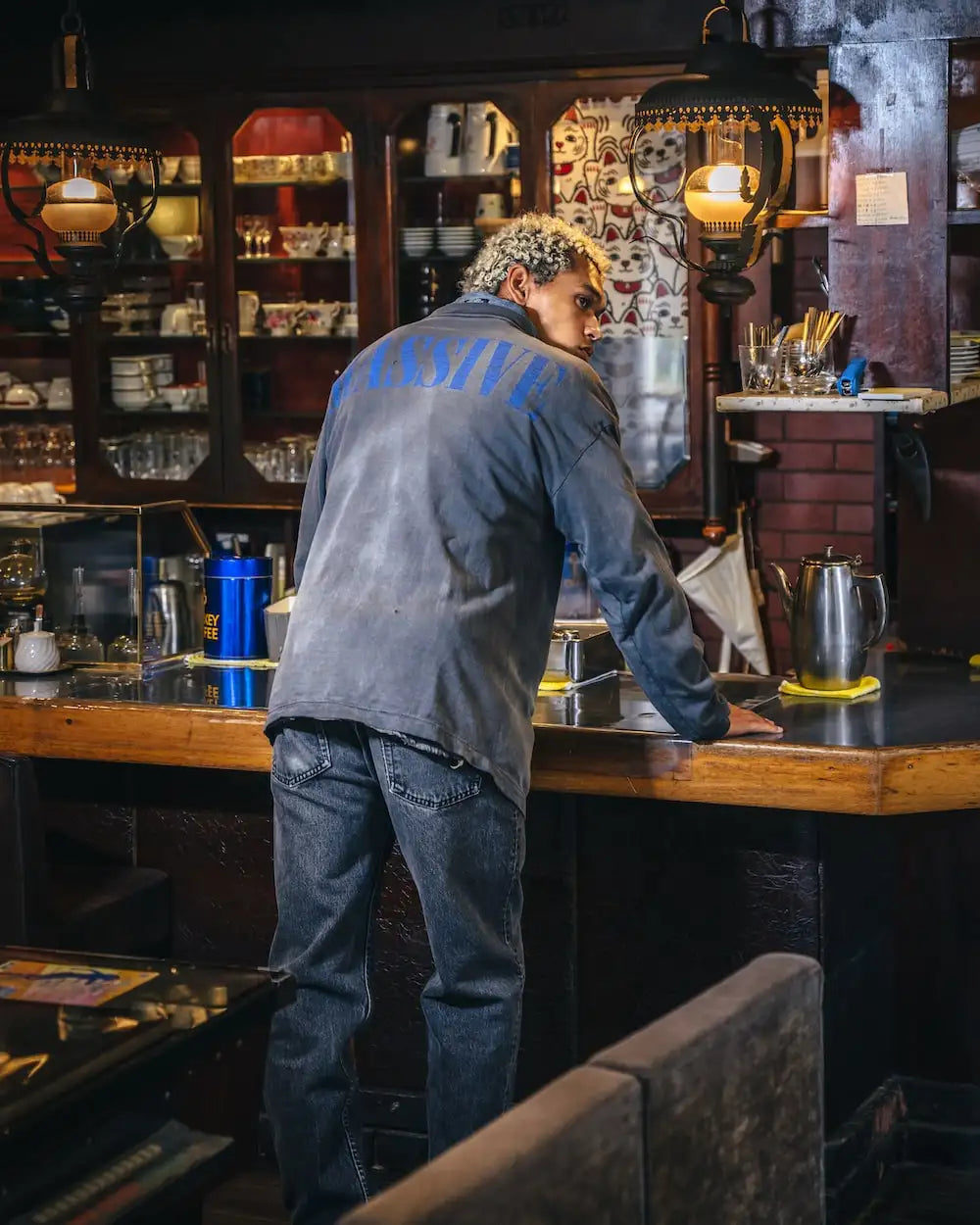 In order to express a real vintage look, the body is sulfide-dyed and stone-washed.